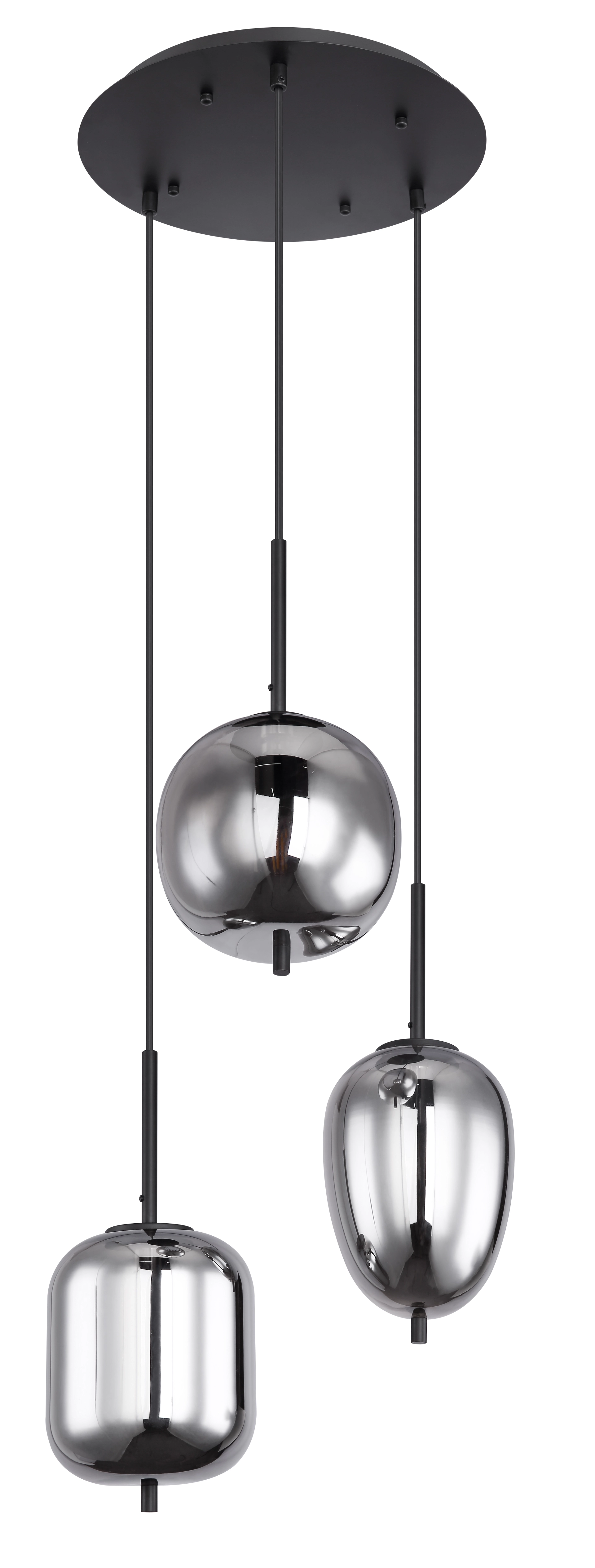 Diese Hängeleuchte BLACKY (Ø 46cm) besteht aus schwarzem Metall mit rauchfärbigen Gläsern. Die drei hängenden Gläser sind in ihrer Aufmachung und Größe individuell. Diese 120cm in den Raum ragende, kunstvolle Lampe verfügt über drei E14 Fassungen(mit max. 40 Watt), die eine freie Leuchtmittelwahl ermöglichen. Aufgrund ihrer Langlebigkeit und Stromersparnis empfehlen wir LED Leuchtmittel. Diese Pendelleuchte eignet sich hervorragend für Ihren Wohn- und Essbereich.
