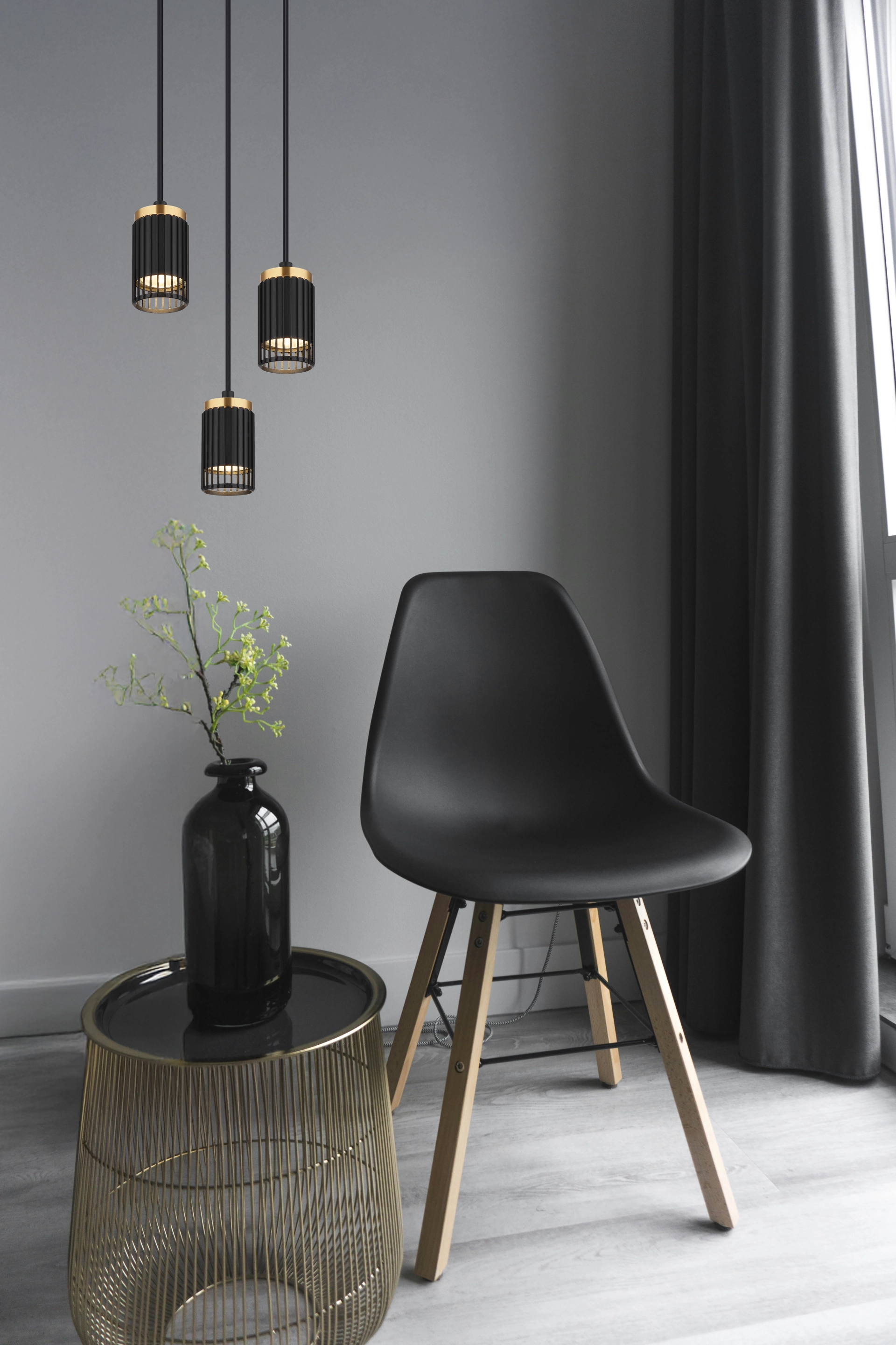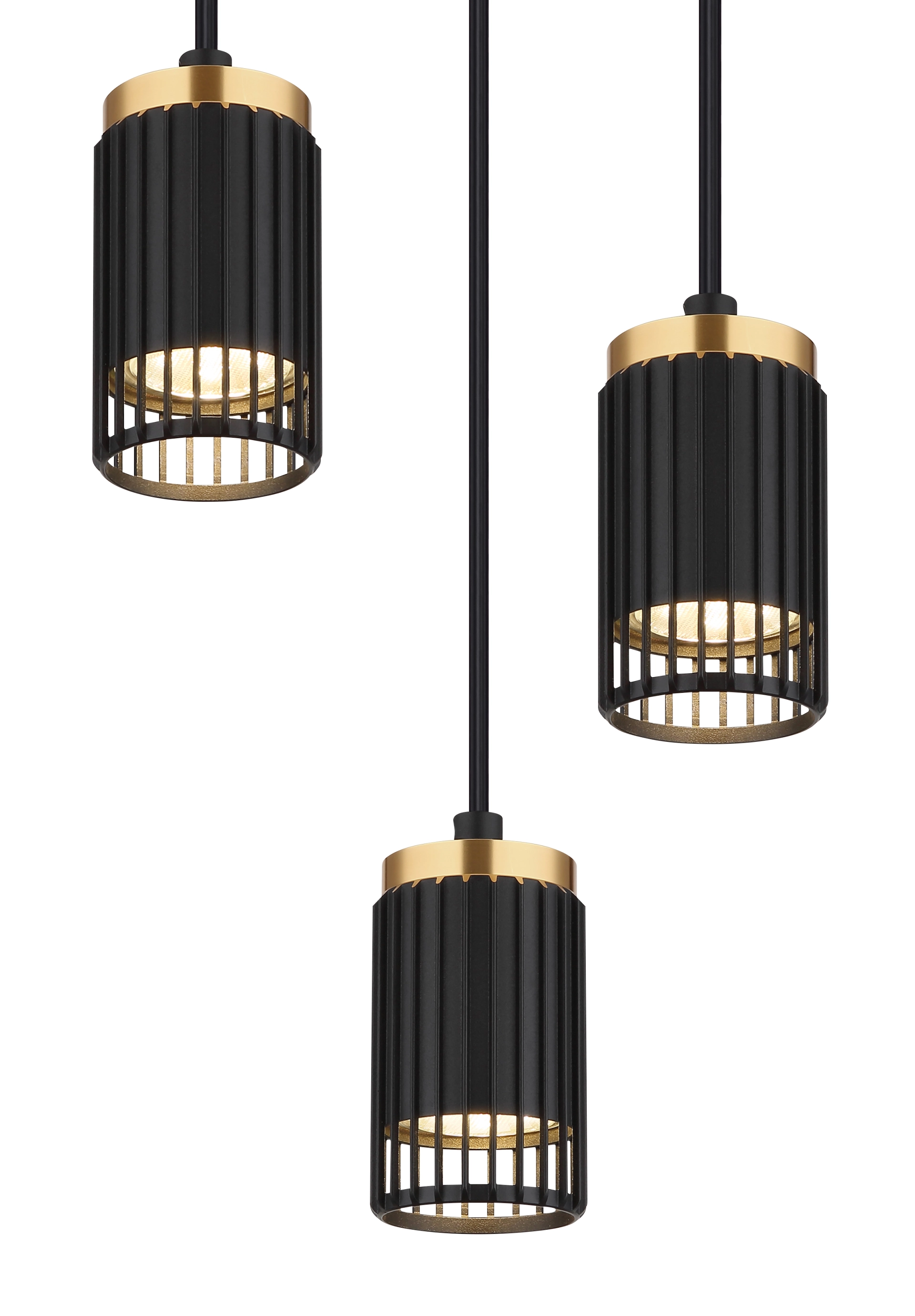 The KORBEN pendant lamp combines modern design with stylish functionality and is an excellent choice for any room. With its round design and three cylindrical shades that are open at the front, this lamp not only offers effective light distribution, but also sets impressive accents in your interior. The matt black metal body gives the lamp an elegant and timeless look, while the matt aluminium shades in black and gold-coloured finish create an attractive contrast. Ideal for the use of GU10 bulbs, the KORBEN pendant lamp allows for versatile lighting options, making it perfect for dining rooms, kitchens or modern living rooms. Whether as a main light source or decorative element, this luminaire creates a warm and inviting atmosphere. Enrich your home with the KORBEN pendant lamp and add a touch of elegance and style to your space.