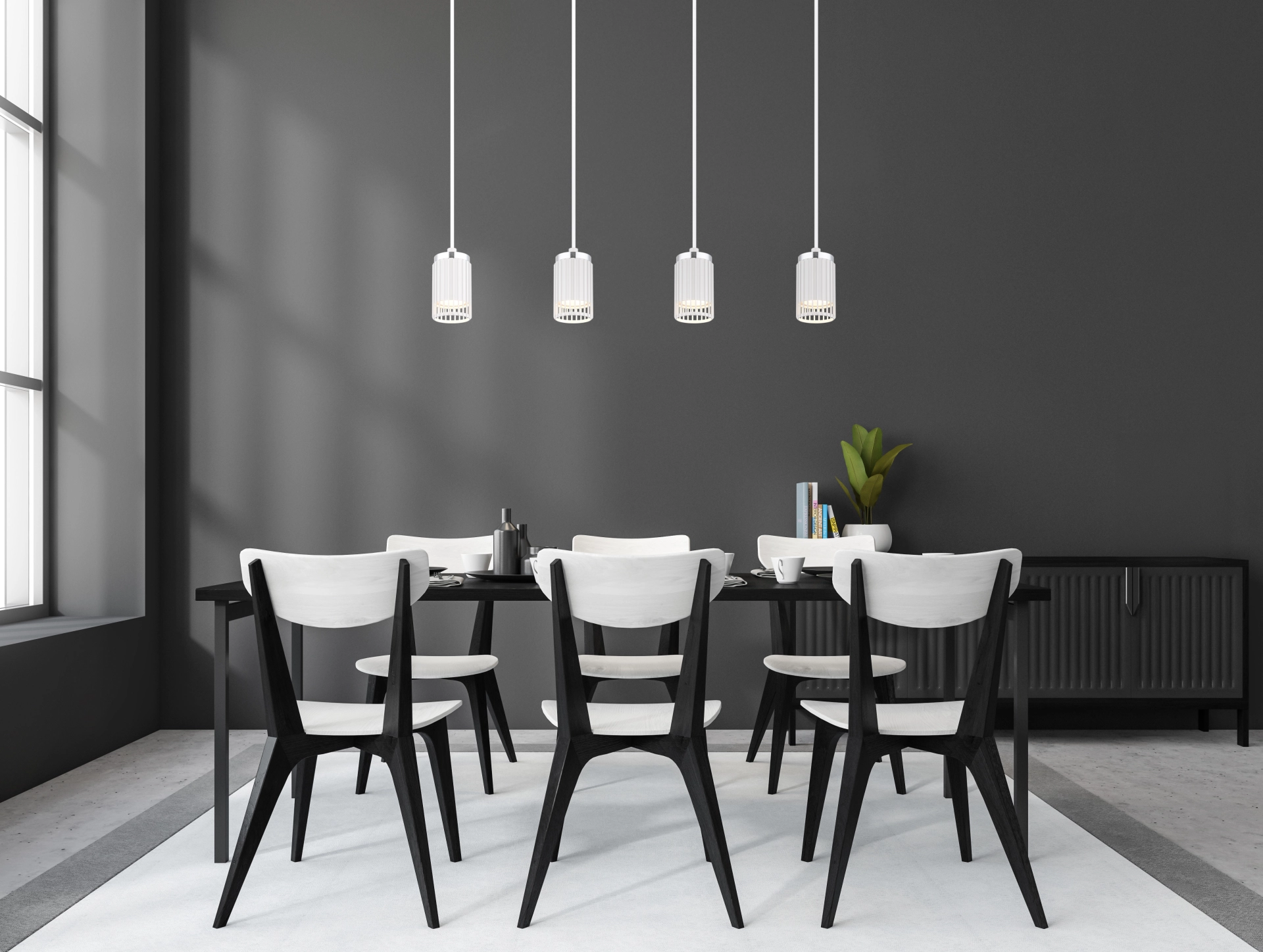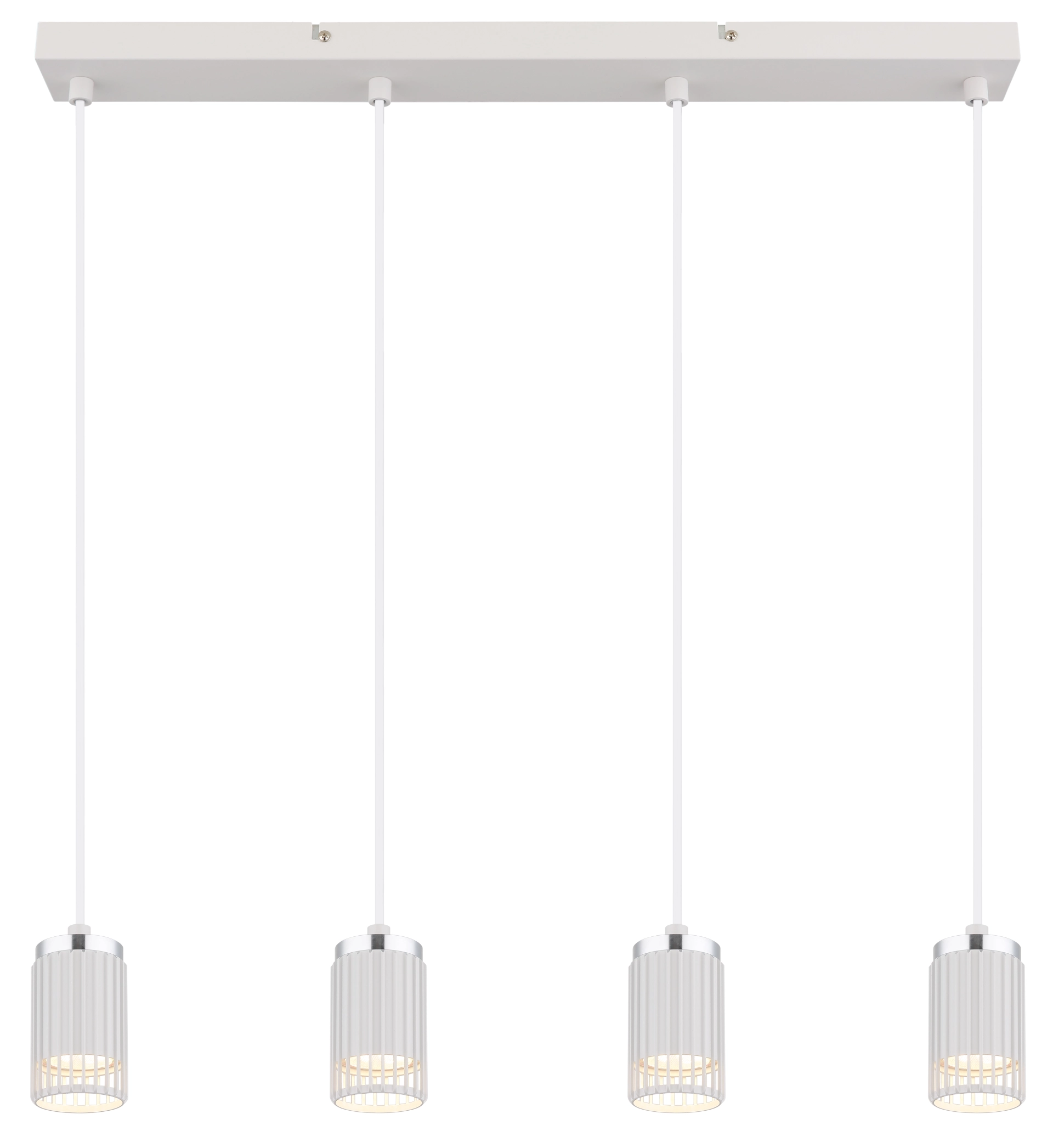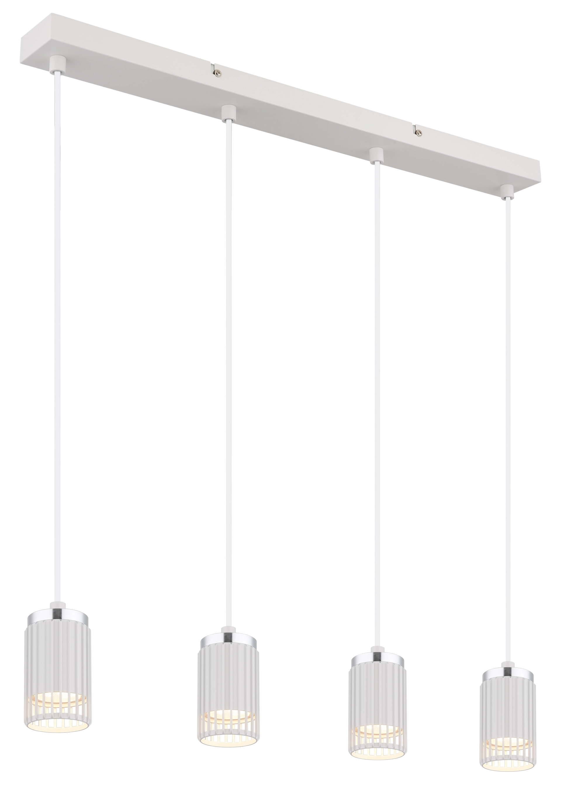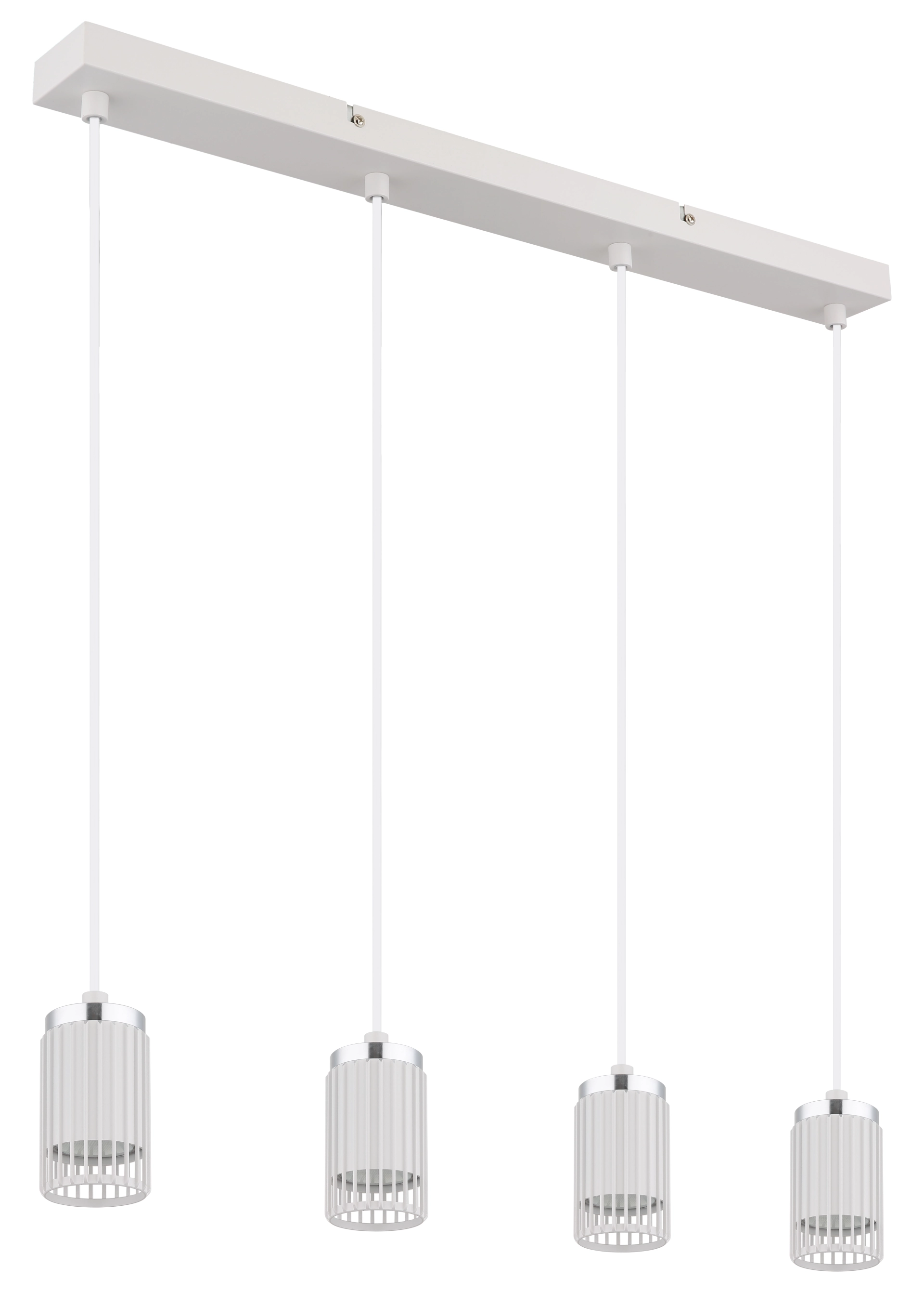 With its clear design, the KORBEN pendant lamp sets modern accents in every room. The rectangular lamp is characterised by its four cylindrical shades, which are finished in elegant matt white and are mounted on rods. The shades are open at the front and are made of high-quality aluminium, which is convincing in both matt white and chrome-plated versions. With its compact dimensions of 600 mm in length and 60 mm in width, the KORBEN fits perfectly over dining tables or kitchen islands. The pendant lamp is designed for 4 GU10 spotlights, which provide excellent light output. The combination of the white, matt metal body and the elegant aluminium shades gives the lamp a modern and at the same time timeless design. The KORBEN pendant lamp not only offers functional lighting, but also a stylish eye-catcher for your home.