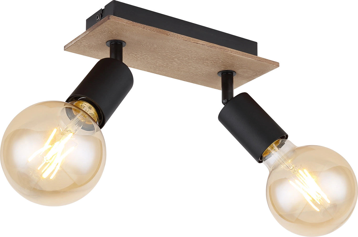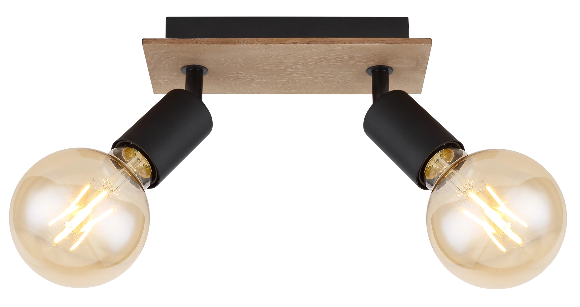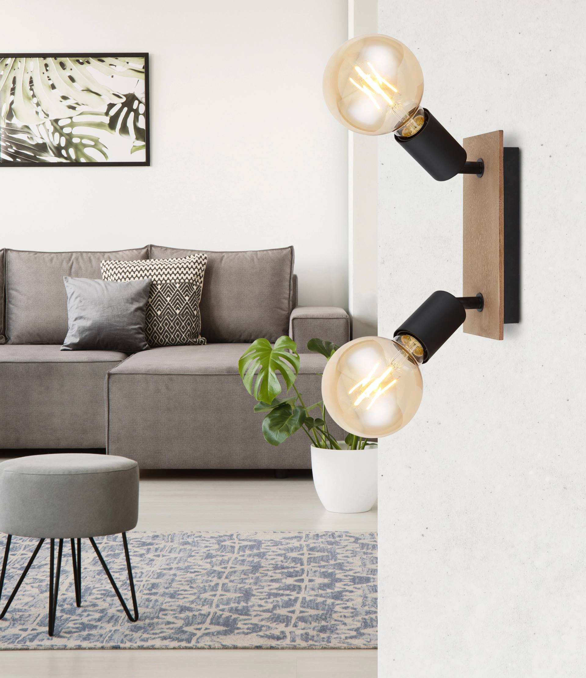 This twin spotlight from the Martha series (21x9 cm) is an elegant addition to your interiors. It consists of a brown wooden panel to which two swivelling E27 sockets coated in black metal are fixed. You can equip them with suitable bulbs of your choice, which enables you to determine the light color and brightness according to your ideas. With other models of the same series you can complete the overall picture in your four walls.