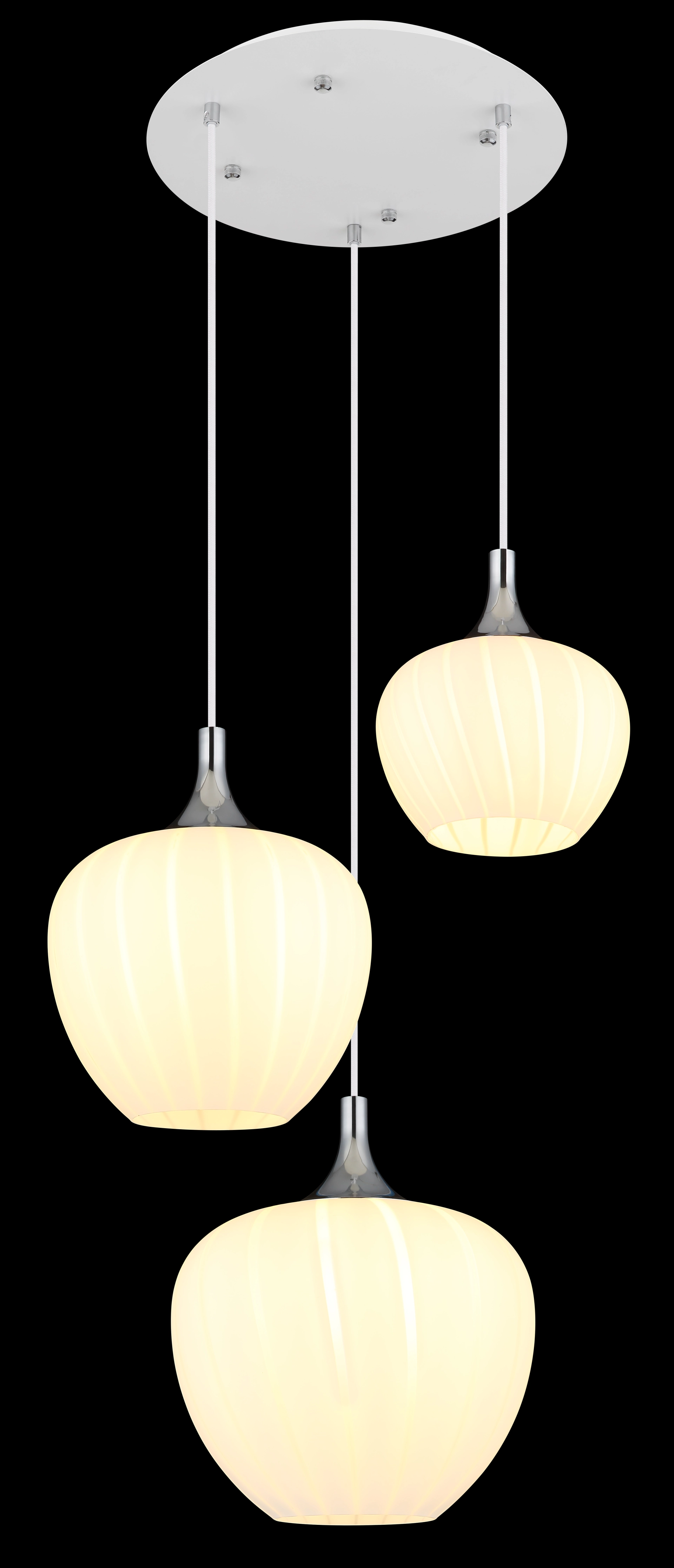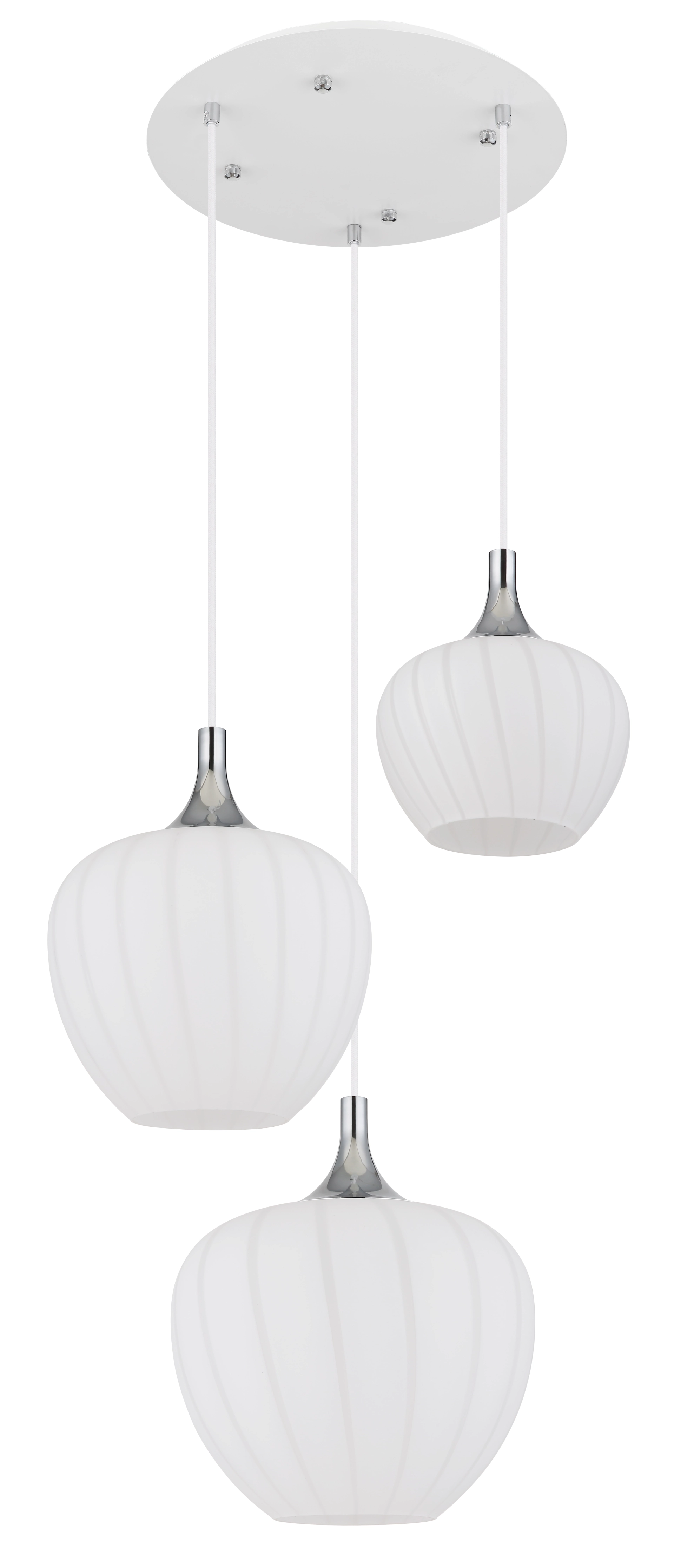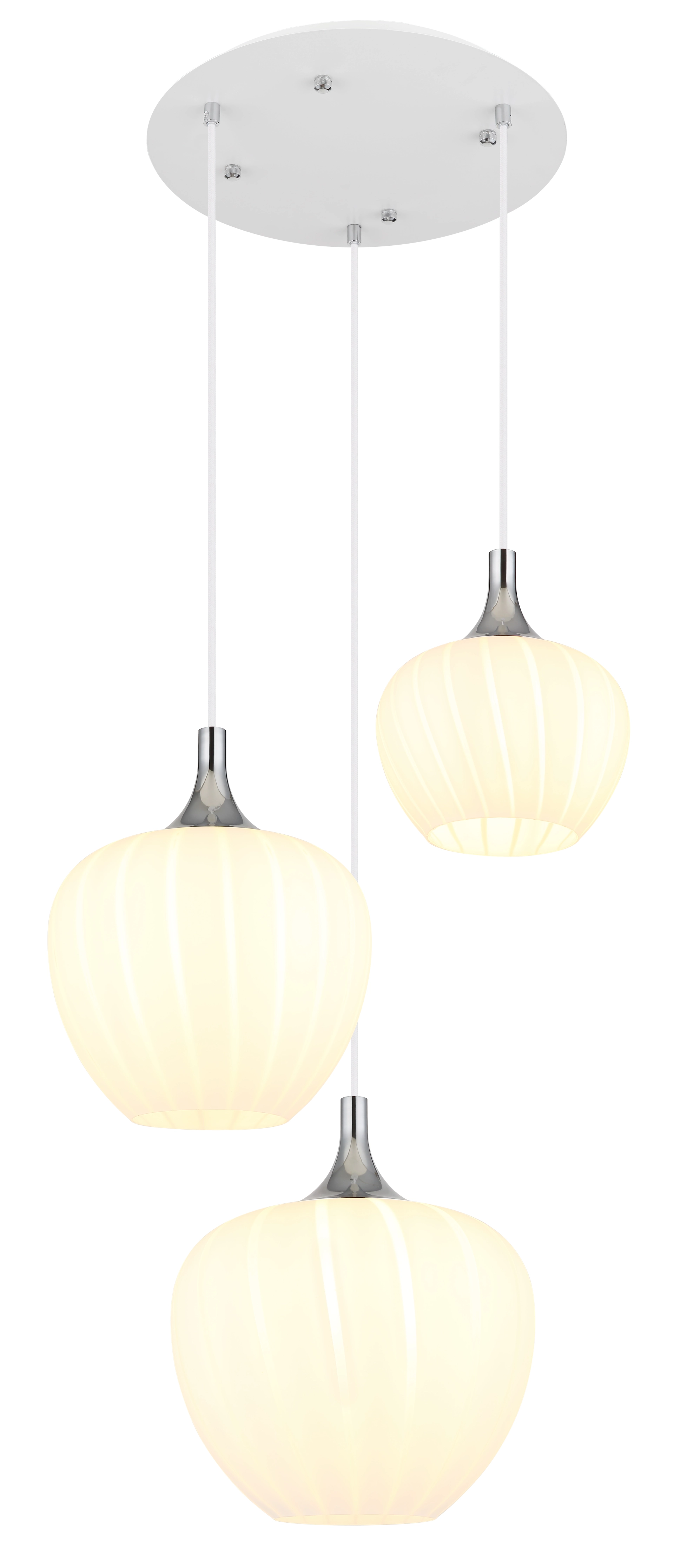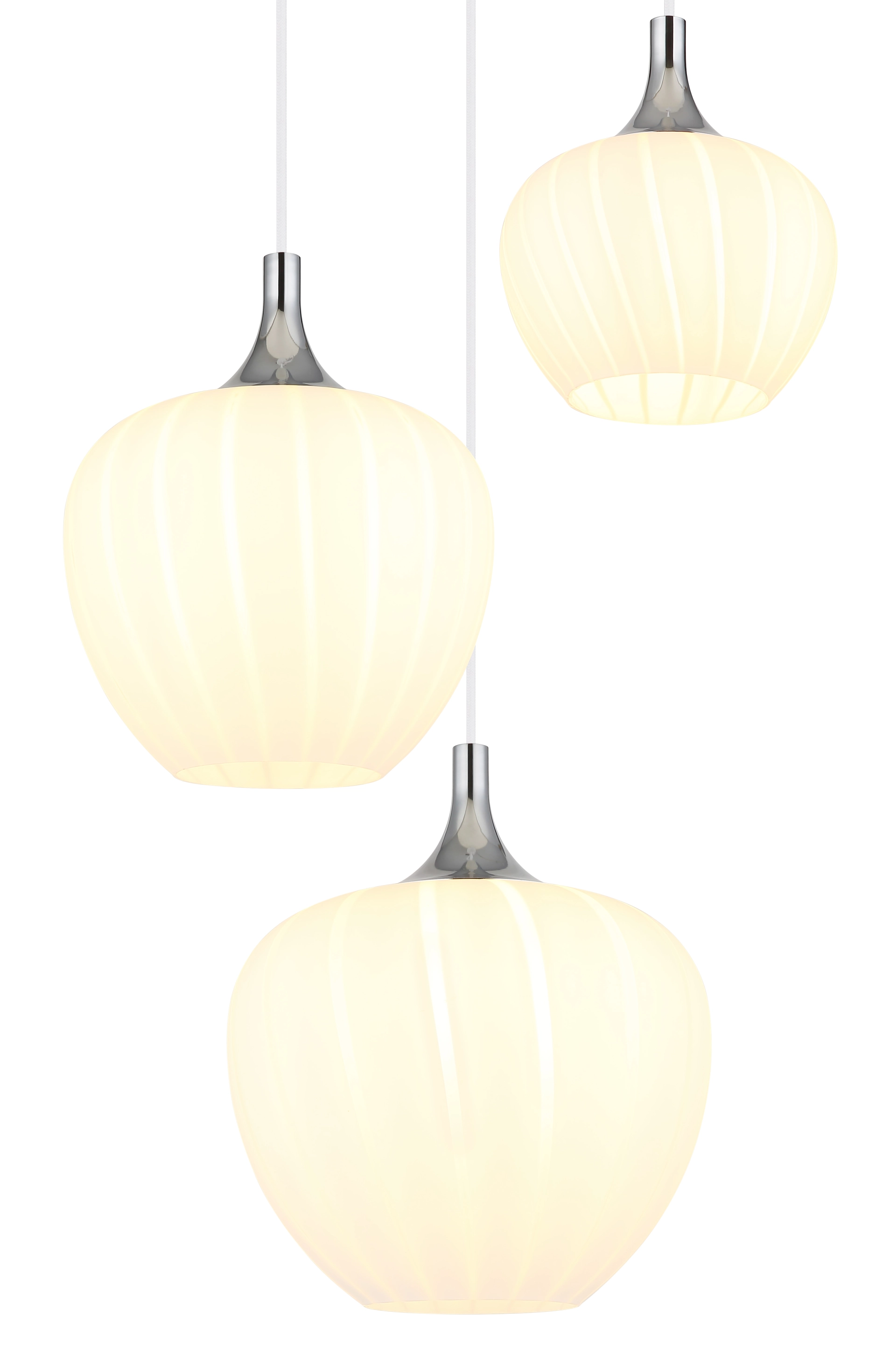 The MAXY pendant lamp is a true queen of lighting, which stands out due to its round shape and three hanging arms. The arms carry bulbous lenses with grooves that run in an elegant curve along the rail. The body is made of white matt metal and chrome-plated parts, while the umbrella cover is made of opal, satin-finished glass. The lenses themselves have decorative grooves, which gives them a special look. The MAXY pendant lamp can be hung at any height in your home, which gives you the opportunity to regulate the optimal light beam. With its energy-saving technology and elegant design, it is a real feast for the eyes. It is perfect for modern living spaces, offices and other rooms where you need elegant and functional lighting.