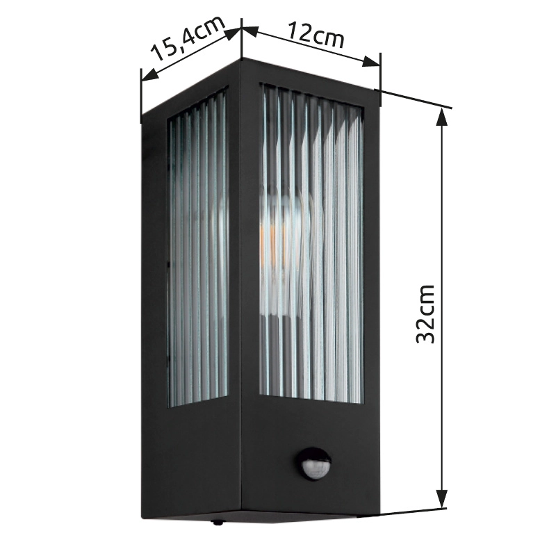 Diese moderne Außenleuchte überzeugt durch Ihr schönes Design aus Glas und Metall. Die Leuchte in Schwarz besteht aus einem rechteckigen Metallkäfig (12x32cm) und einer schönen Glaswand mit Verzierungen an jeder Seite. Die E27 Fassung ermöglicht Ihnen Lichtfarbe und Helligkeit bis zu einer maximalen Leitung von 60 Watt, selbst zu bestimmen. Ein weiteres Highlight dieser Leuchte ist der integrierte Sensor, dieser reagiert bei einer Reichweite von 4-8 m und 110°. Der Schutzgrad IP44 gegen Spritzwasser sorgt das Anbringen der Leuchte im Außenbereich.