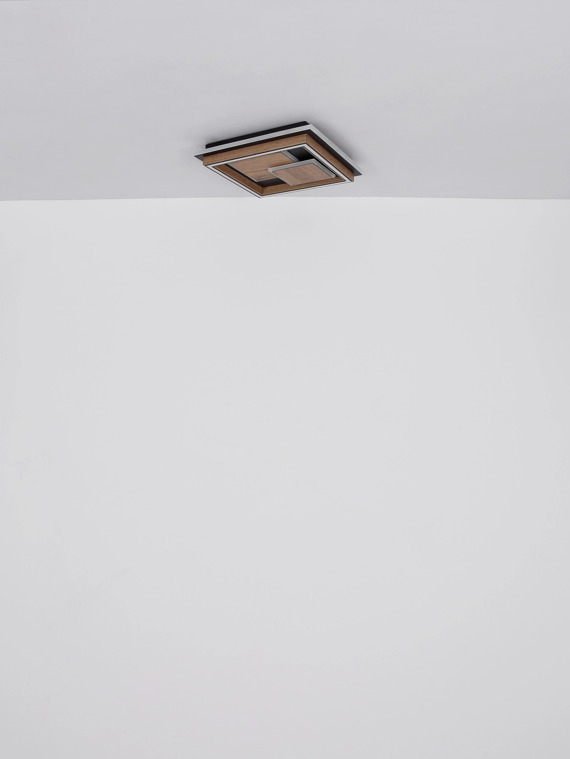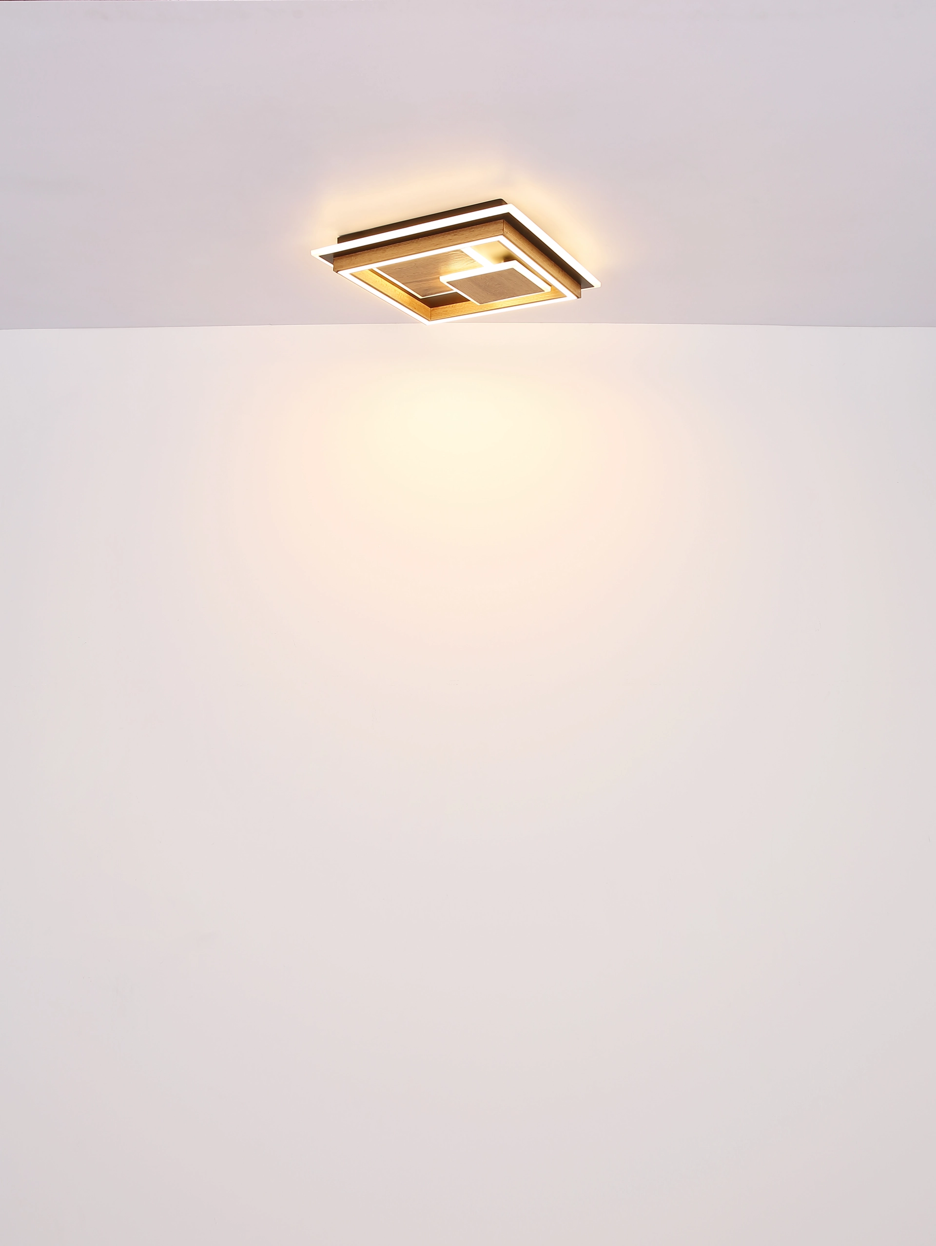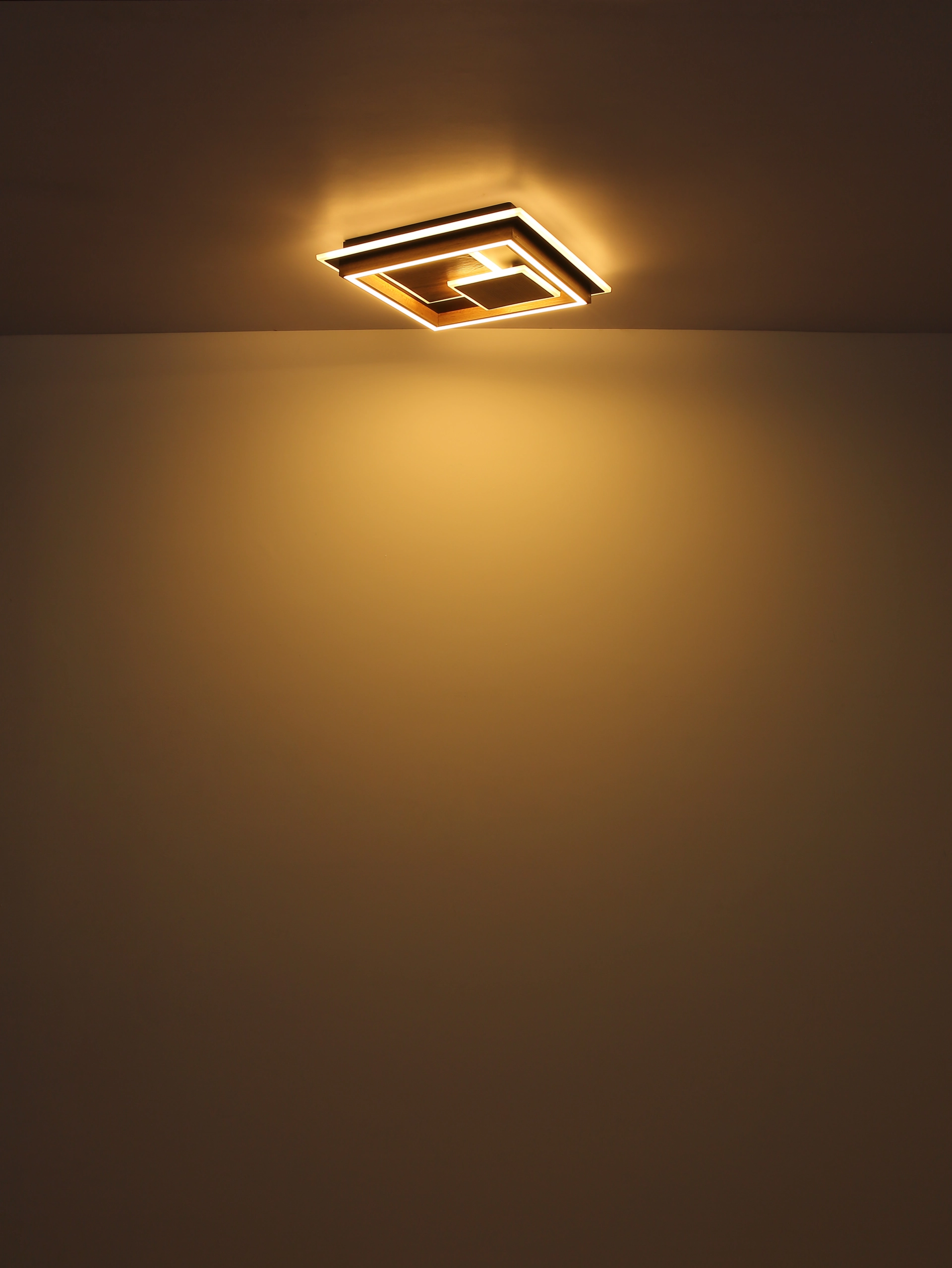 Die rechteckige Deckenleuchte beeindruckt mit ihrem modernen Design und raffiniertem Tunneleffekt. Auf einem weißen Metallschild mit matter Oberfläche sind zwei leicht versetzte Quadrate aufgesetzt, die dem Leuchtenkörper Tiefe und Dynamik verleihen. Durch die Kombination aus kaffeefarbenem, mattem Kunststoff, opalem Kunststoff und einer verspiegelt wirkenden 3D-Fläche entsteht ein faszinierender Lichteffekt, der an einen leuchtenden Tunnel erinnert. Der opale Diffusor sorgt für eine gleichmäßige, blendfreie Lichtverteilung. Die integrierte LED-Lichtquelle (inklusive) bietet einen warmweißen Lichtfarbton von 3000 K und sorgt mit ihrem Lumen Output für eine angenehme Grundbeleuchtung. Mit ihren kompakten Maßen von 350 mm Länge und 330 mm Breite eignet sich die Leuchte ideal für Flure, Wohnräume oder moderne Büroumgebungen. Die hochwertige Verarbeitung und das außergewöhnliche Design machen diese weiße Deckenleuchte zu einem stilvollen Blickfang für alle, die futuristische Lichtkonzepte lieben.