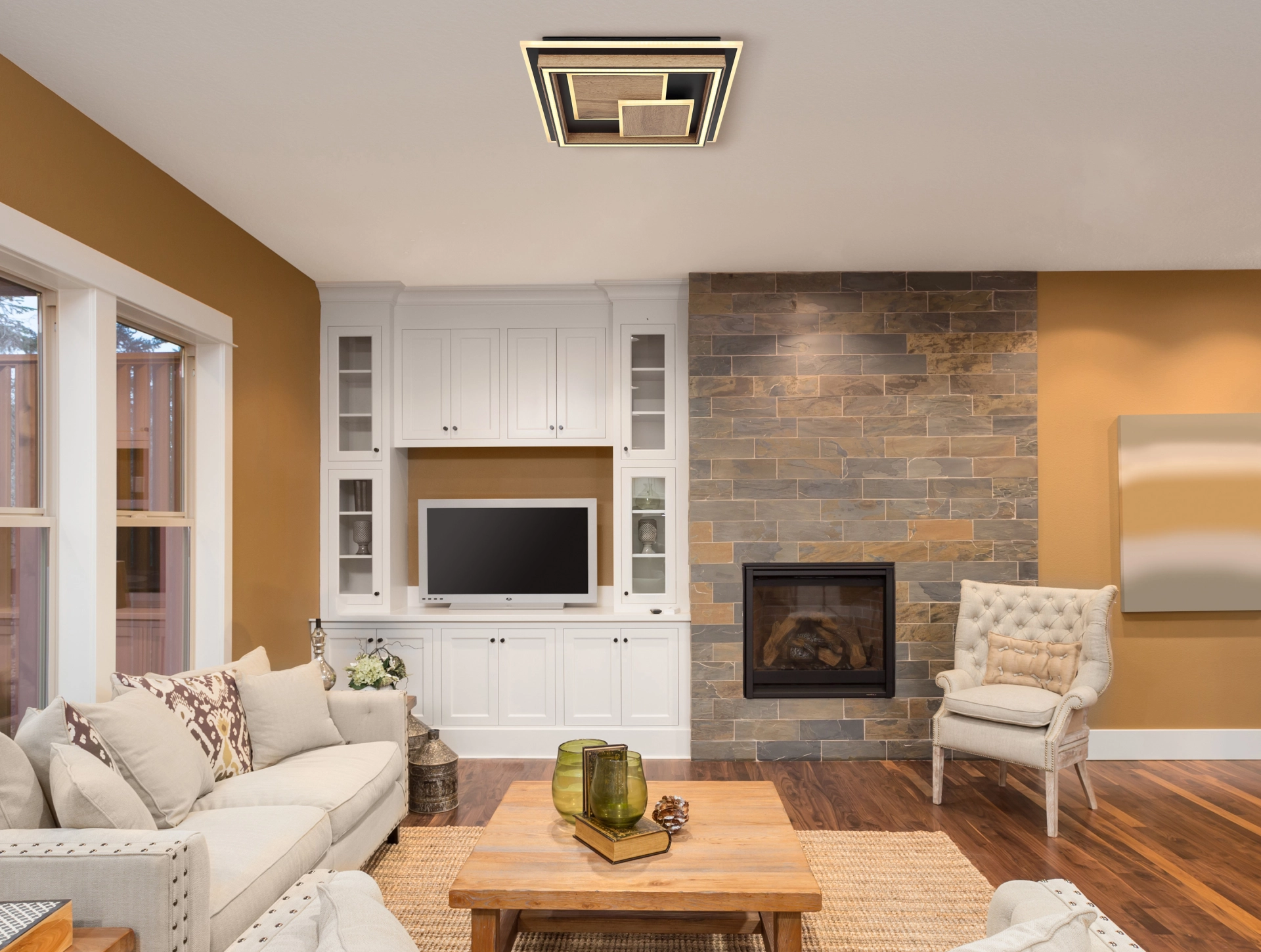 Die Deckenleuchte PIKARA beeindruckt durch ihr markantes, quadratisches Design mit zwei übereinander angeordneten Quadraten. Der Korpus besteht aus einer stilvollen Kombination von Metall in Holzoptik und mattschwarzem Finish, was der Leuchte einen modernen und natürlichen Look verleiht. Der Schirm aus mattem, schwarzem Aluminium und opalem Acryl sorgt für eine angenehme, gleichmäßige Lichtverteilung, während klare Acrylkristalle funkelnde Akzente setzen. Mit ihren Maßen von 378 x 378 mm und einer Helligkeit von 800 Lumen bietet die PIKARA Deckenleuchte sowohl funktionales Licht als auch eine ansprechende Optik. Die warmweiße Lichtfarbe von 3000 K schafft eine gemütliche Atmosphäre, ideal für Wohnzimmer, Schlafzimmer oder Flure. Diese LED-Deckenleuchte vereint modernes Design mit hoher Funktionalität und wird durch ihre hochwertigen Materialien und ihr zeitgemäßes Erscheinungsbild zu einem stilvollen Blickfang in jedem Raum.