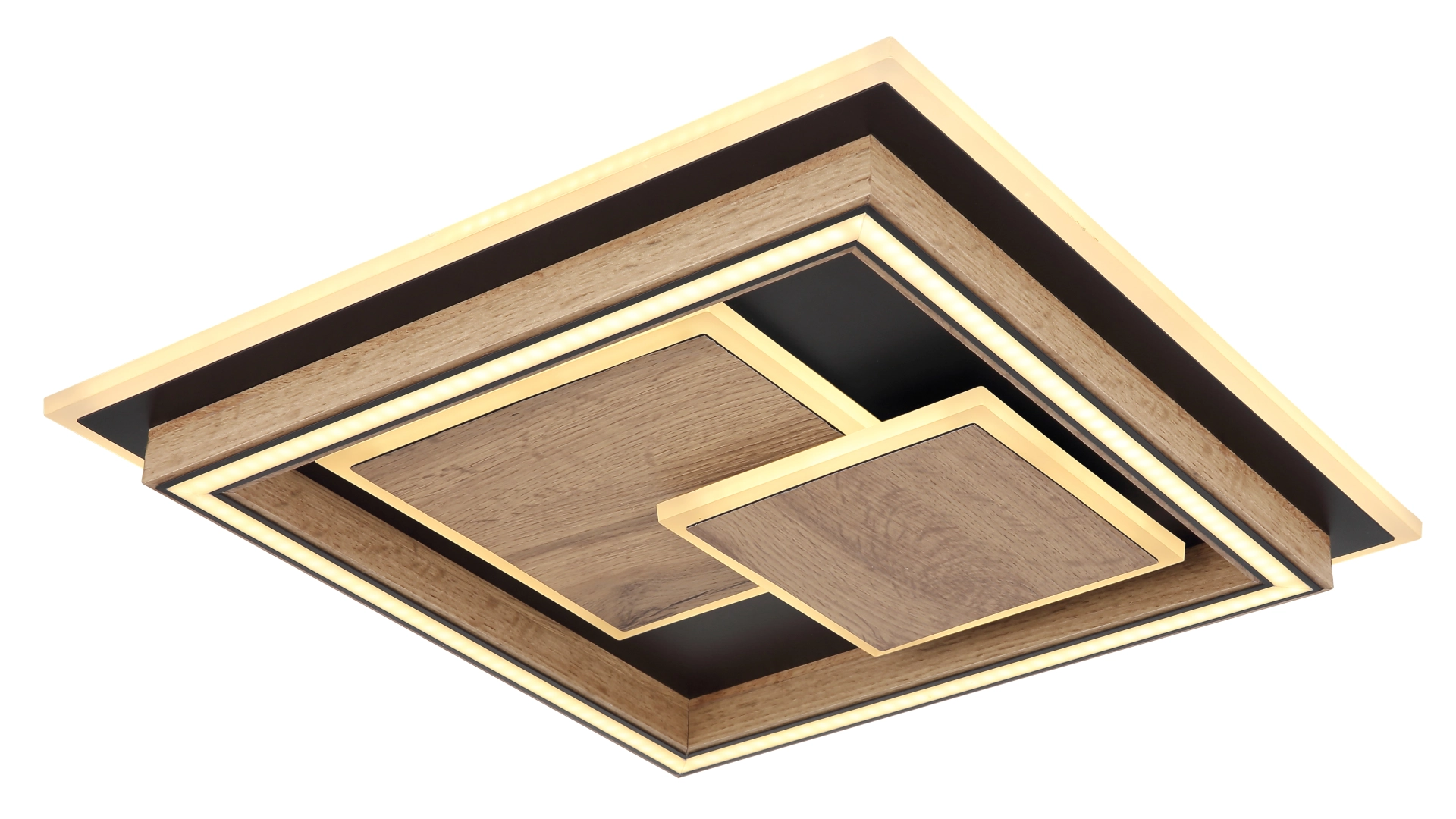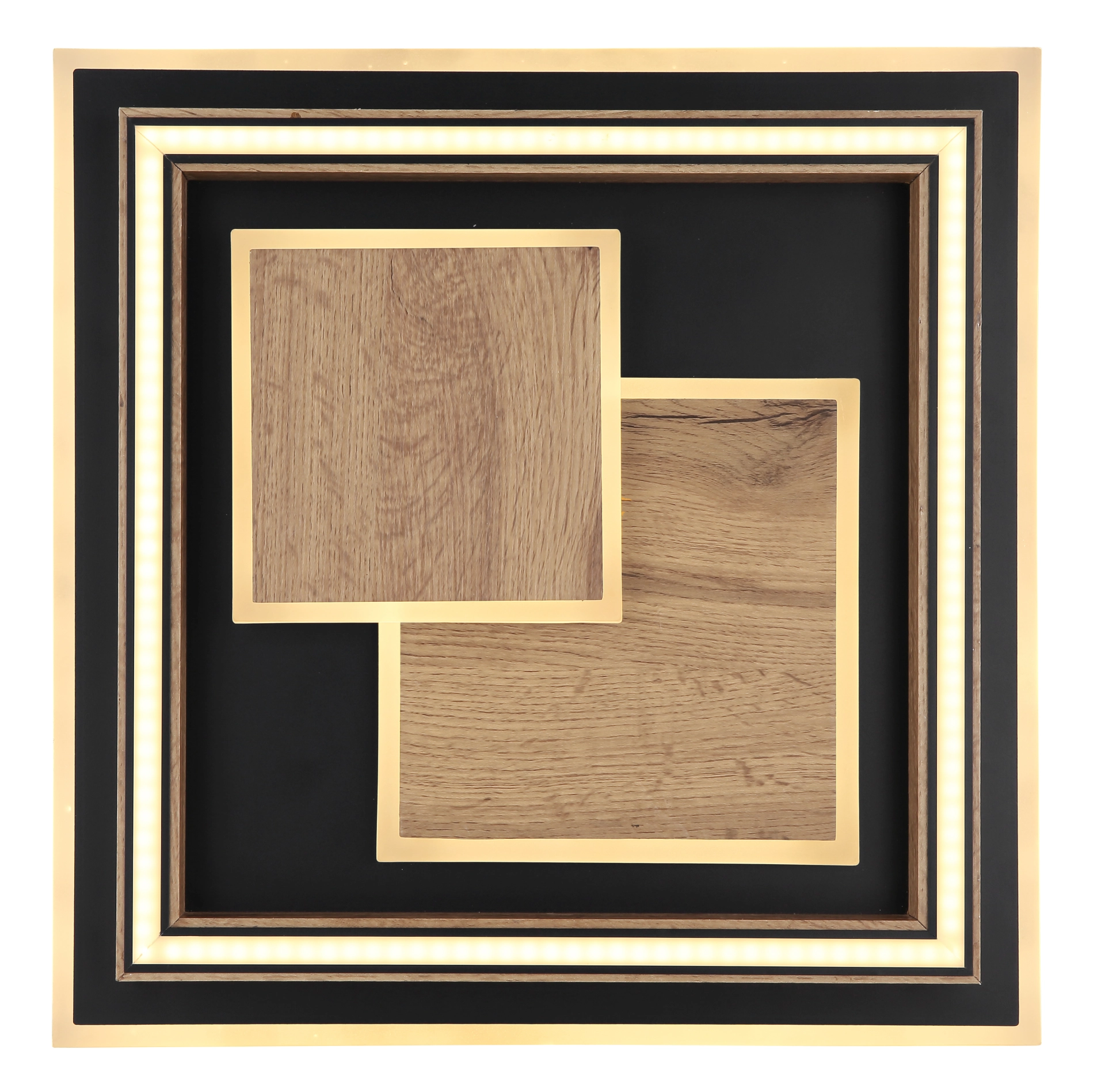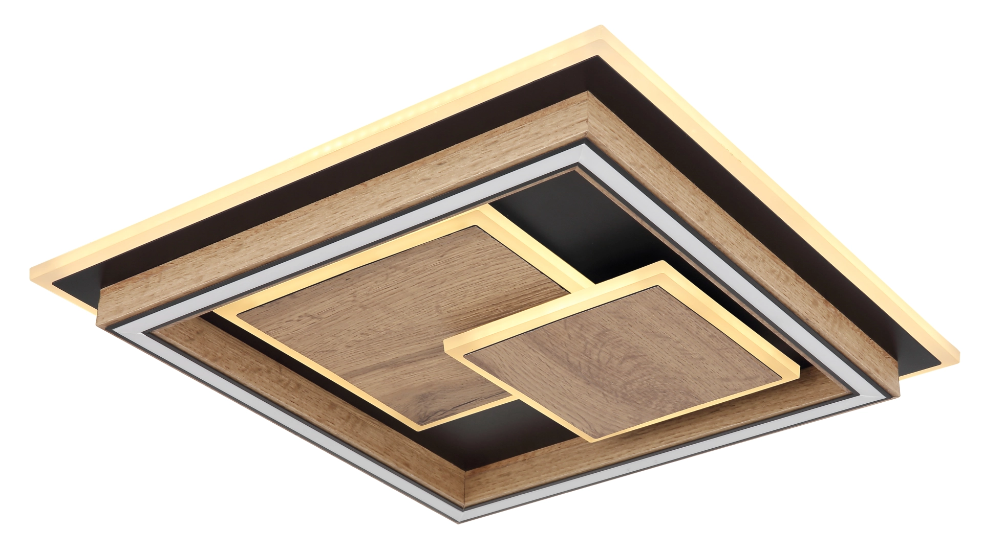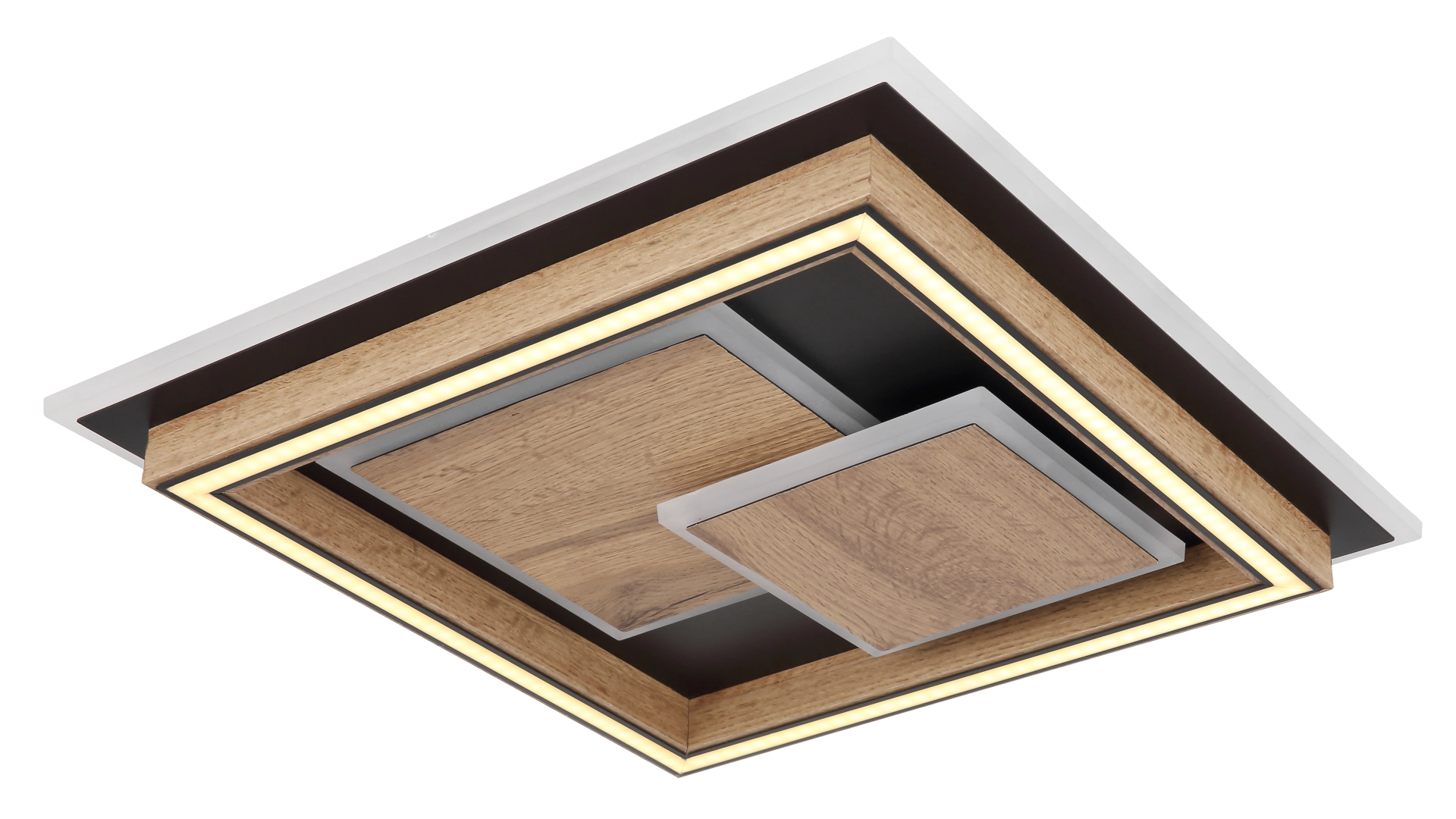 Die moderne quadratische Deckenleuchte in mattem Schwarz ist ein echter Blickfang für Ihre Wohnräume. Der Korpus aus schwarz mattem Metall und MDF in dunkler Holzoptik ist mit mehreren Quadraten aufgesetzt, in denen LEDs eingebettet sind und für eine stimmungsvolle Beleuchtung sorgen. Der Schirm aus Acryl in Opaloptik bietet eine blendfreie Ausleuchtung und trägt zur gemütlichen Atmosphäre im Raum bei. Mit einer Größe von 410mm x 410mm und einer Leistung von 32W und einer Lumen Output von 1600 Lumen bietet diese Deckenleuchte ausreichend Helligkeit für Ihre Räume. Über den Wandschalter können Sie zwischen drei verschiedenen Stufen wählen: 1. nur die inneren LEDs, 2. nur die äußeren LEDs, 3. alle LEDs zusammen. Dank der Memoryfunktion merkt sich die Deckenleuchte die zuletzt gewählte Einstellung. Bringen Sie mit dieser vielseitigen und energieeffizienten Deckenleuchte Ihr Zuhause zum Strahlen.