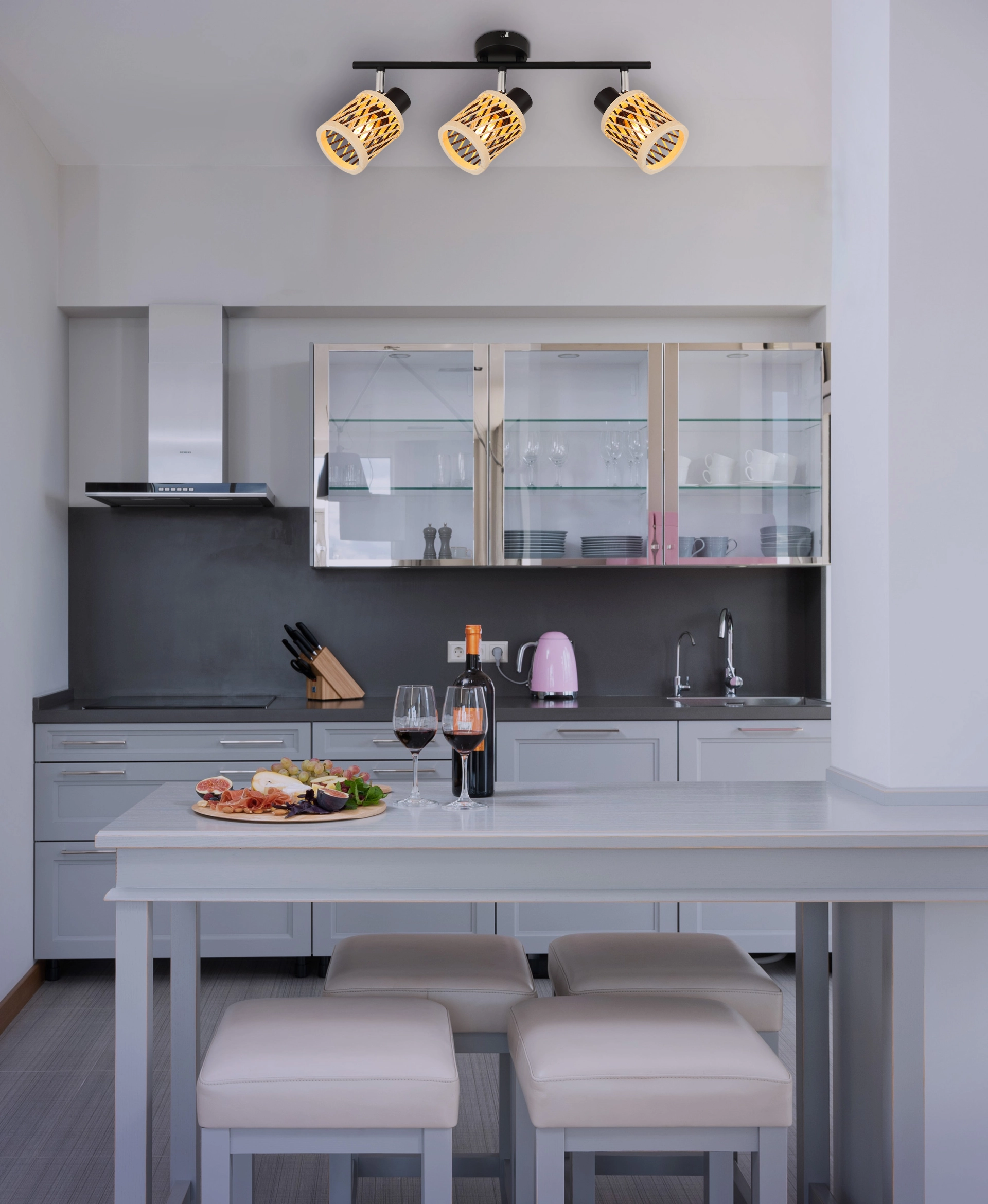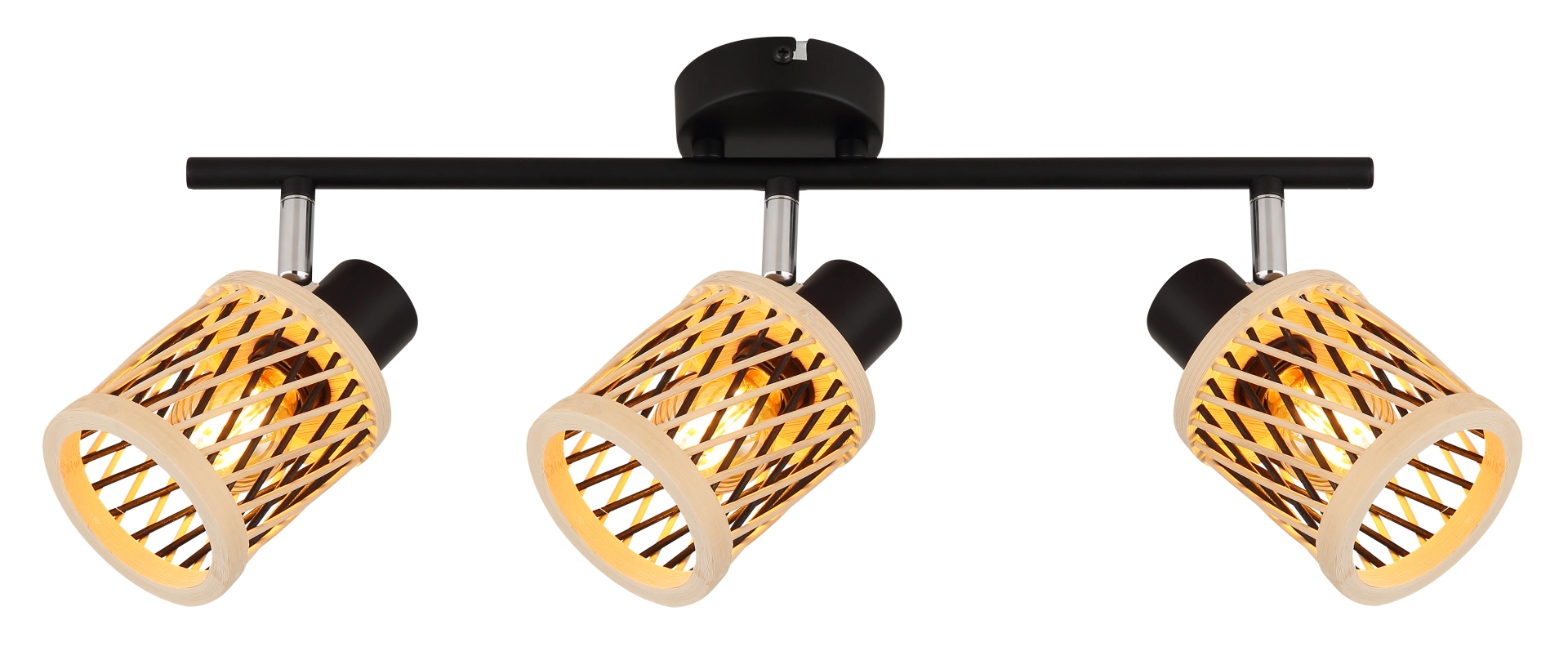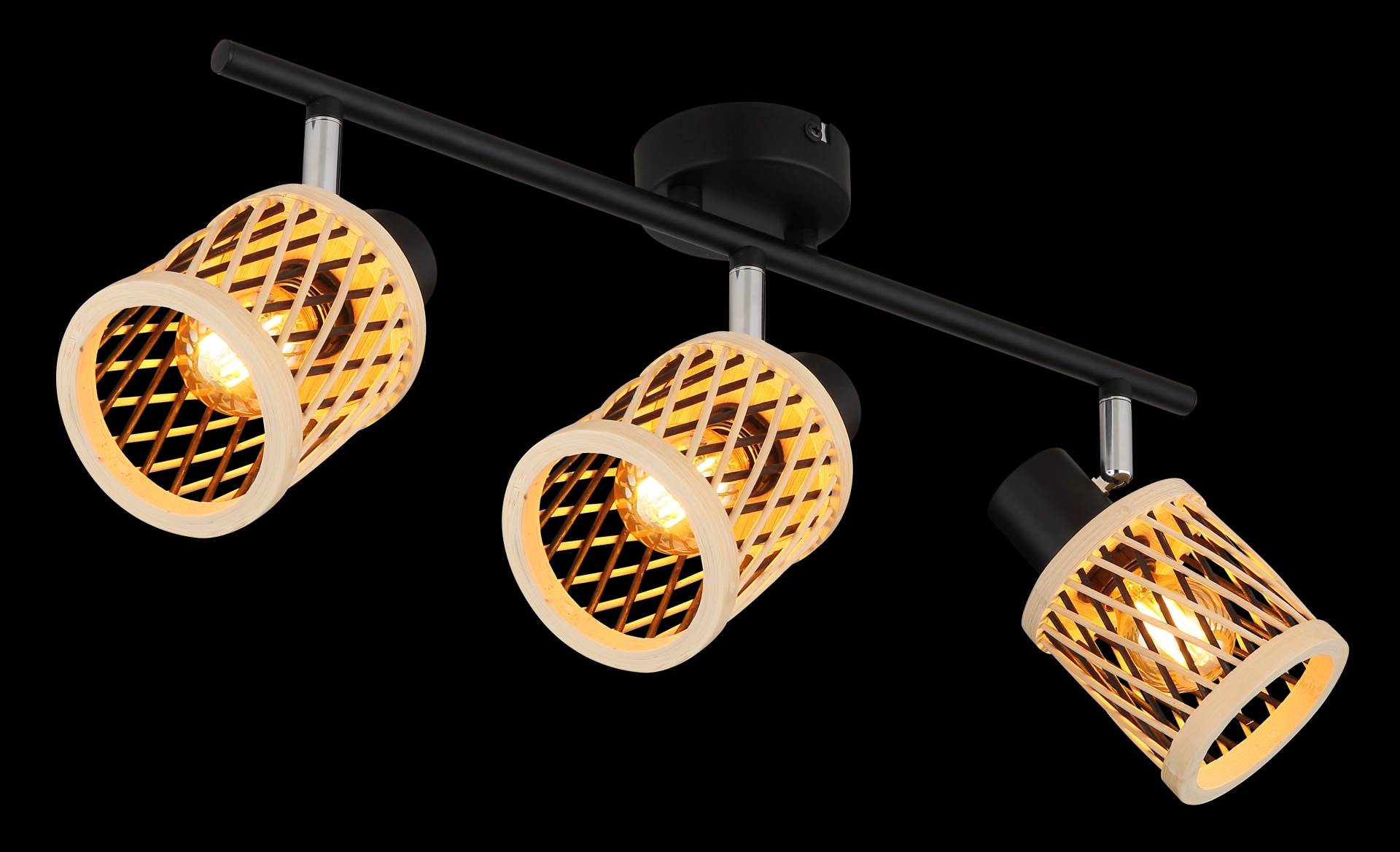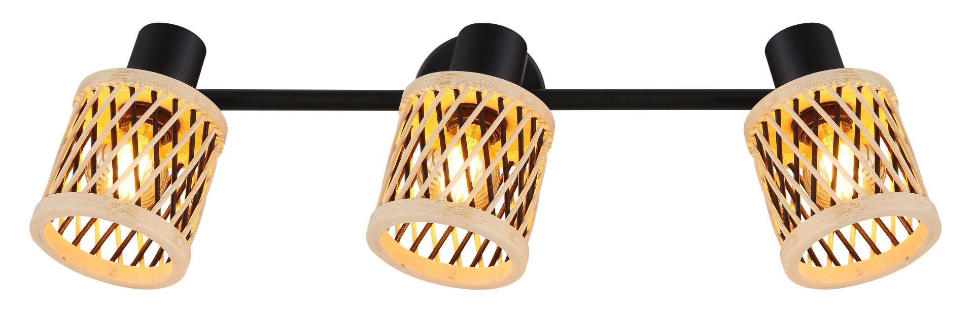 Der Strahler MALI kombiniert Vintage-Design mit natürlichem Flair. Die gerade Schiene aus matt schwarzem Metall trägt Schirme aus naturfarbenem und ... Mehr erfahren Mehr erfahren
