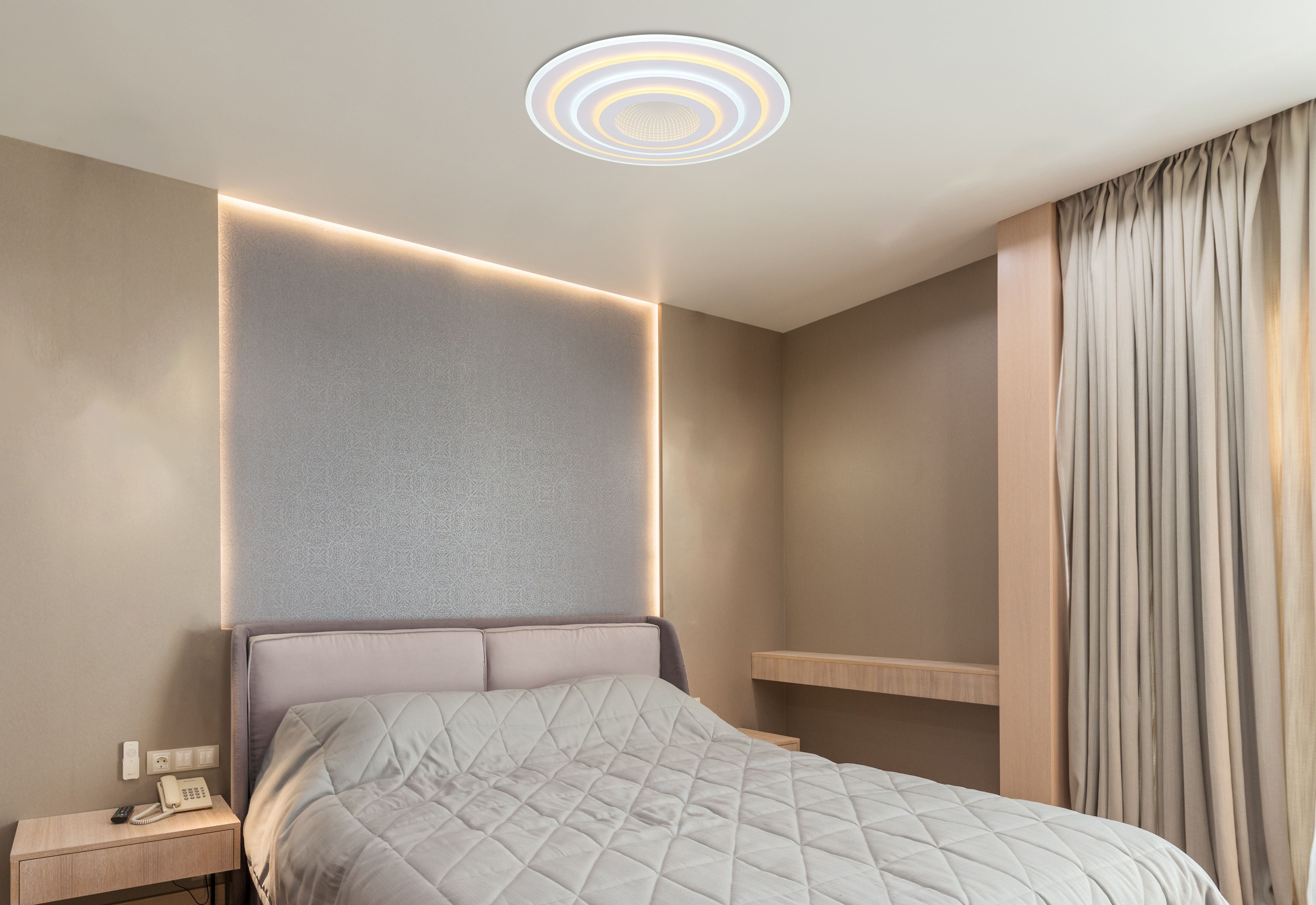 Sehr empfehlenswert für die Grundbeleuchtung im Schlafzimmer ist ein Dimmer mit Fernbedienung. Auf diese Weise kann je nach Tageszeit die passende Stärke des Lichtstroms eingestellt werden. Morgens zum Aufwachen ist helleres Licht sinnvoll, während das Licht abends vor dem Einschlafen nicht zu hell sein sollte, um den Schlafrhythmus nicht zu stören. Als Richtwert empfehlen Experten zwischen 100 und 140 Lumen pro Quadratmeter im Schlafzimmer.
