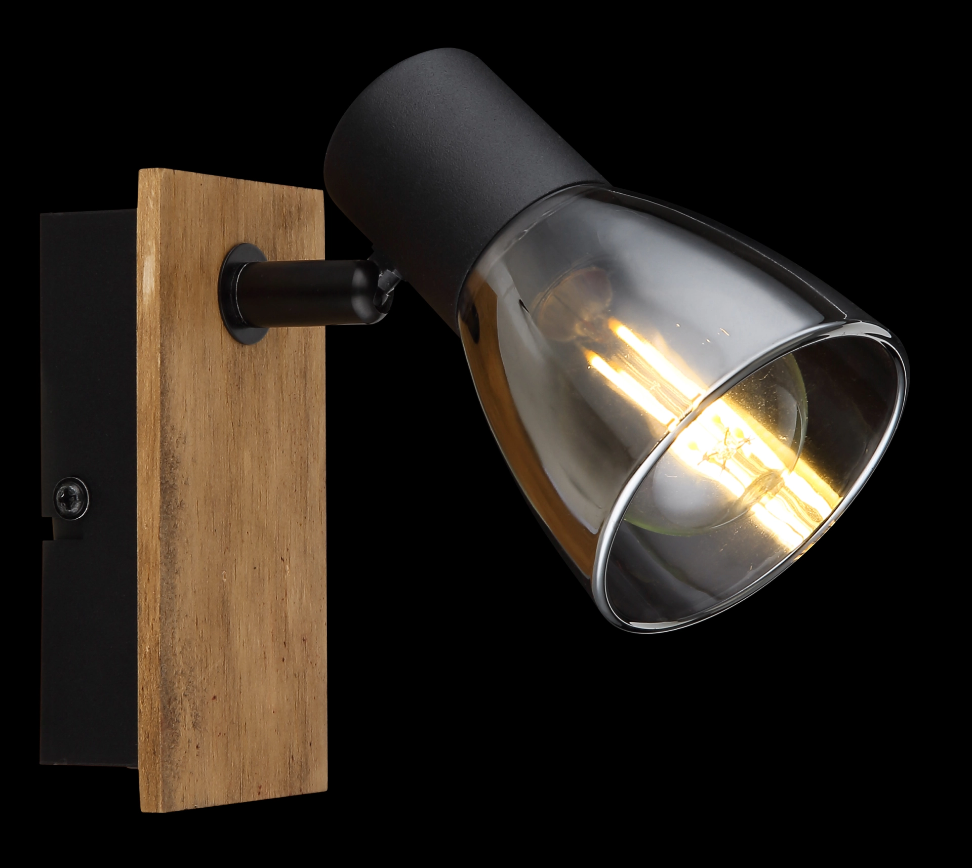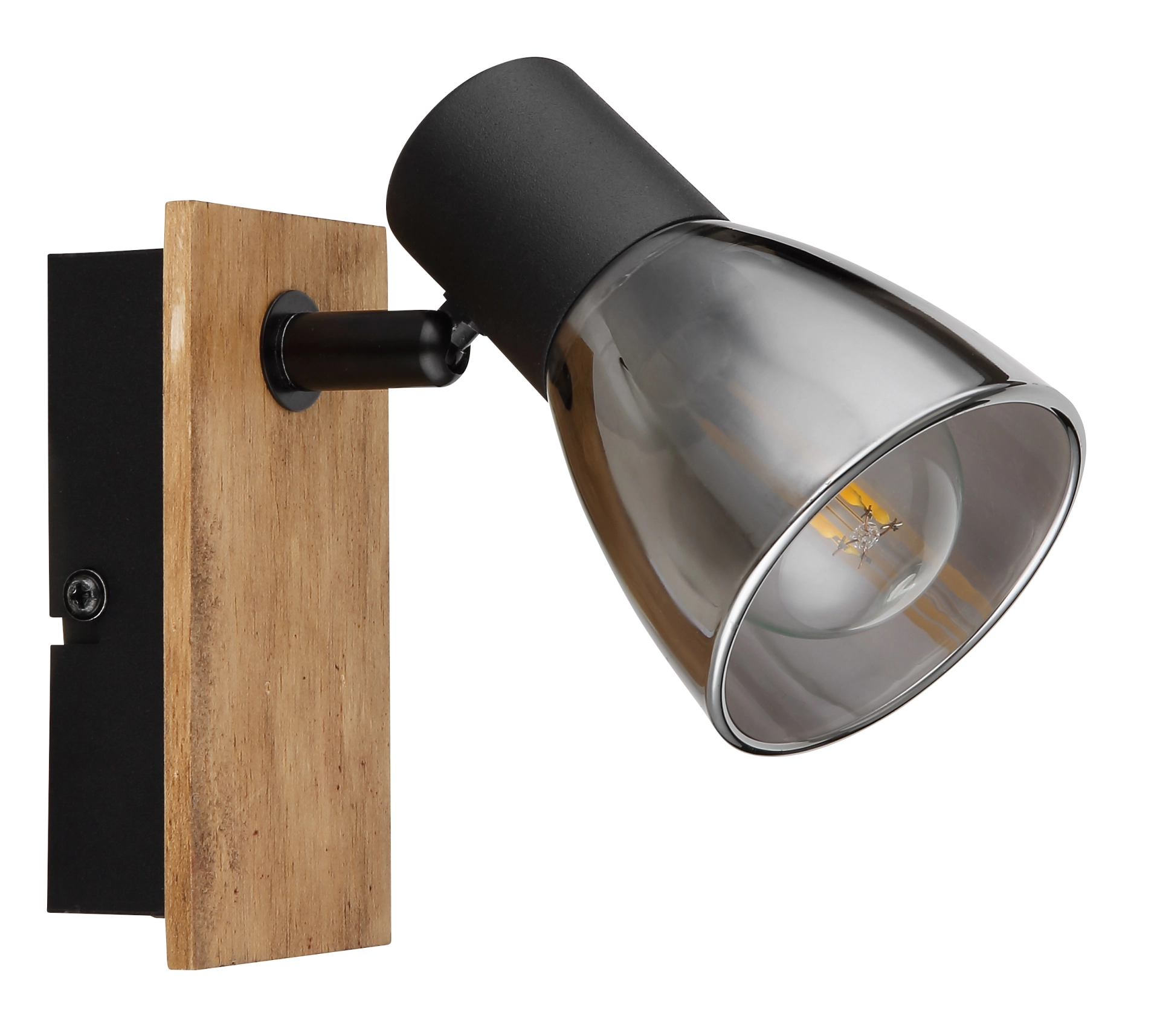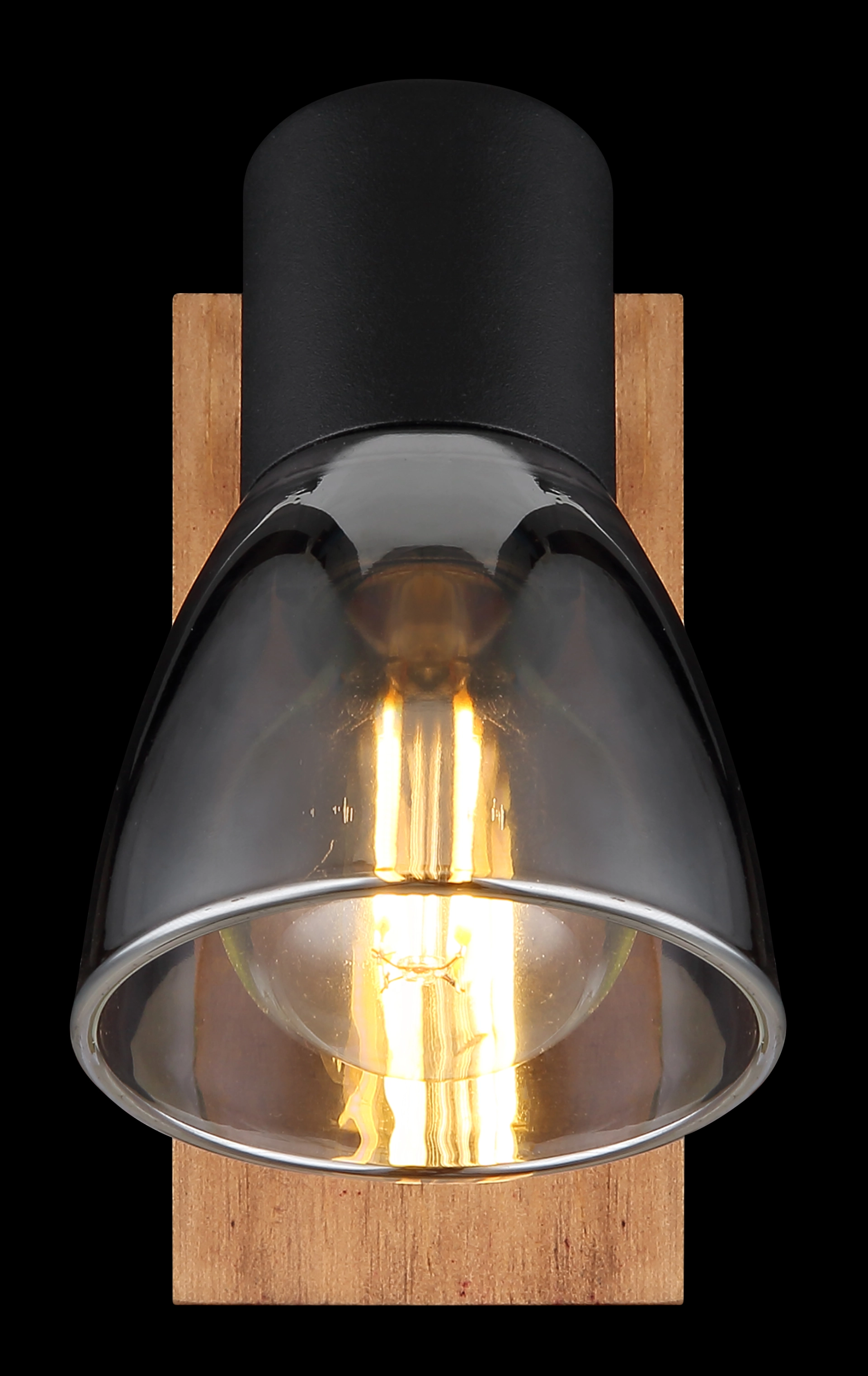 This beautiful spotlight of the Claude series in black metal and wood inspires with great design. On a rectangular wall attachment with wooden decorations (14x7cm) there is an overhang of 15.5cm an E14 socket with a beautiful glass shade in smoke colors (Ø7cm). The luminaire is switched by means of an ON/OFF switch. The E14 socket gives you the opportunity to determine the light color and brightness up to a maximum power of 40 watts. With other models of this series you can complement your living area wonderfully.