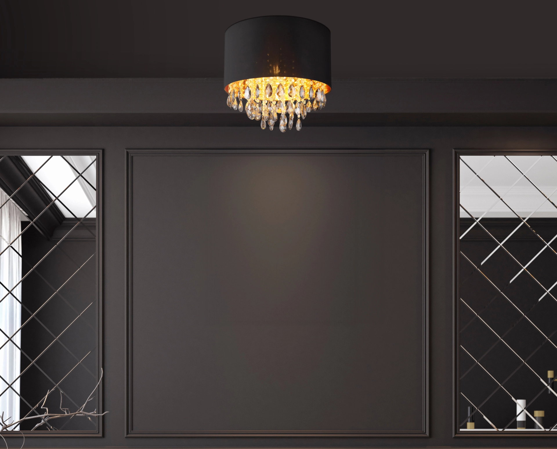 The COLETTA ceiling lamp impresses with a round textile shade and sparkling crystal hanging inside. The black, matt shade and the clear, smoky crystals set luxurious accents in classic living spaces. This luminaire is suitable for an E27 bulb (exclusive).