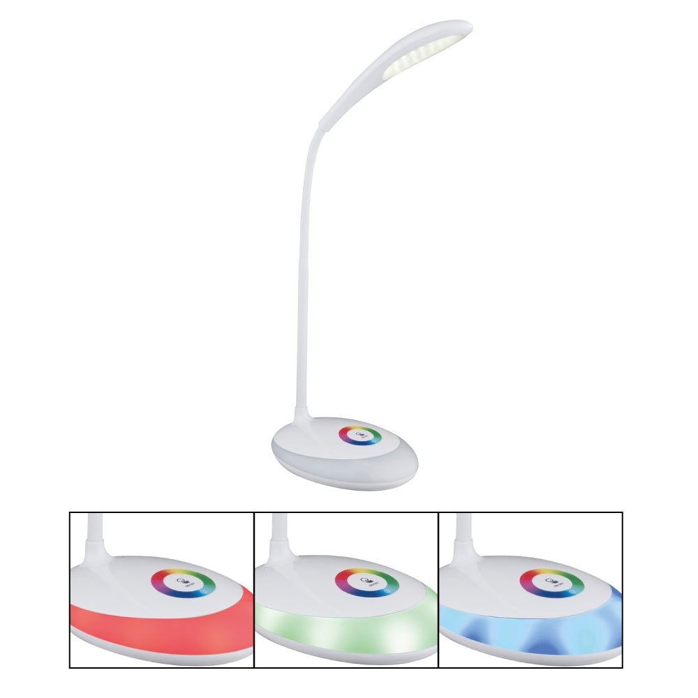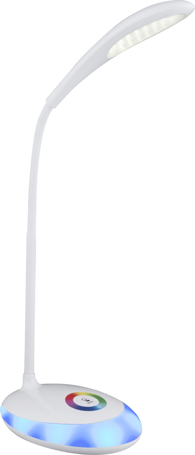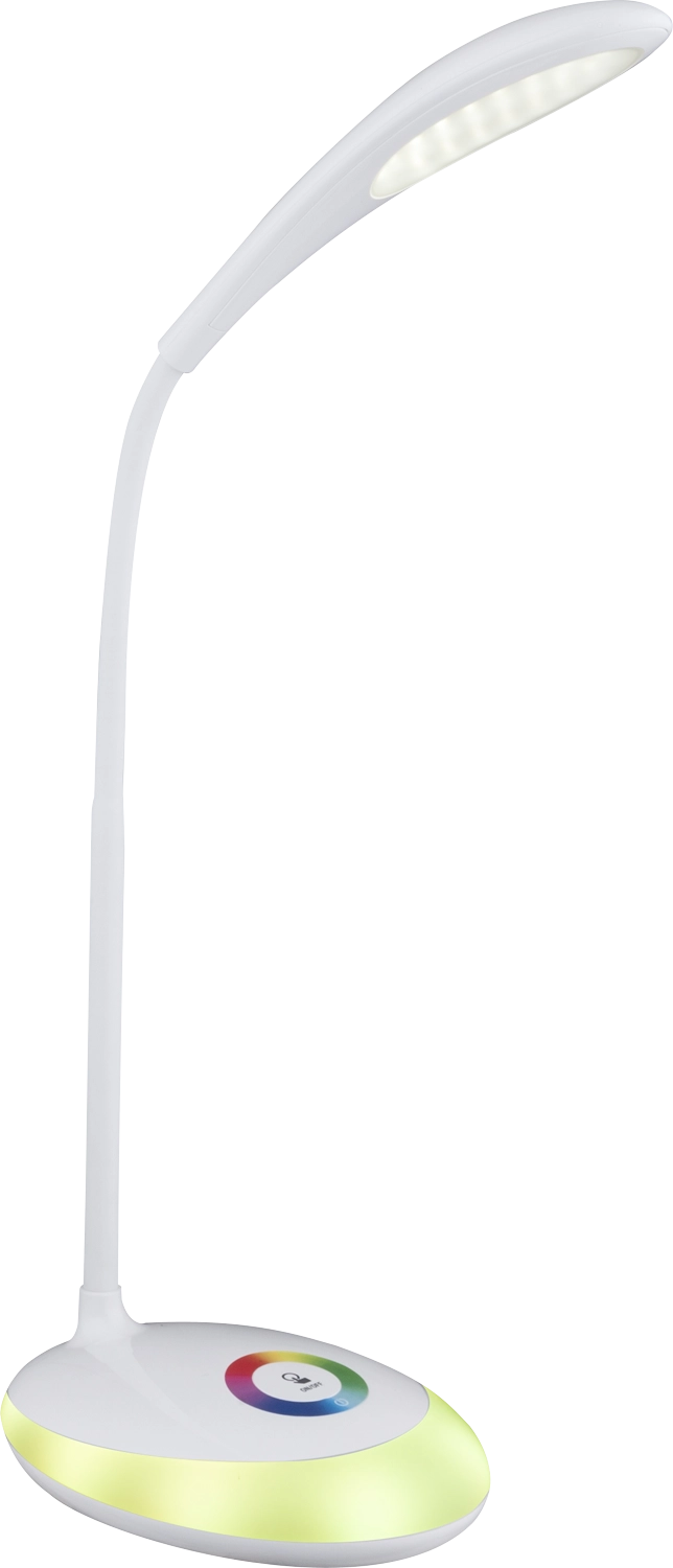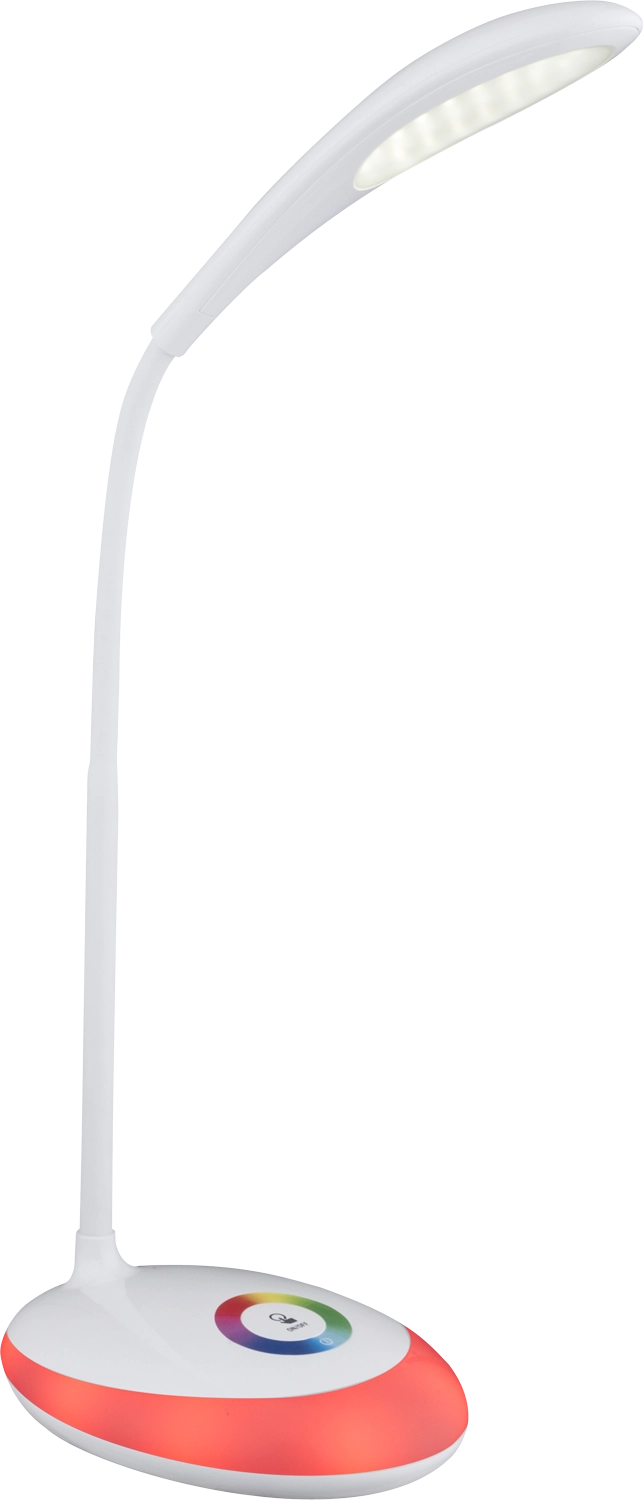 The table lamp MINEA made of white and satin plastic is a model for young and old. High-quality workmanship, equipped with a flexo arm, a color changer, a touch dimmer and the possibility to fix colors - this eye-catcher leaves nothing to be desired. Thanks to the included 3 watt LED bulb, the lamp provides 230 lumens of strong light with a fresh 5000 Kelvin light color. The special feature of this table lamp is the eye-catching base, which can shine in different colors thanks to the integrated 1.4 watt LED RGB bulb. There are no limits to this lamp. The included battery gives this modern desk lamp a six-hour independence from the power grid and limitless flexibility for the user. Charging is done via USB cable.