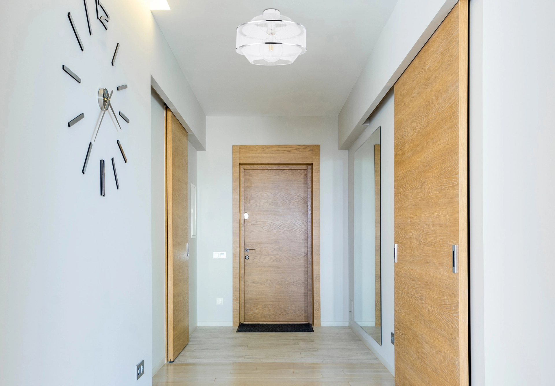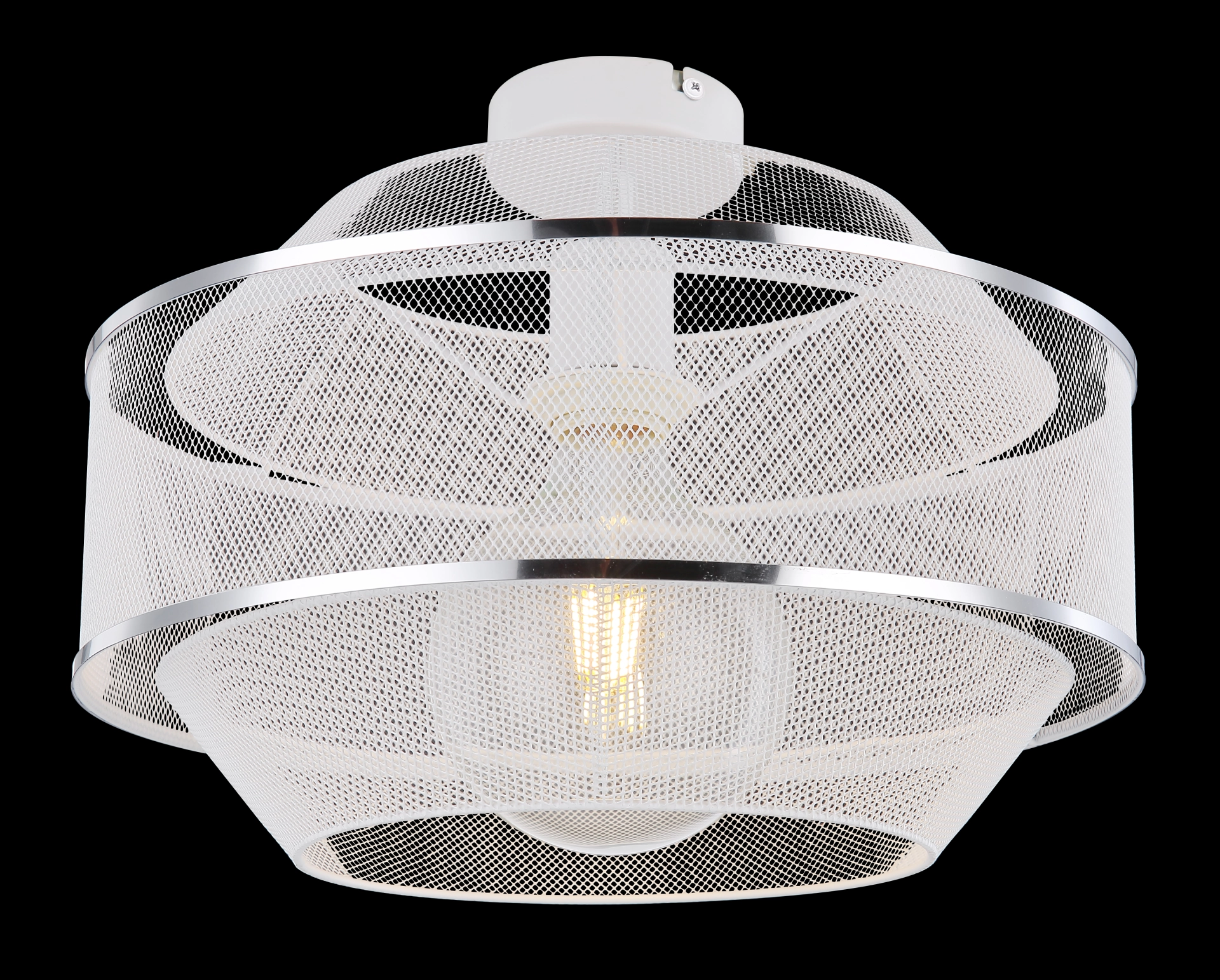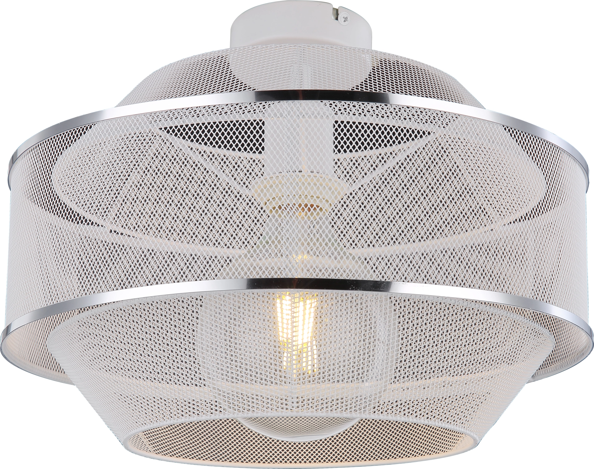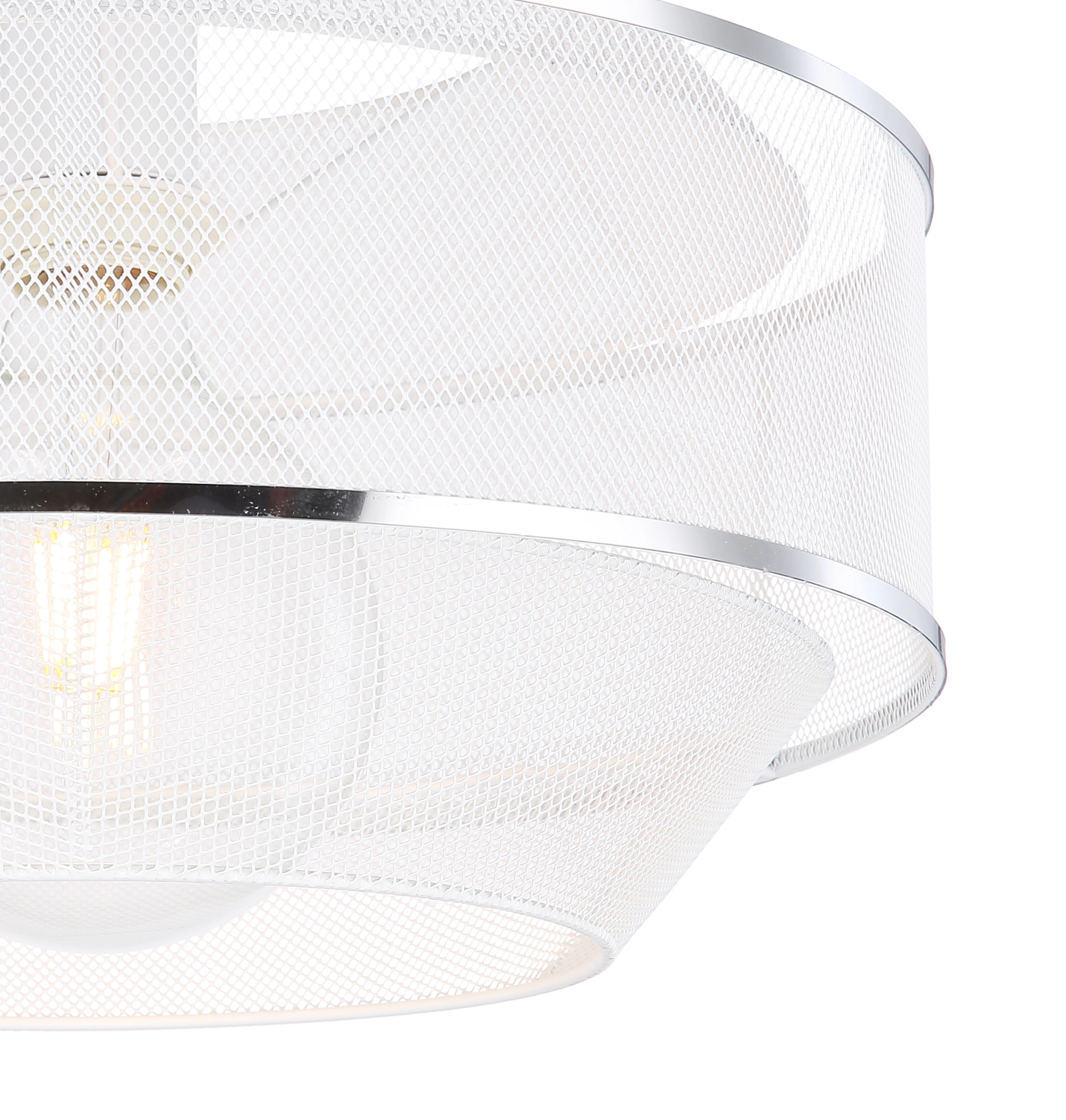 The ceiling lamp of the VIGATTO series (Ø35cm) impresses with its modern look. The lamp is in white and 2 silver chrome rings, the shade consists of a curved wire mesh. The built-in E27 socket is designed up to a maximum of 60W and allows bulb replacement.