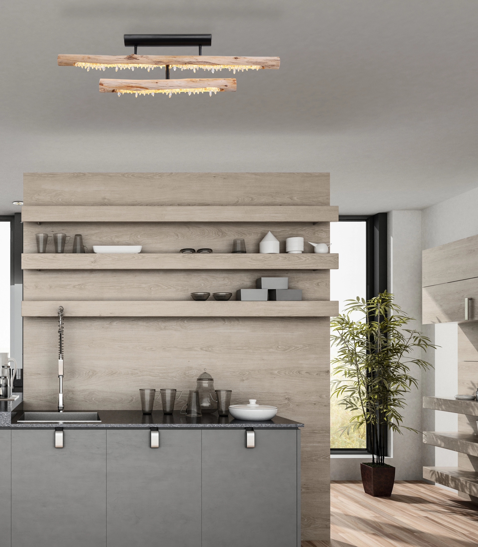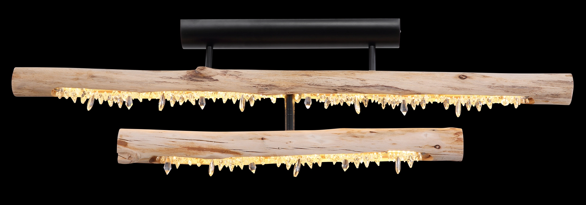 With this ceiling lamp, modernity meets the tried and tested. The clear acrylic crystals attached to the wooden beam provide an eye-catcher in your room. Thanks to the included 30 watt LED bulb, this interior light is not only an absolute eye-catcher visually, because it provides up to 1350 lumens of strong light with a pleasantly warm 3000 Kelvin light color. In addition, the light color can be fixed in three stages via its wall switch. Thanks to the low power consumption, this LED lamp is energy-saving and therefore also very environmentally friendly. This interior lamp is great for your living and dining area.