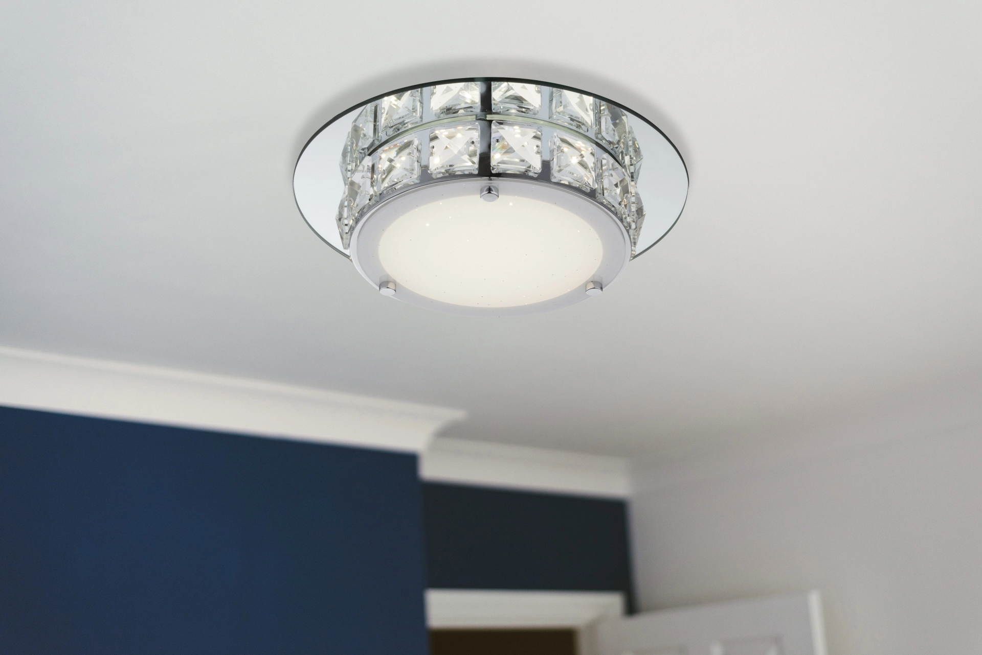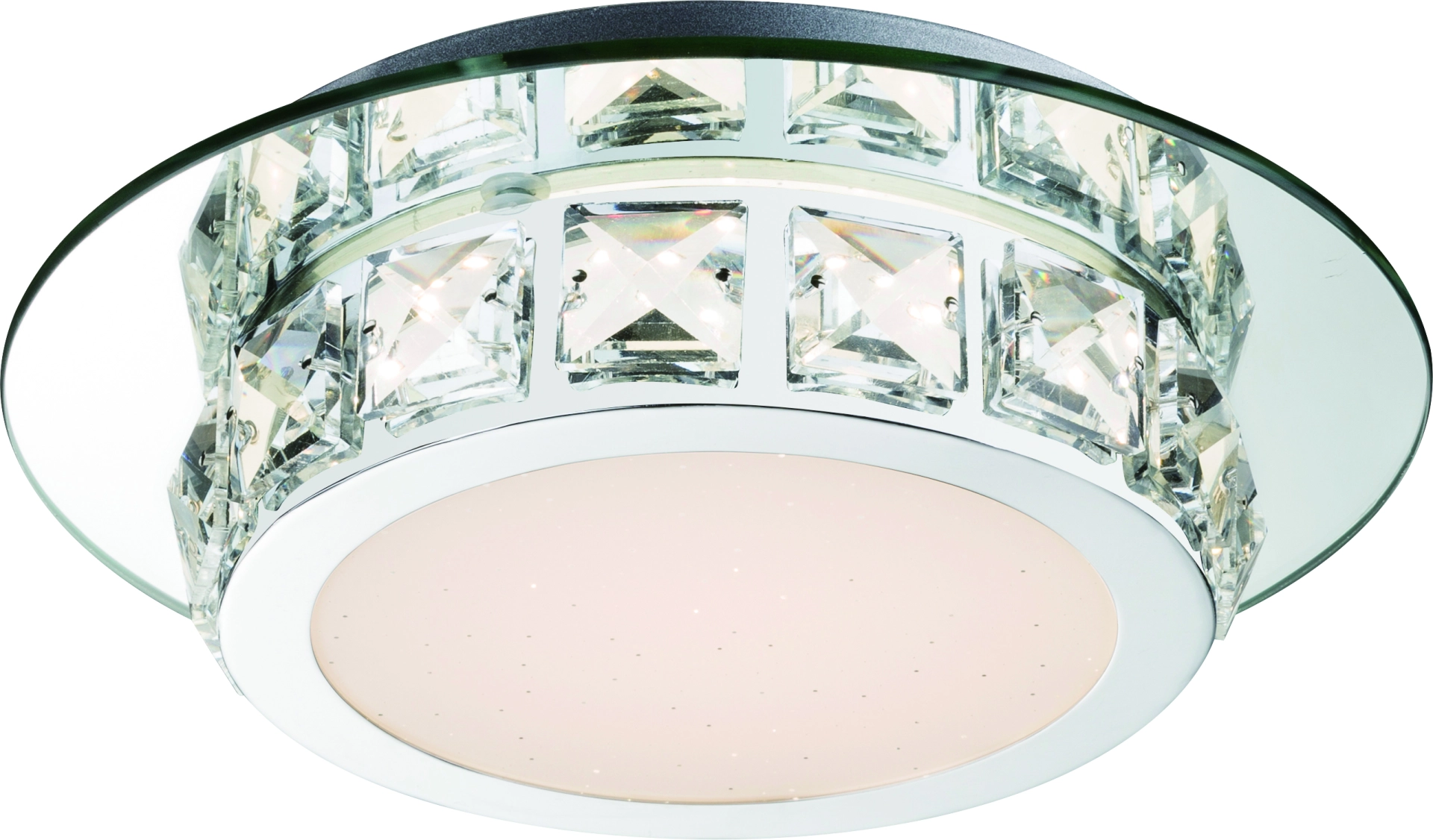 This luxurious-looking square ceiling lamp, from the Margo series, impresses with its seemingly untouchable look. The shade in chrome with mirror edge and opal glass, decorated with clear K5 crystals, sets luminous accents in every room. With a size of 25 cm, a light color of 4000K and a thickness of 720 lumens, this model is a real eye-catcher. With other models of this series you can complete the picture in your rooms.
