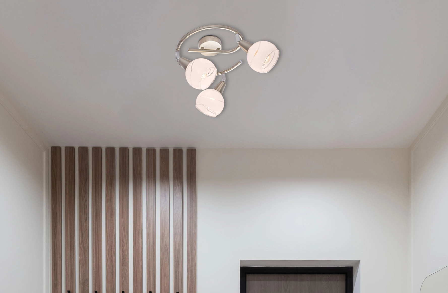 The ceiling spotlight Elliott scores with its modern and at the same time timeless design. Three movable spherical lightly patterned satin-finished glasses are attached to a nicklematten e-shaped arm (Ø25cm). The available E14 sockets are each equipped with a 5W LED bulb and together provide 1200 lumens of strong light at a pleasant warm white 3000K light temperature.