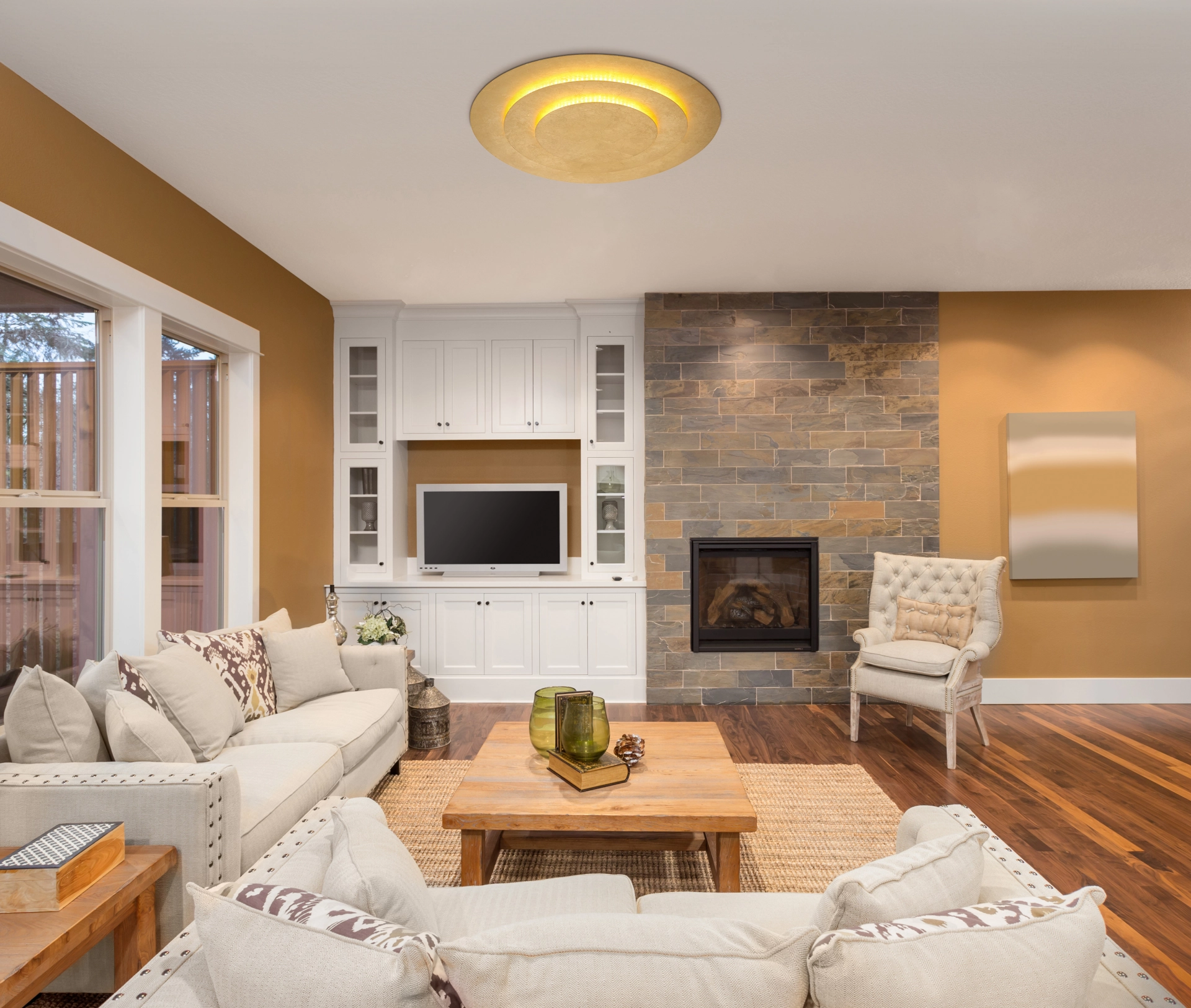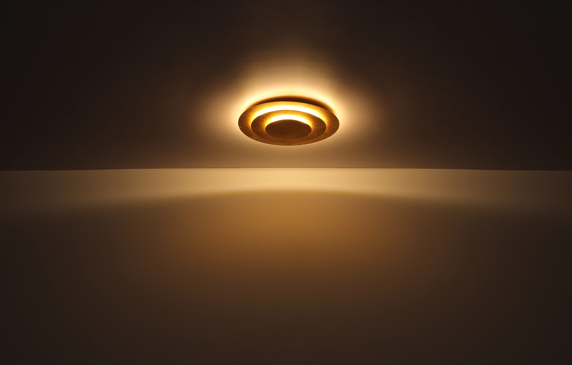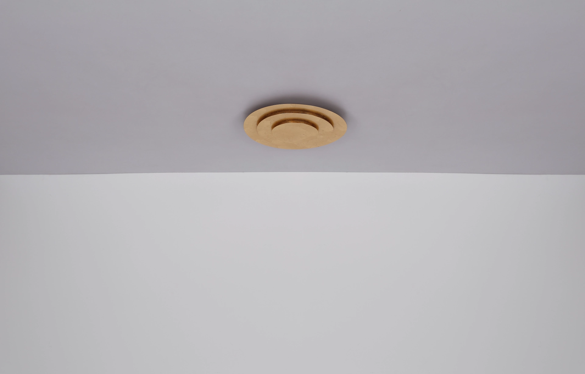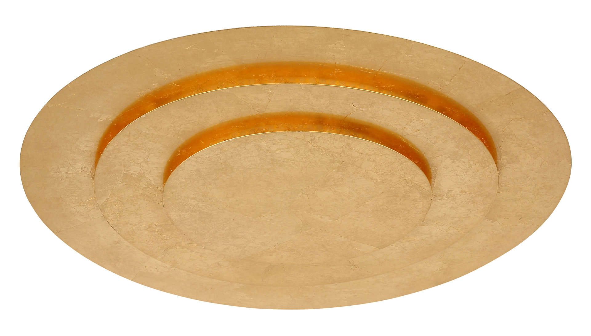 The gold-coloured ceiling lamp has a diameter of 350 mm and a height of 47 mm. It is made of gold-coloured metal and is equipped with an LED bulb with a power of 24W and a voltage of 230V. The light source has a brightness of 3100lm source and an output brightness of 1500lm at a color temperature of 3000K.