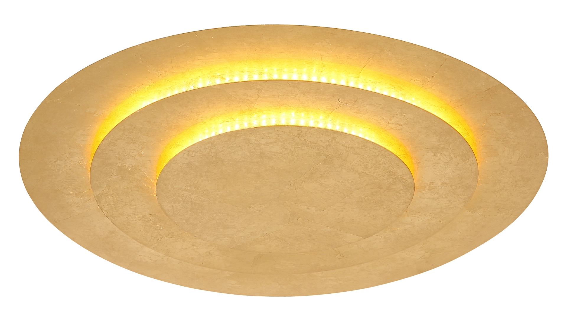 The ceiling lamp has a diameter of 490 mm and a height of 47 mm. It is made of gold-coloured metal and is equipped with an LED bulb with a power of 40W and a voltage of 230V. The light source has a brightness of 5200lm source and an output brightness of 2400lm with a color temperature of 3000K.