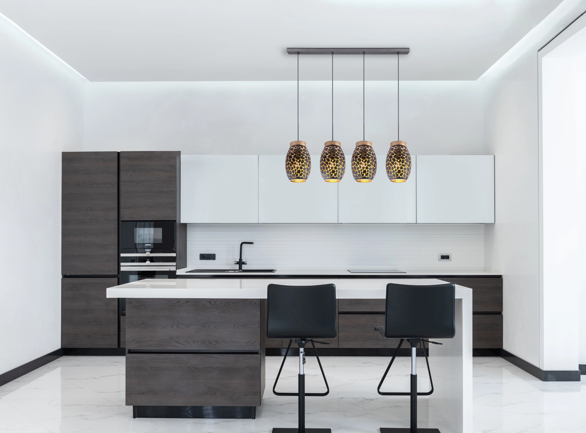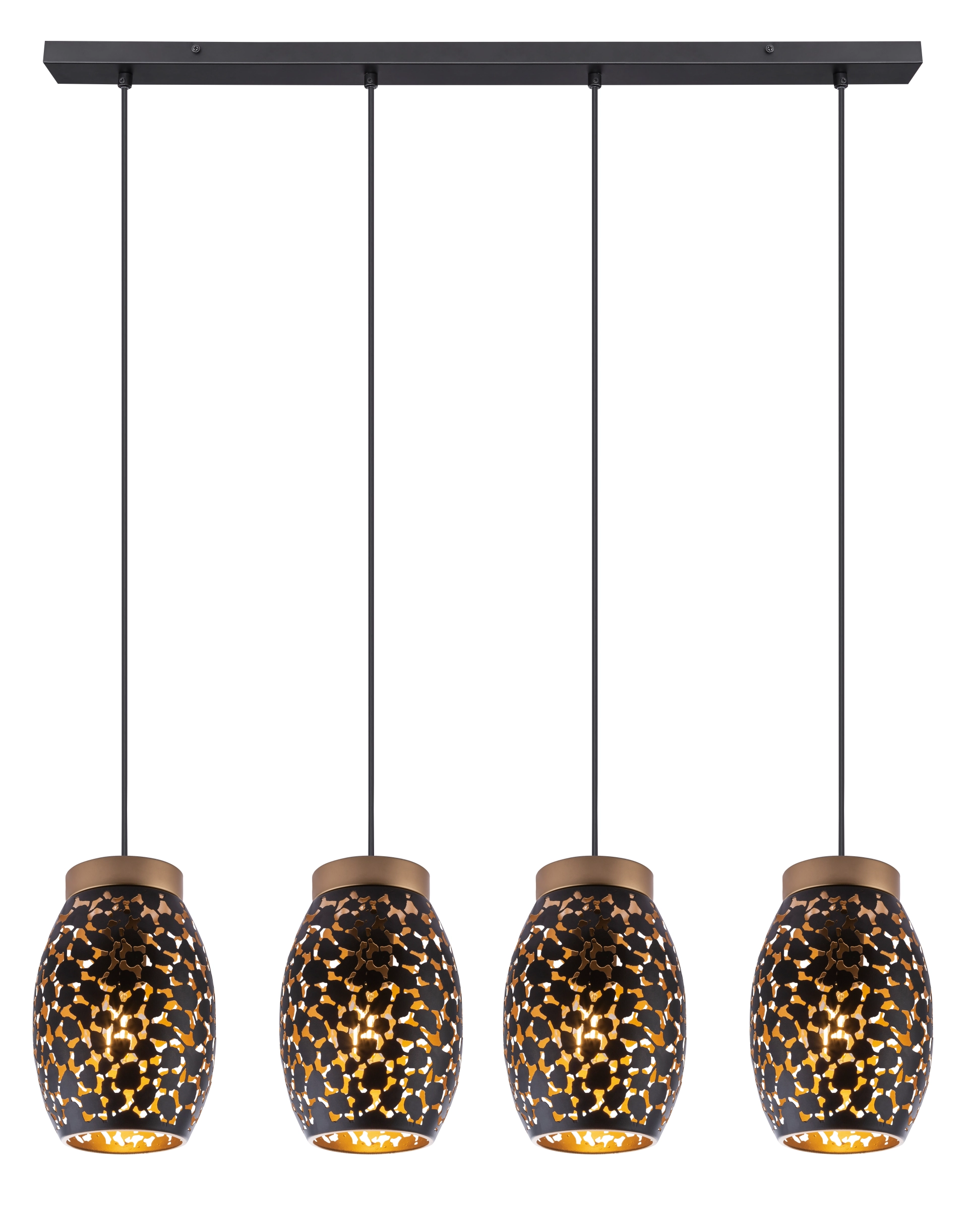 The Narri hanging lamp is a stylish addition to your interiors with its beautiful design in black-matt and gold-colored metal. Due to its elongated shape, the 90 cm long pendant lamp can be wonderfully mounted over a table, which then receives uniform illumination. The four round metal shades with a stylish pattern are tinted gold on the inside and hang 1.2 m from the ceiling. They can each be equipped with an E27 bulb of your choice. This will allow you to determine light color and brightness according to your preferences. With Narri you can create a cozy atmosphere in your indoor area.
