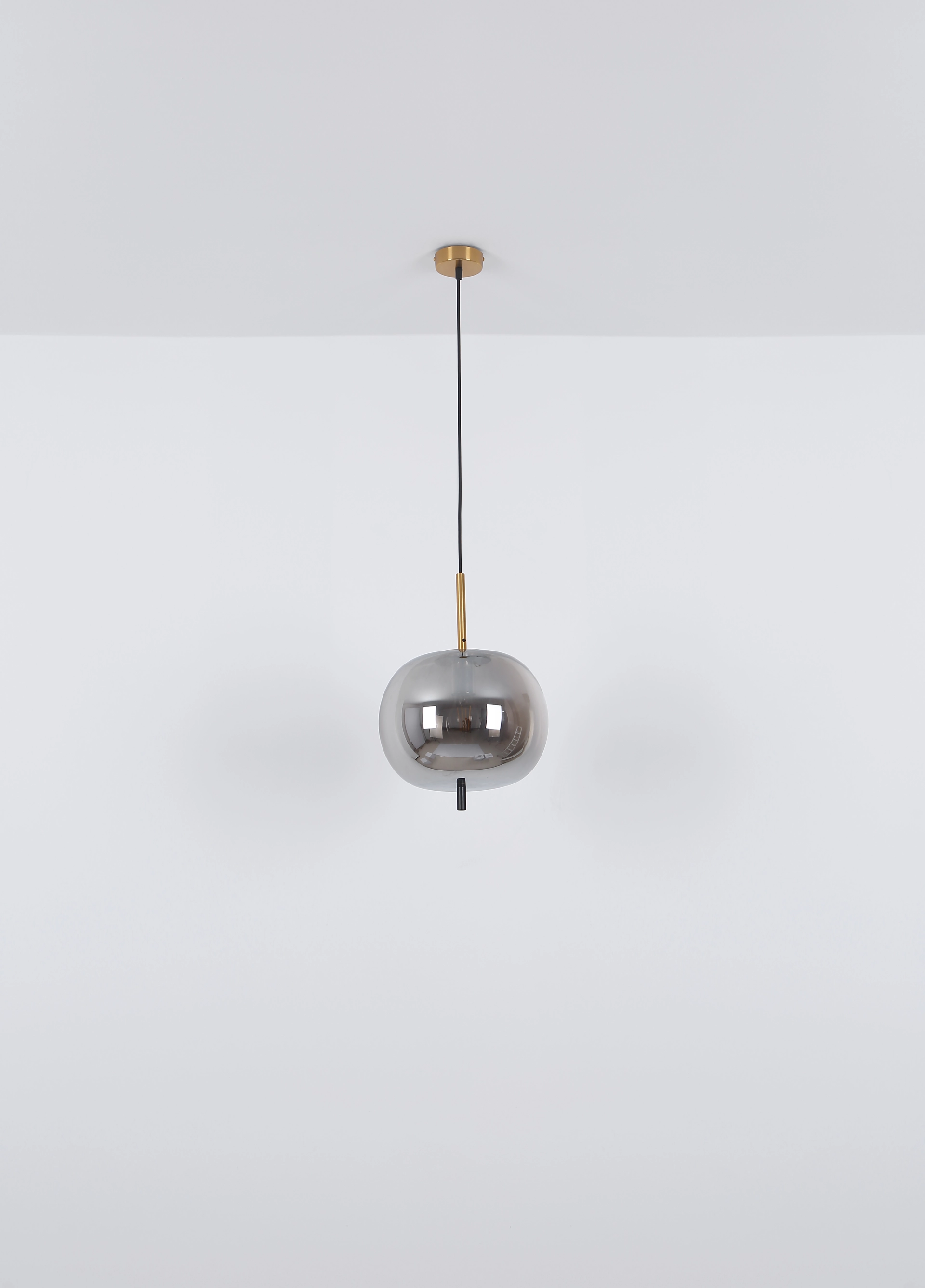 This hanging lamp is a wonderful addition to your interiors. The 102.5 cm long pendant lamp consists of a rectangular, brass-colored metal plate on which eight black cables with round, smoky glass shades of different shapes hang, the height of which you can adjust up to 120 cm when mounted. These are also equipped with brass-colored metal elements and can be equipped with E14 bulbs of your choice, which gives you the opportunity to individually determine light color and brightness. With this pendant lamp you can set stylish accents in your four walls and complete the overall picture.