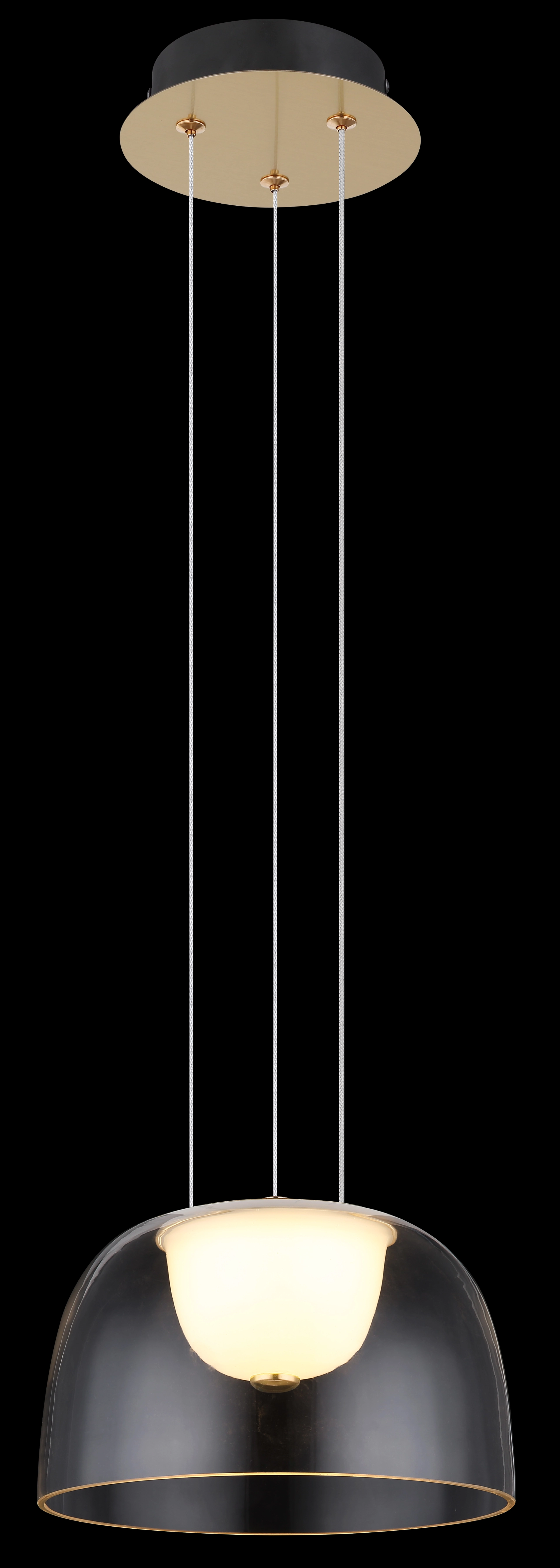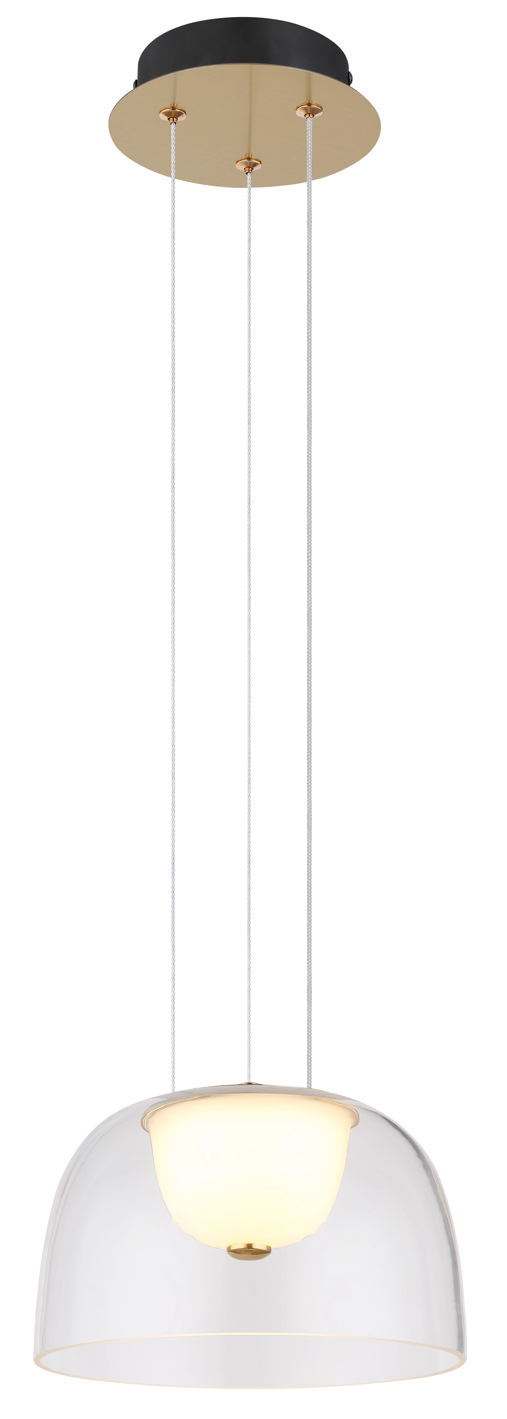 This modern hanging lamp from the Jocky series (ø 23 cm) can add an elegant light source to your interiors. Made of brass-coloured metal, the pendant lamp consists of a clear glass shade that hangs from the ceiling on three cables and is equipped with the included LED lamps covered by satin-finished glass. These provide 665 lumens of strong light with a pleasant light color of 3000 Kelvin (warm white). In addition, the height of the luminaire can be adjusted up to 120 cm during installation. With more articles of the same series you can complete the overall picture in your four walls.