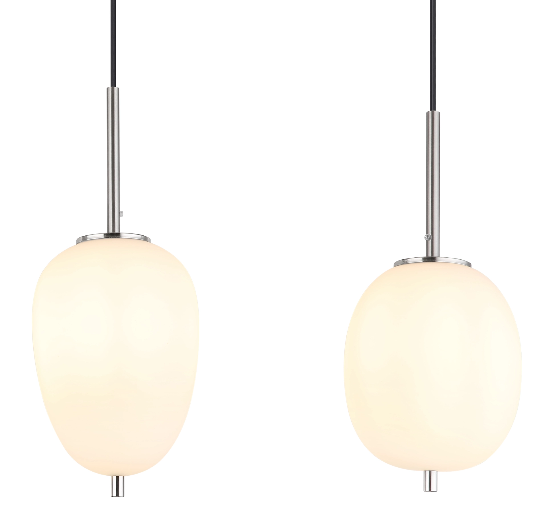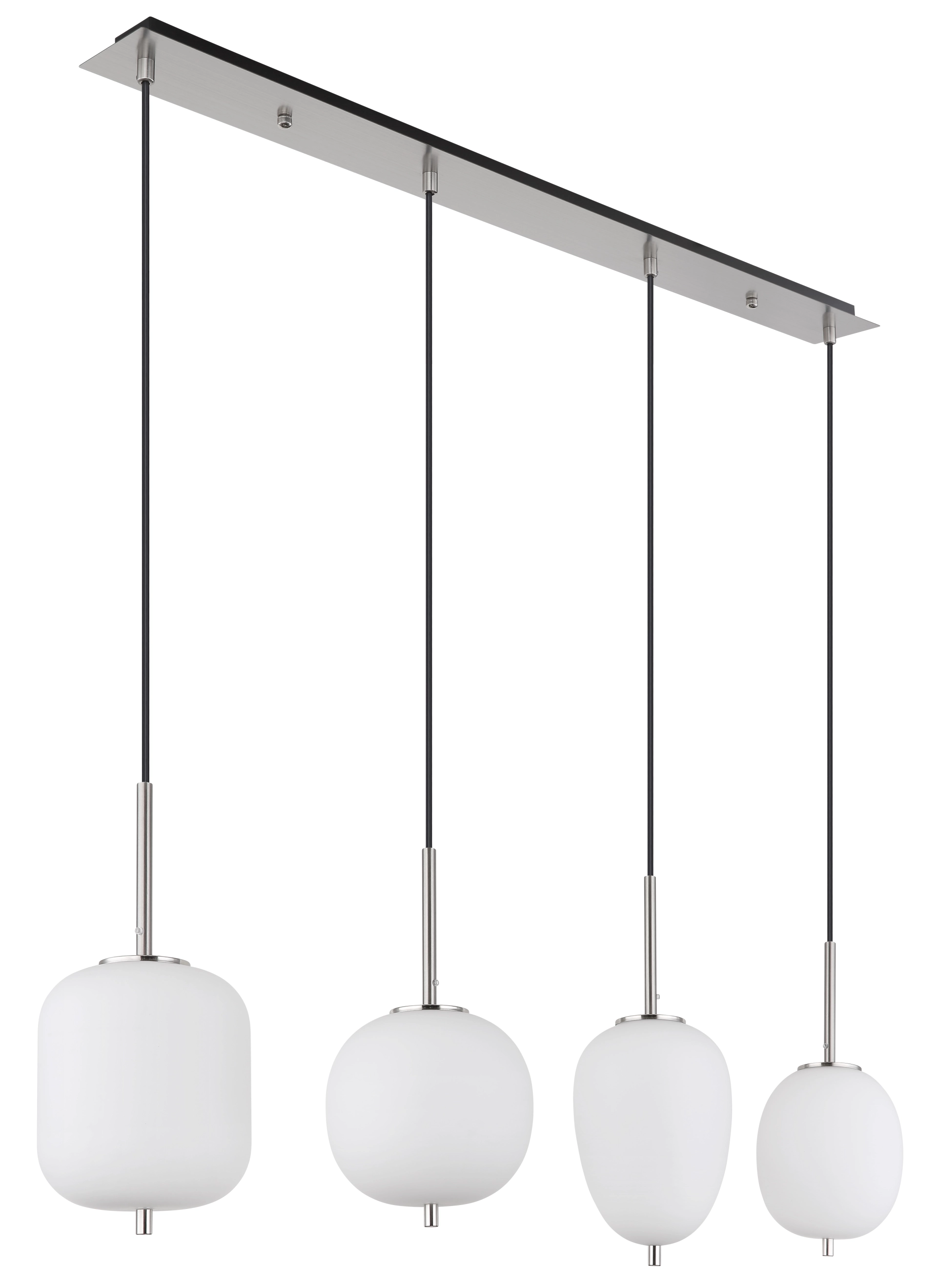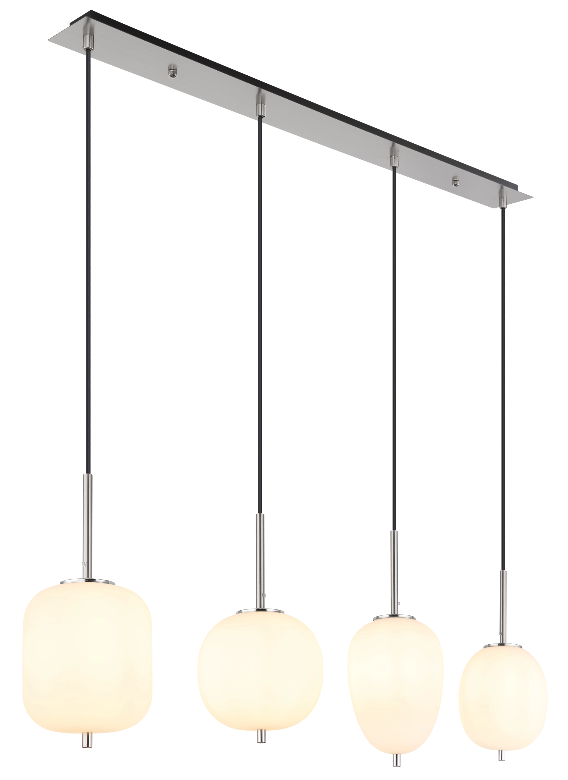 This 100 cm long suspension lamp of the BLACKY I-series is made of nickel-colored metal with opal glasses. The four hanging glasses are individual in their presentation and size. This 120cm protruding, artistic lamp has four E14 sockets (with max. 40 watts), which allow a free choice of bulbs. Due to their durability and power savings, we recommend LED light source. This pendant lamp is ideal for your living and dining area.