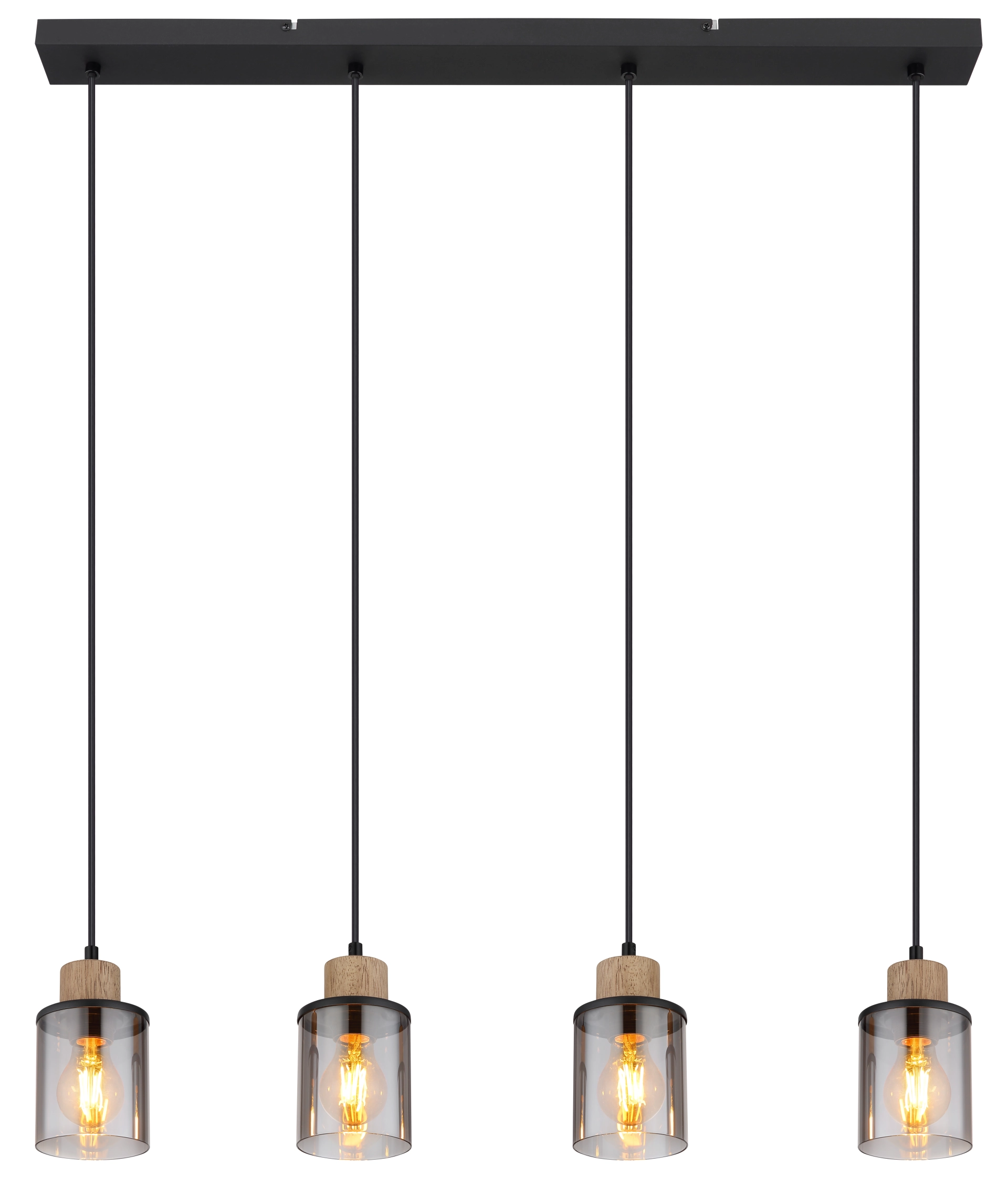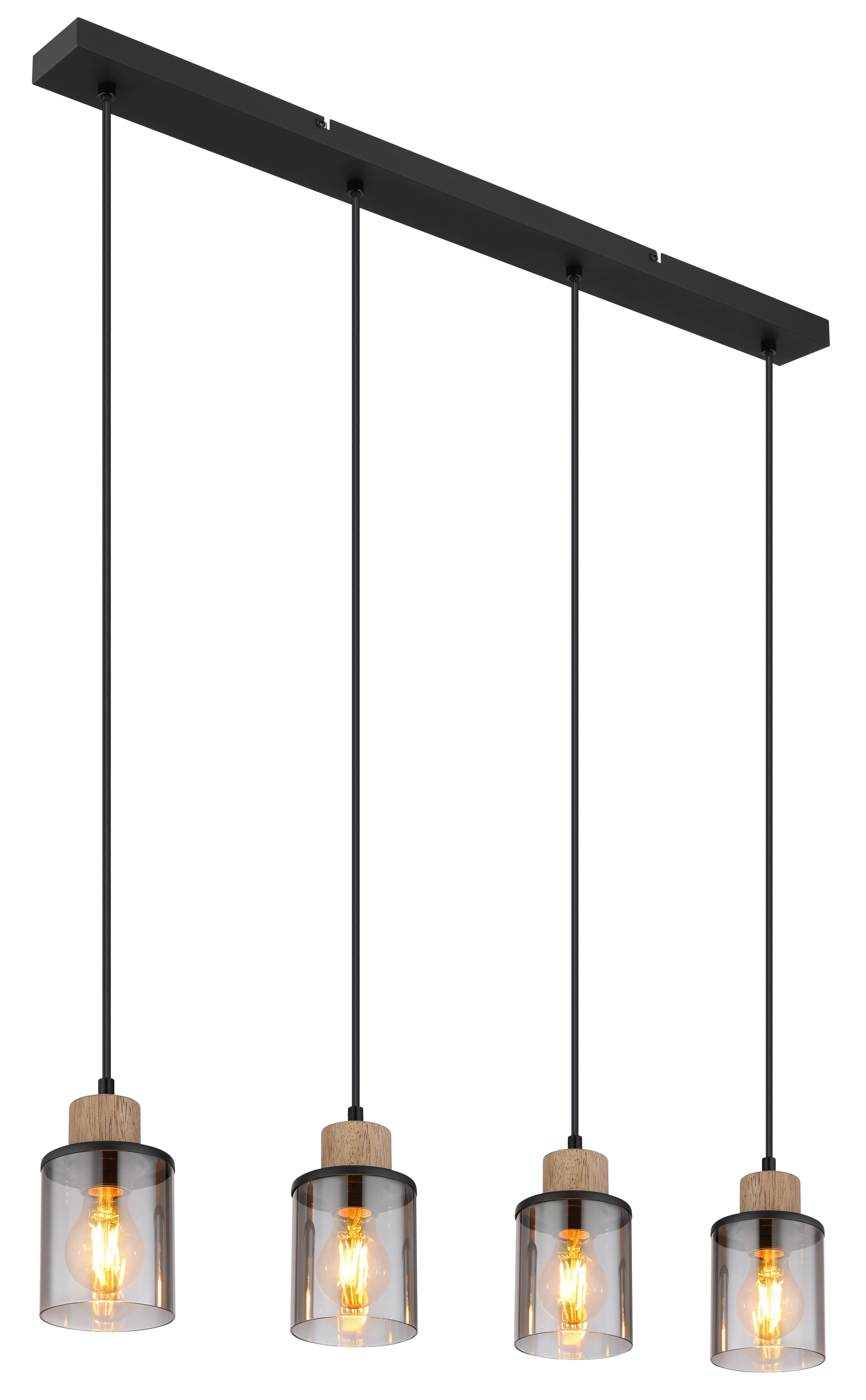 This beautiful pendant lamp from the REID series inspires with its great design and becomes the center of your living area. The lamp consists of 6 smoky glass shades with decorations in wood look, each of which has an E27 socket and hangs from the ceiling attached to 6 black cables. The E27 sockets allow you to use bulbs of your choice, up to a maximum power of 15 watts.