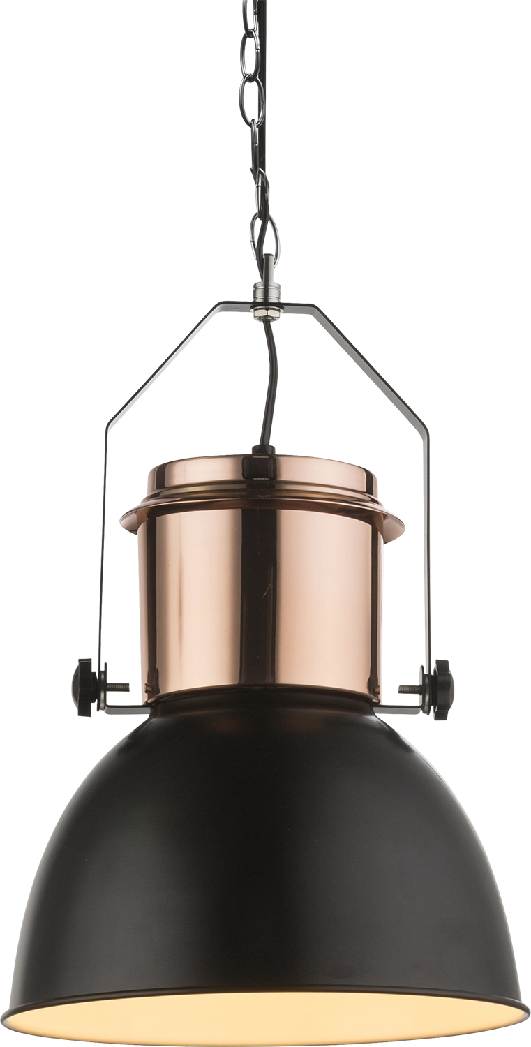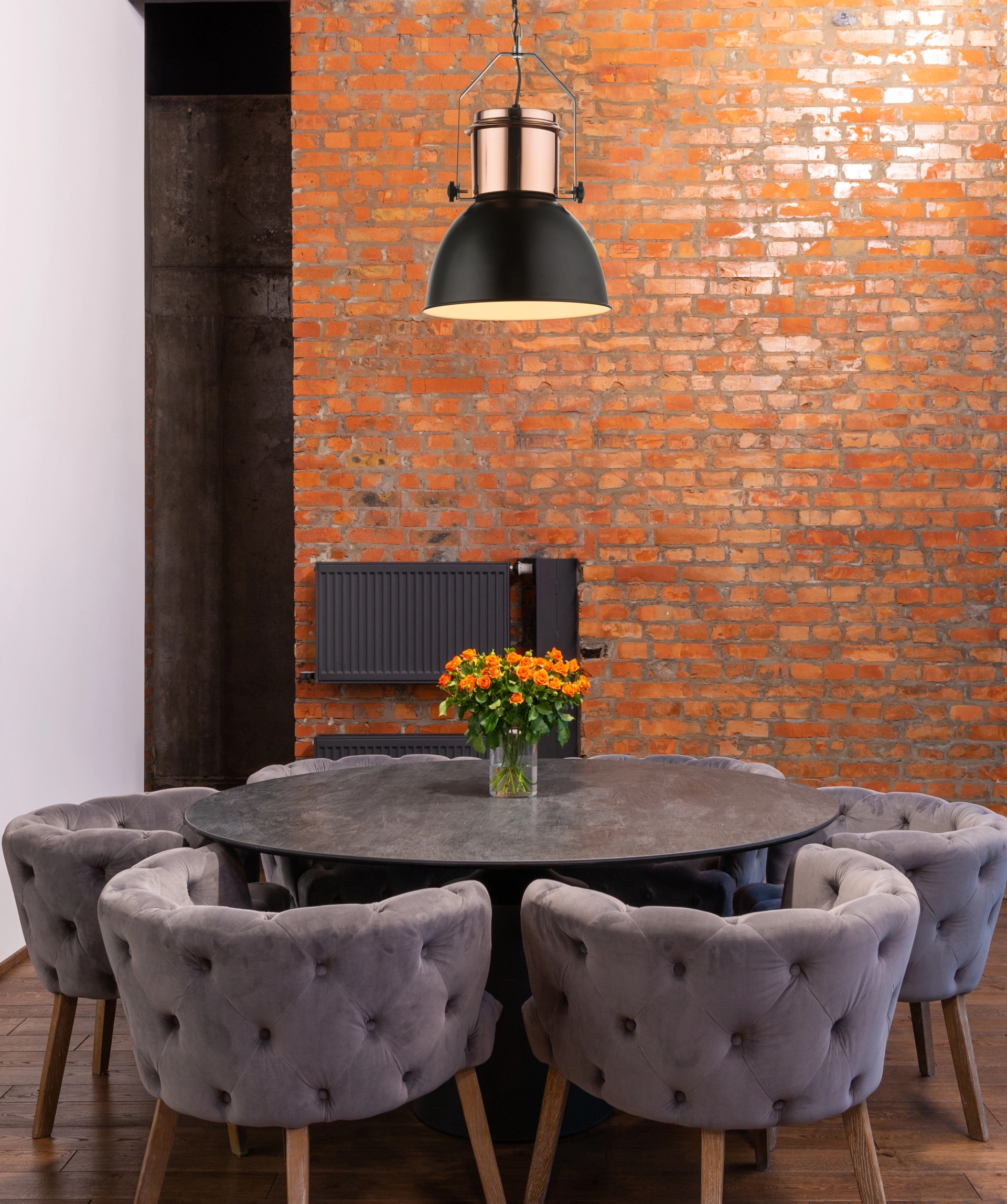 This extraordinary hanging lamp, from the Kutum product series, is an eye-catcher in every living area. The pendant lamp in copper color hanging from a chain (with black textile cable) looks stylish and modern with its black metal shade. The built-in E27 socket gives you the freedom to choose the light source. Due to their power savings and longevity, we recommend LED lamps.
