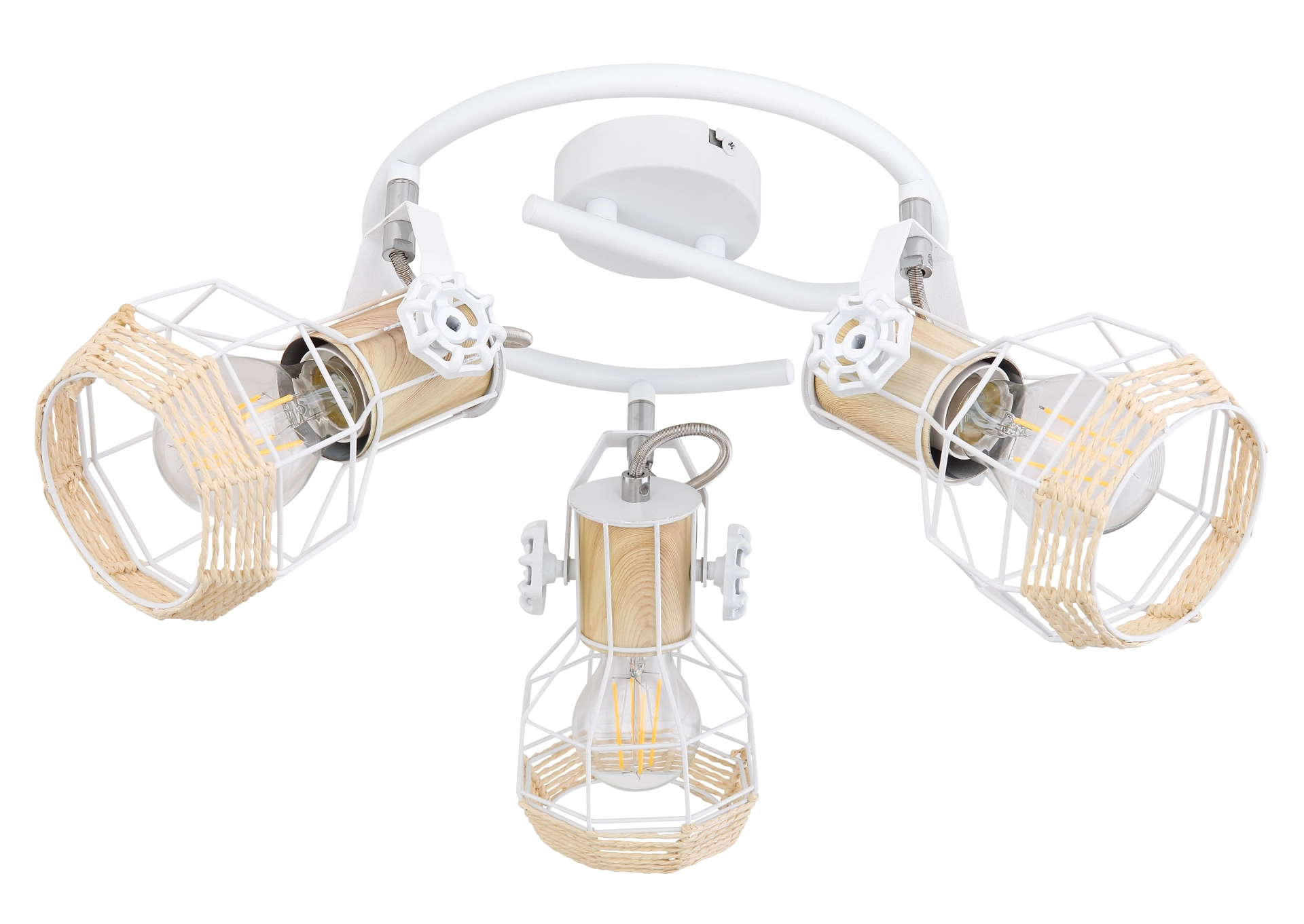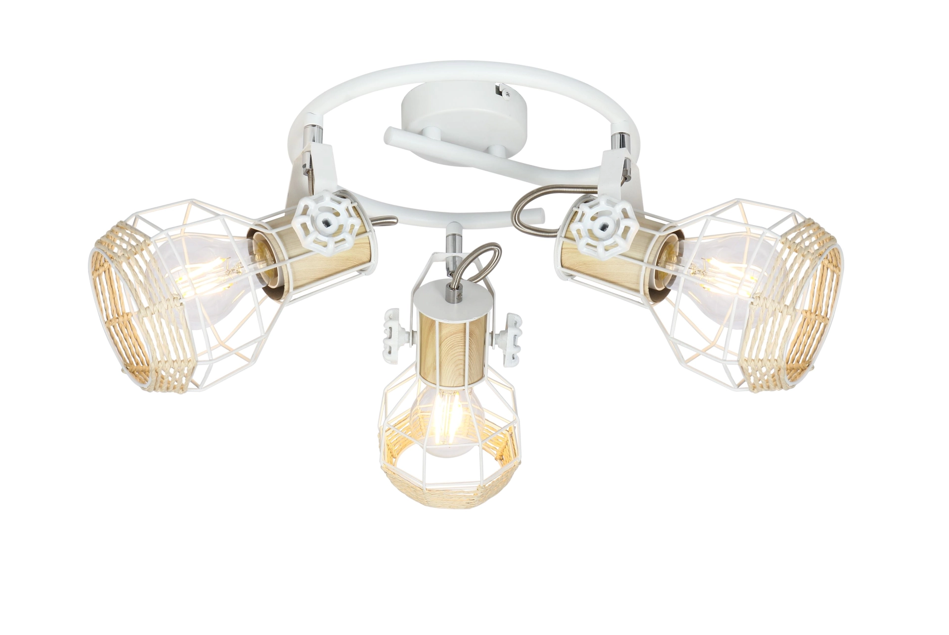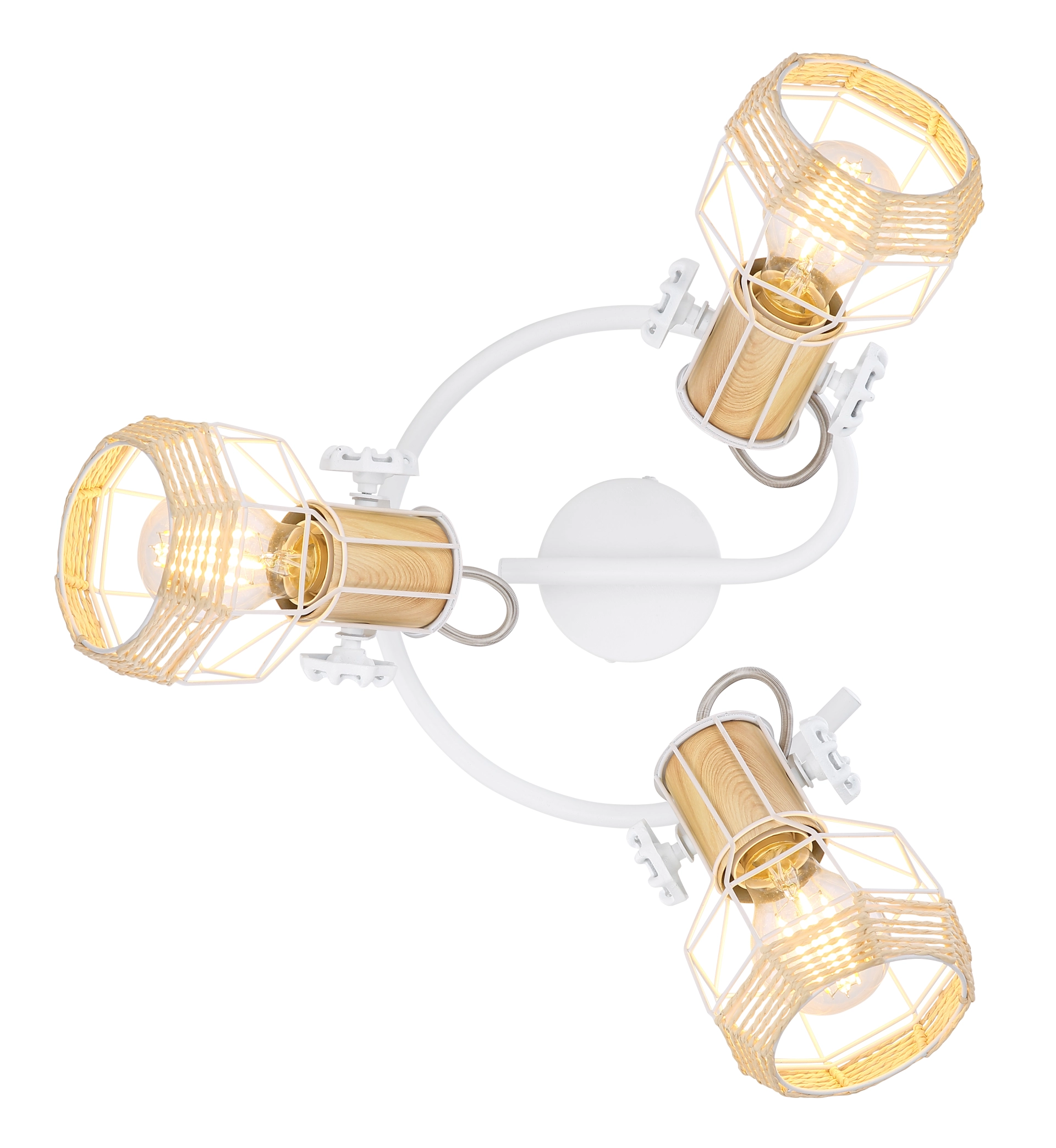 This spotlight of the series BANA (Ø 25cm) combines the modern with the retro look. The white metal and the natural wood paired with the natural colored bast shades make this interior lamp an eye-catcher in your home. The three spotlights, which are located on an e-shaped arch, are decorated with optically effective control wheels on the metal housing. By freely choosing the light source (3xE27/max. 40W), you can determine the light intensity and light color of this interior lamp yourself. Due to their longevity and power savings, we recommend LED bulbs.