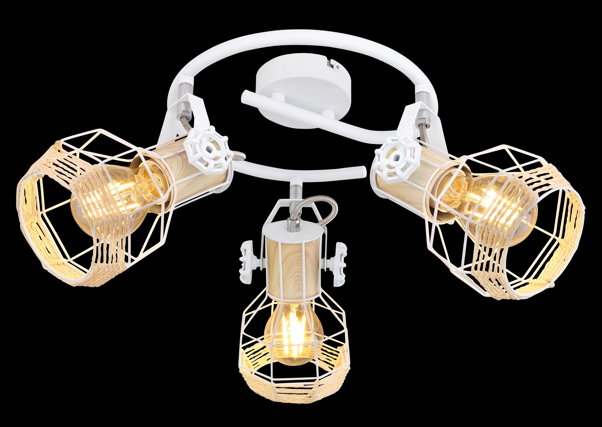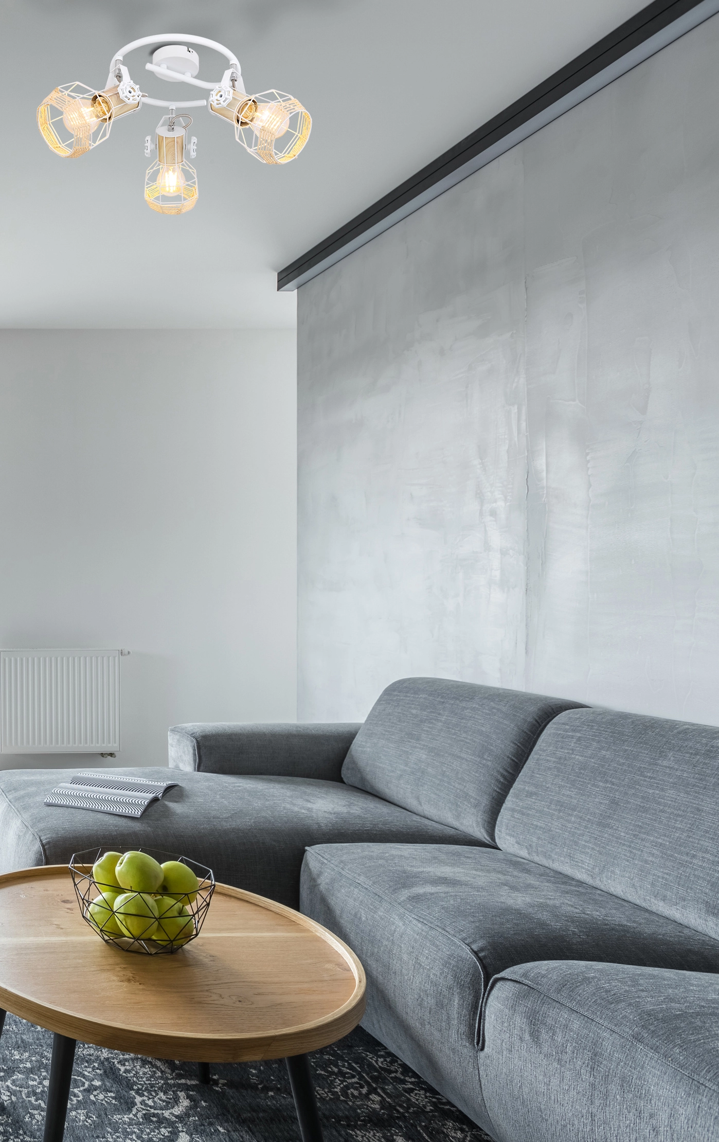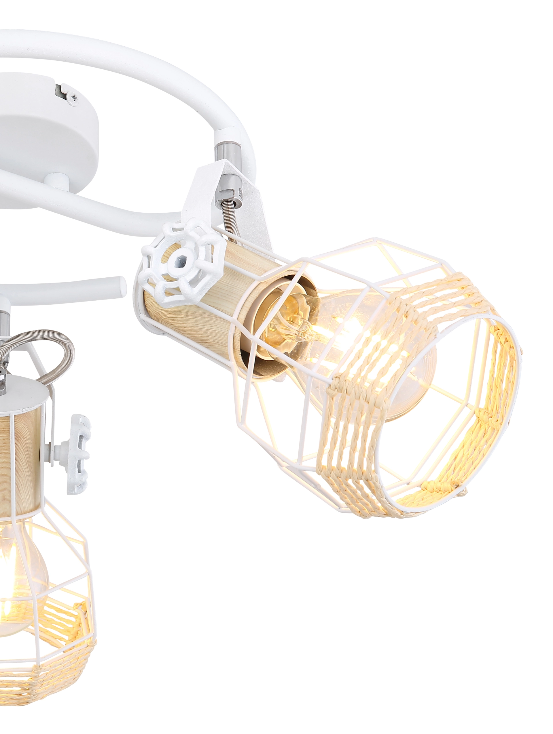This spotlight of the series BANA (Ø 25cm) combines the modern with the retro look. The white metal and the natural wood paired with the natural colored bast shades make this interior lamp an eye-catcher in your home. The three spotlights, which are located on an e-shaped arch, are decorated with optically effective control wheels on the metal housing. By freely choosing the light source (3xE27/max. 40W), you can determine the light intensity and light color of this interior lamp yourself. Due to their longevity and power savings, we recommend LED bulbs.