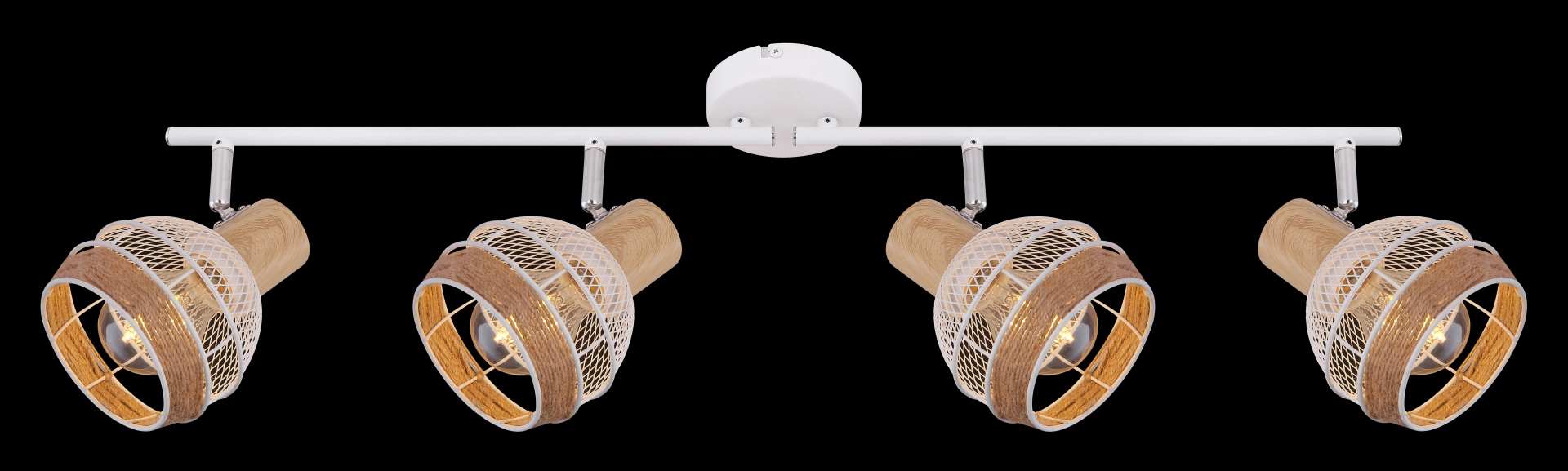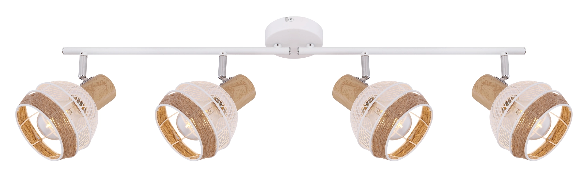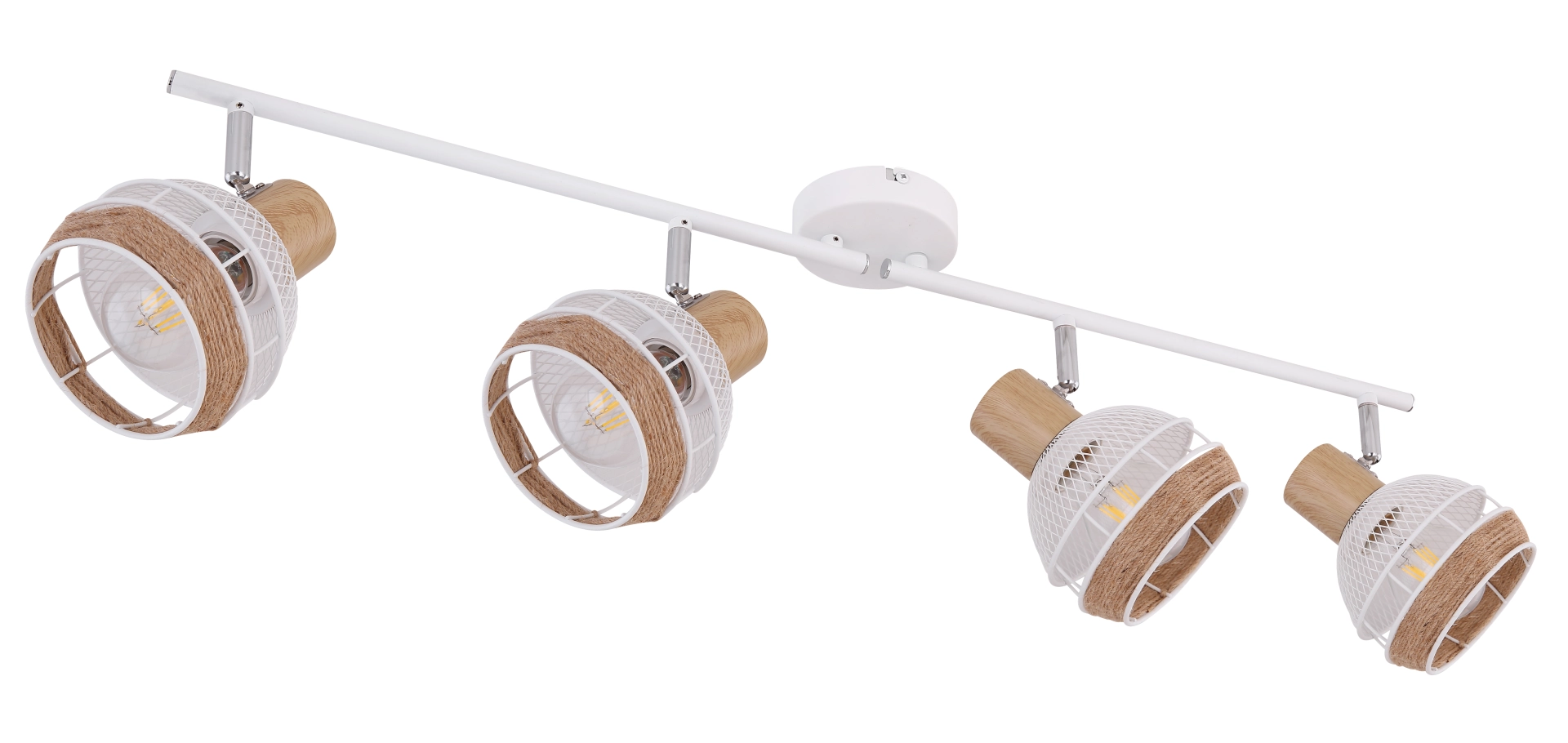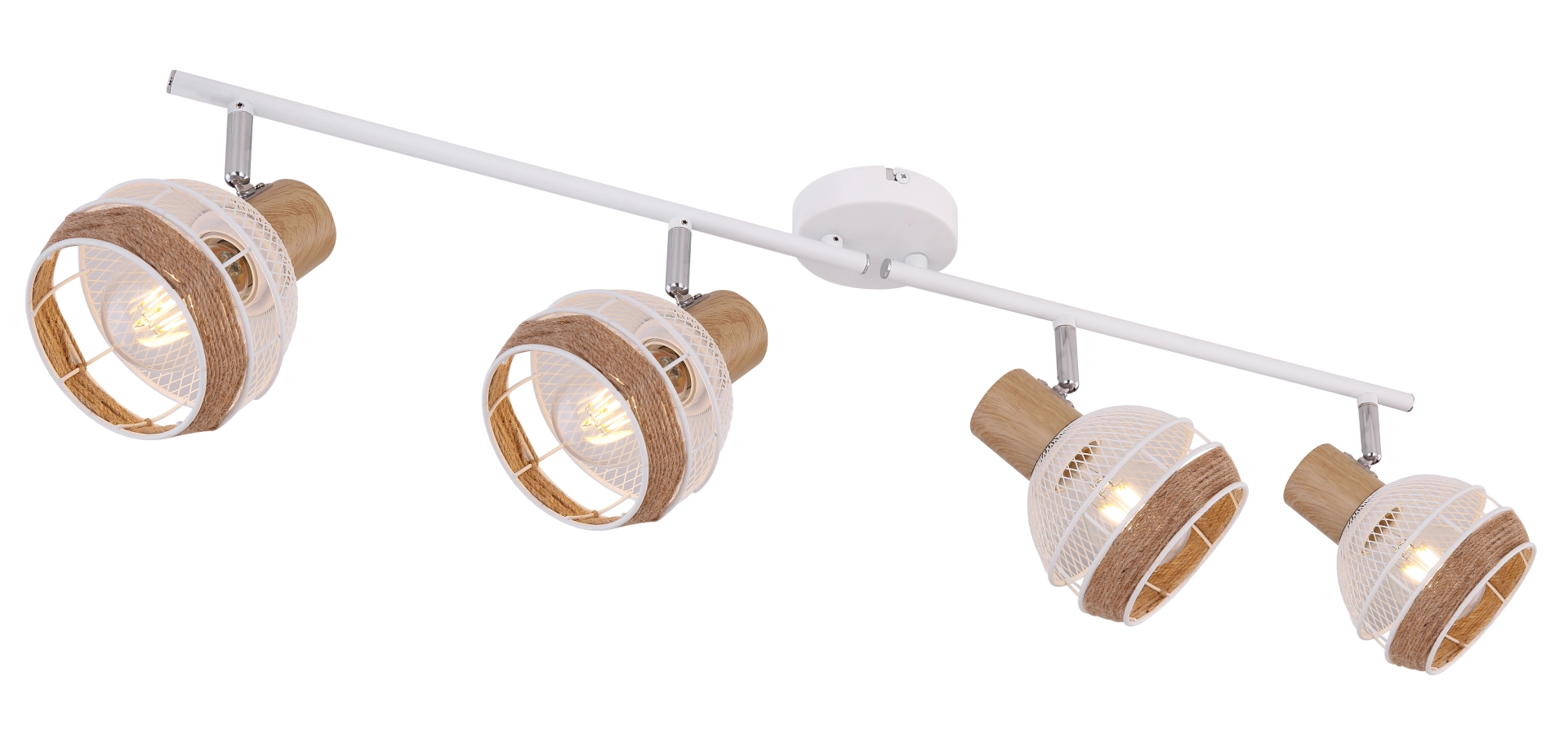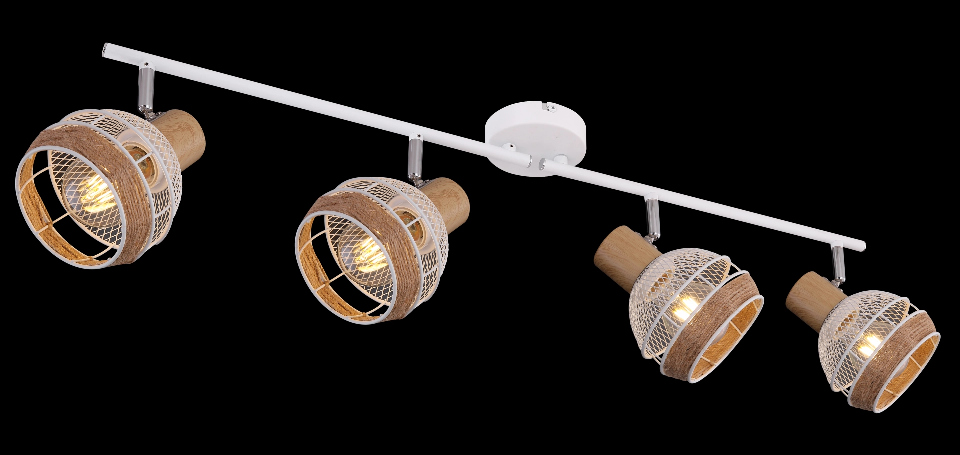 This interesting series WIDY combines different materials - the white metal with the brown-colored hemp rope The four spotlights located on two arms convince with the design of the movable lampshades, which are metal braids and are surrounded by a black hemp rope at the front. By freely choosing the light source (4xE27/max. 40W), you can determine the light intensity and light color of this interior lamp yourself. Due to their longevity and power savings, we recommend LED bulbs. This spotlight lamp is suitable for sleeping, hallway, living and dining room.