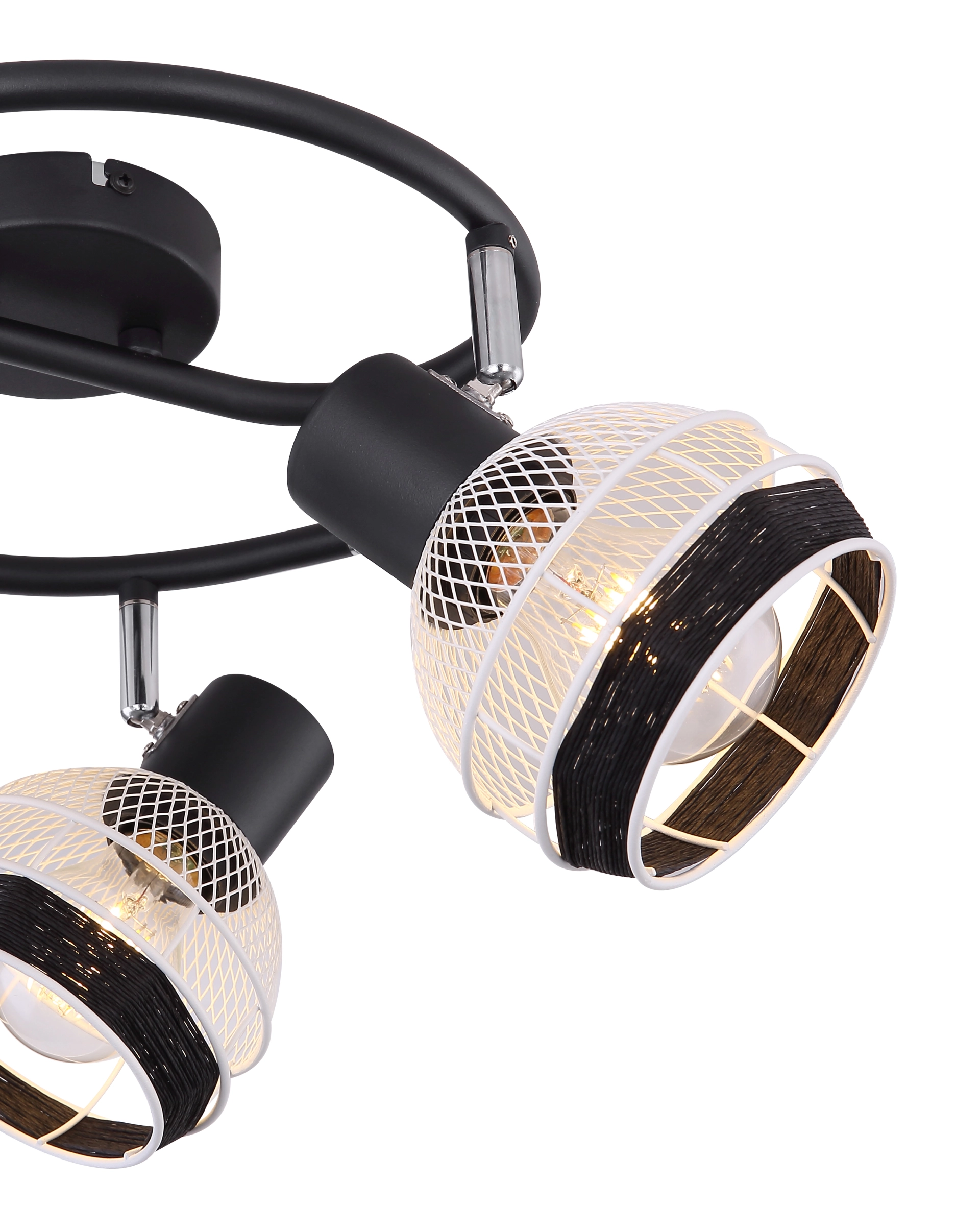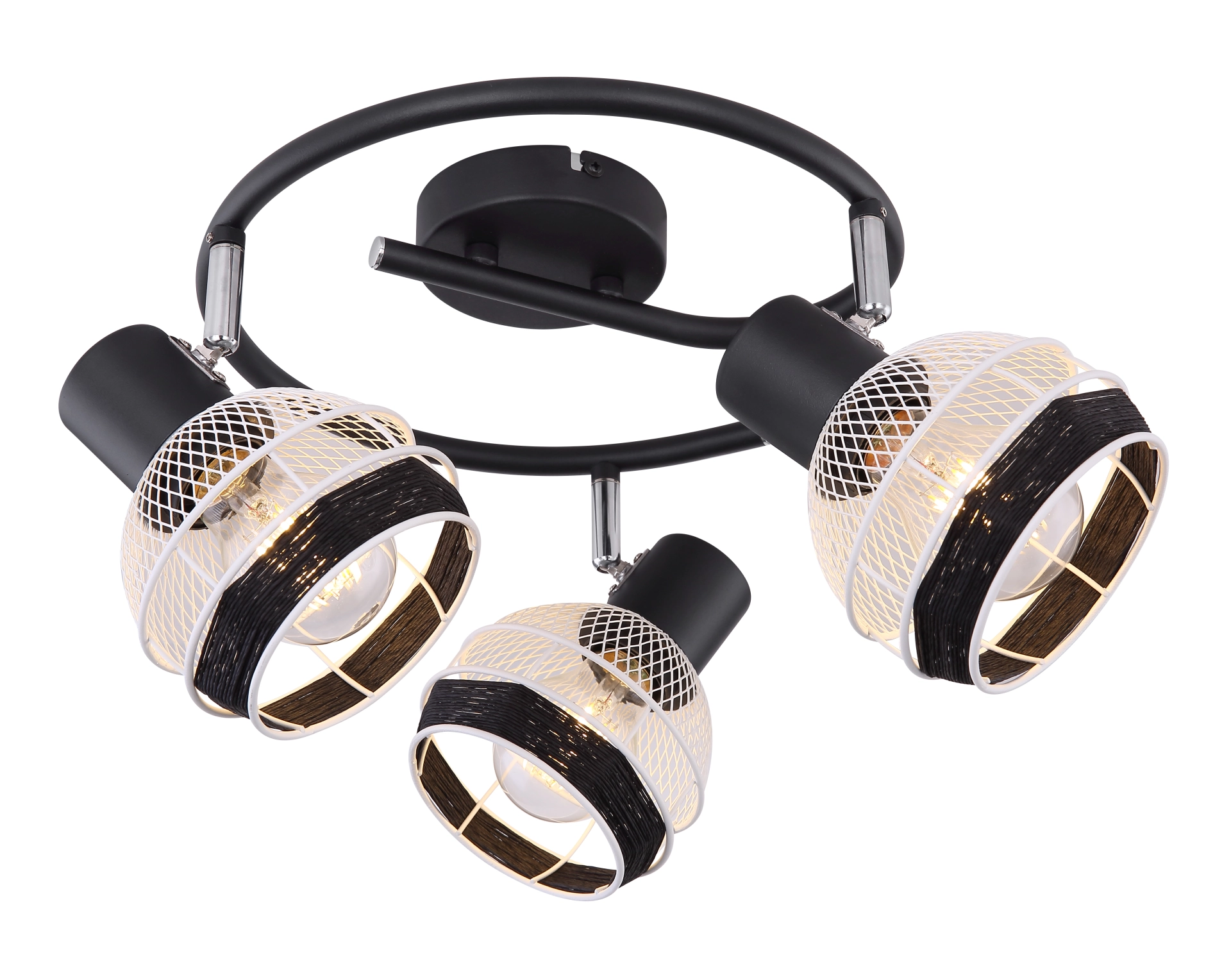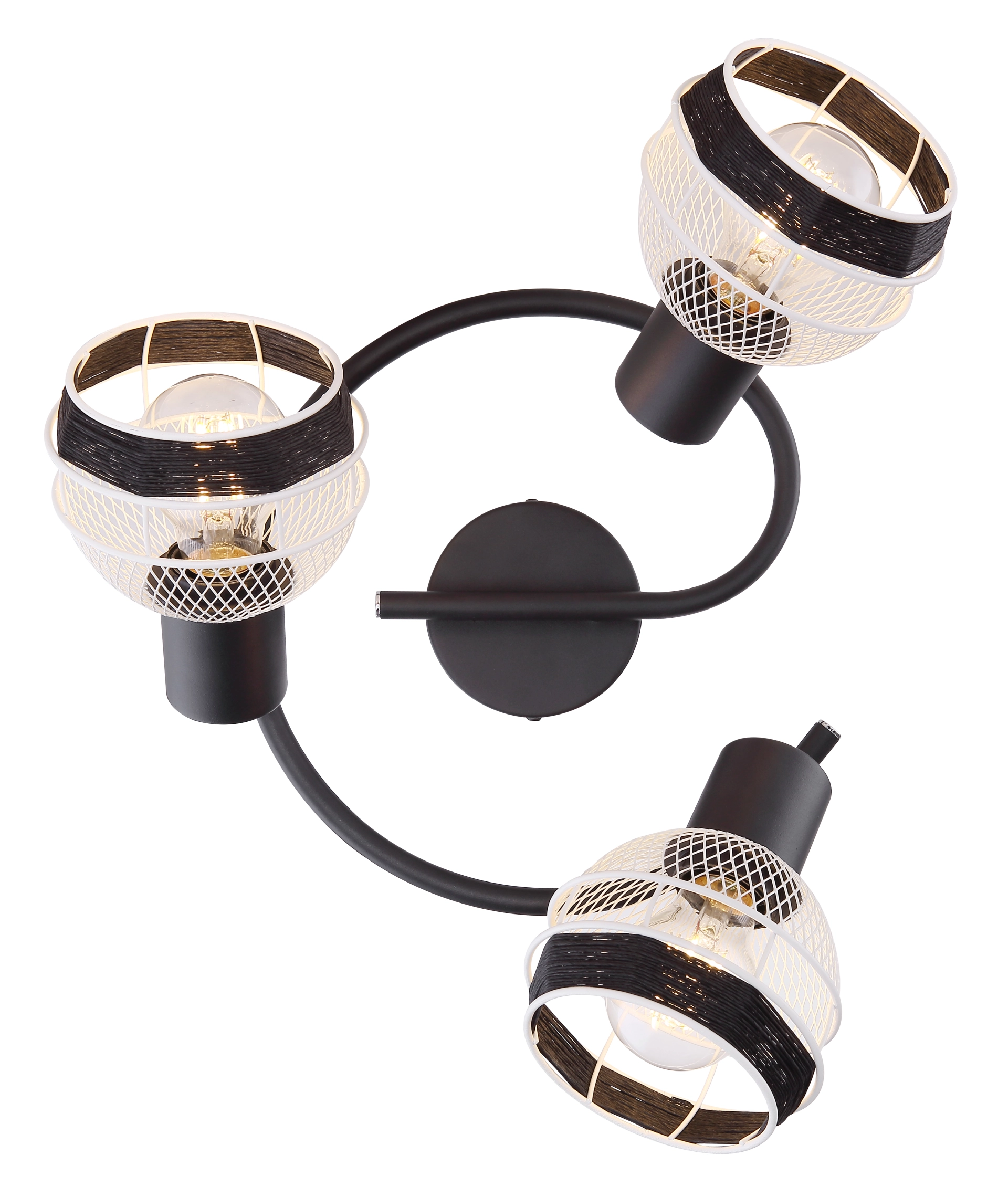 This interesting series GRIDDY combines different materials - the black-matt or white metal with the black-colored hemp rope. The three spotlights, located on an e-shaped arch, convince with the design of the lampshades, which are metal braids and are played around with a black hemp rope at the front. By freely choosing the light source (3xE27/max. 40W), you can determine the light intensity and light color of this interior lamp yourself. Due to their longevity and power savings, we recommend LED bulbs. This spotlight lamp is suitable for sleeping, hallway, living and dining room.