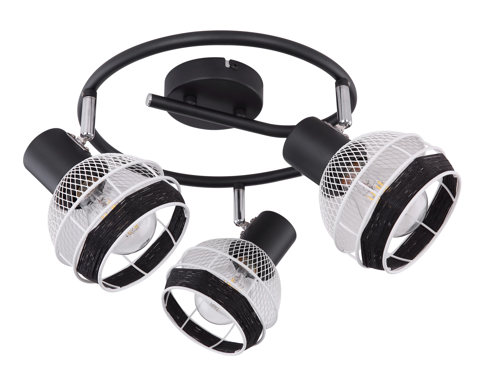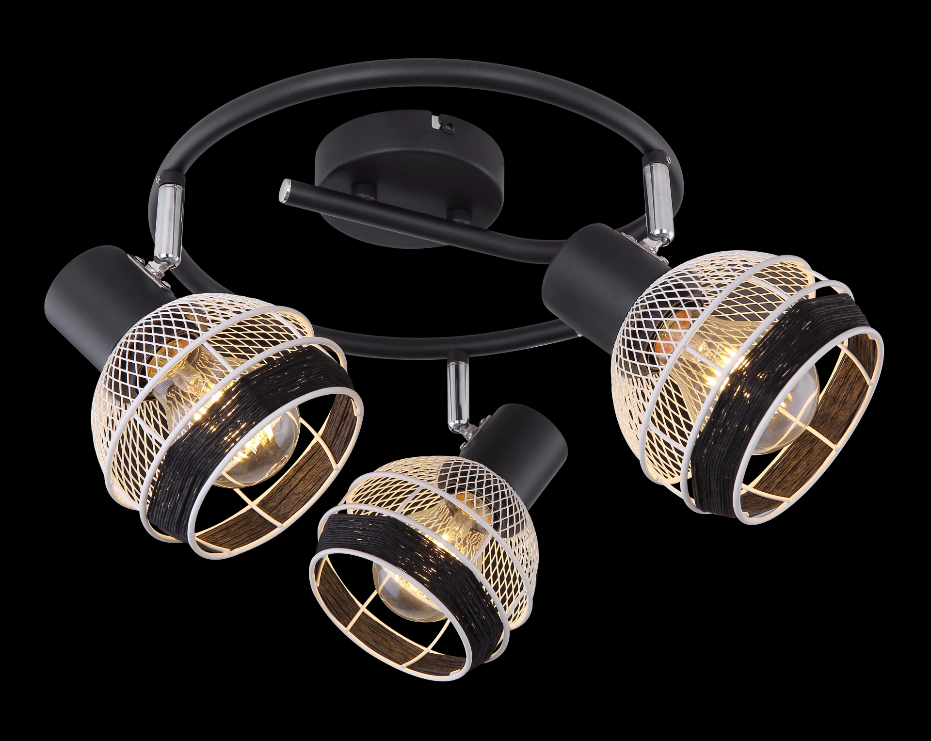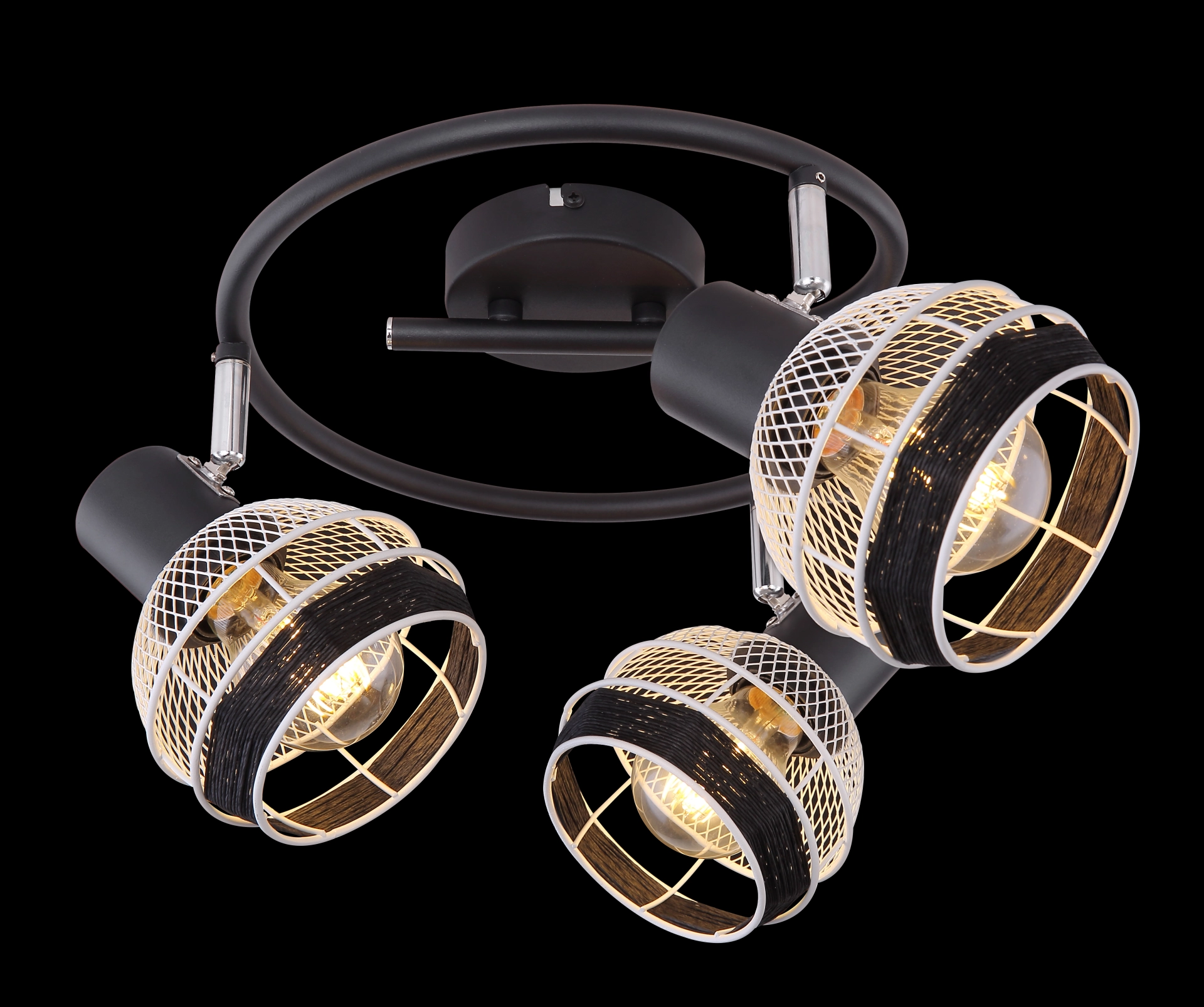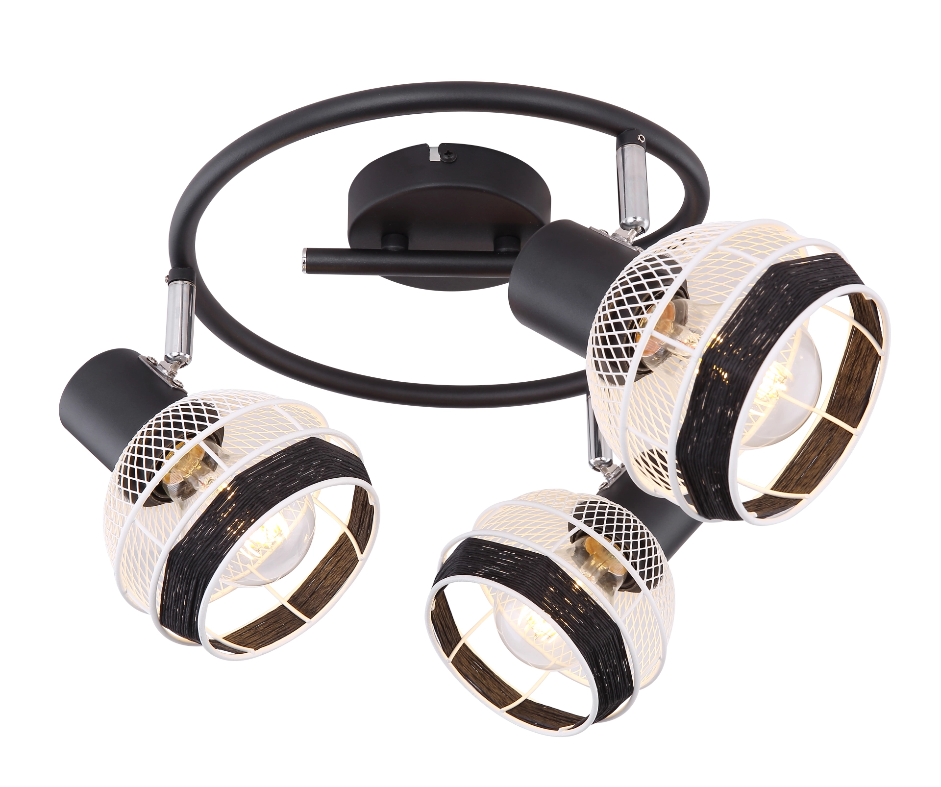 This interesting series GRIDDY combines different materials - the black-matt or white metal with the black-colored hemp rope. The three spotlights, located on an e-shaped arch, convince with the design of the lampshades, which are metal braids and are played around with a black hemp rope at the front. By freely choosing the light source (3xE27/max. 40W), you can determine the light intensity and light color of this interior lamp yourself. Due to their longevity and power savings, we recommend LED bulbs. This spotlight lamp is suitable for sleeping, hallway, living and dining room.
