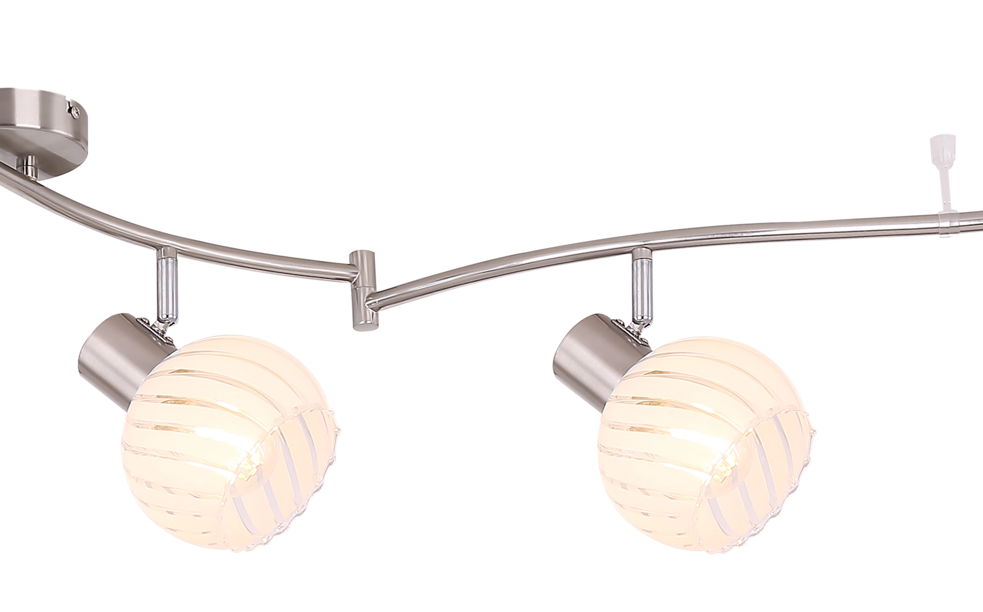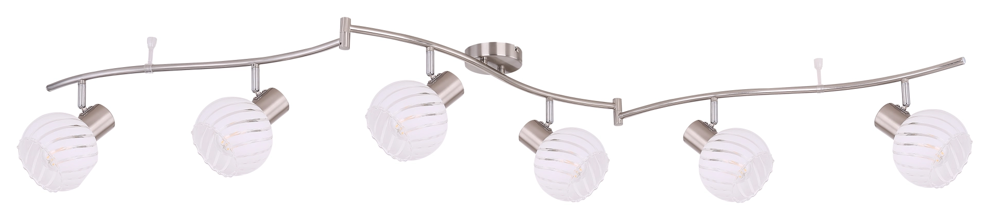 The ceiling lamp WILLY of this product series convinces by the combination of design and workmanship. The material combination of nickel-matt metal and spherical, grooved and striped clear-white glasses make for a great look. The spotlights attached to a spot system are equipped with six E27 sockets, which allow you to determine the bulb yourself (6 x max.40W) to decide on light intensity and light color. With other spotlights of the same product series you can complete the picture in your rooms.