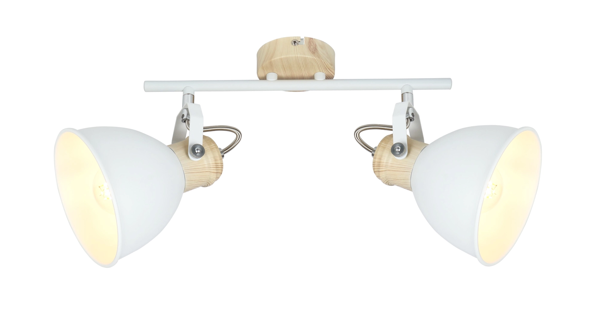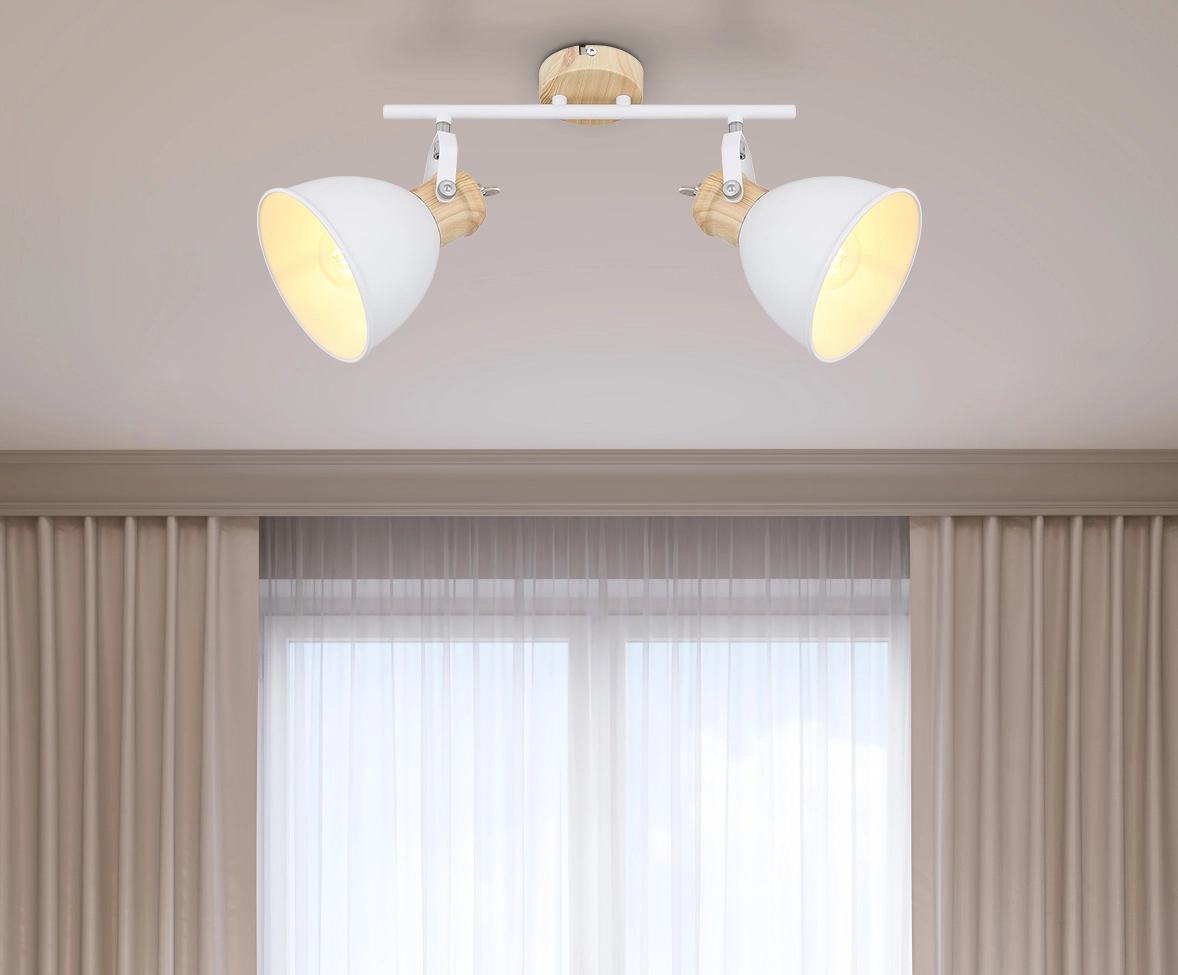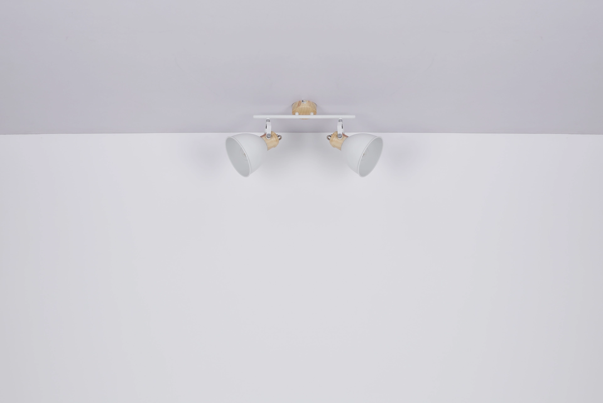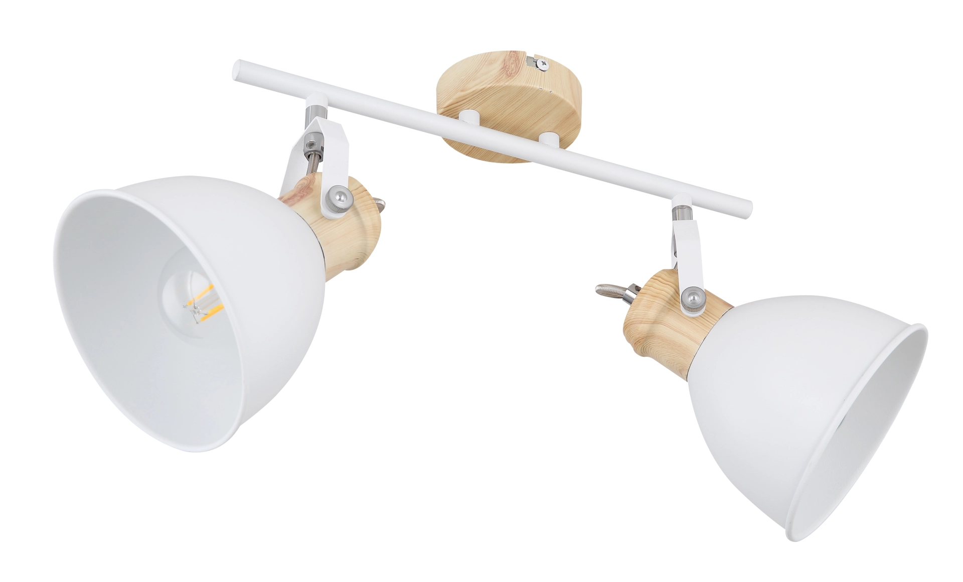 This SPOTLIGHT WIHO outshines everything with its pure, neutral optics. The white metal spotlight with wood-look elements has two lampshades attached to a rail. This interior lamp is suitable for bedrooms, children's, hallways and living rooms. This luminaire has two E27 sockets, for which the bulbs can be freely selected. Due to their longevity and power savings, we recommend LED bulbs.