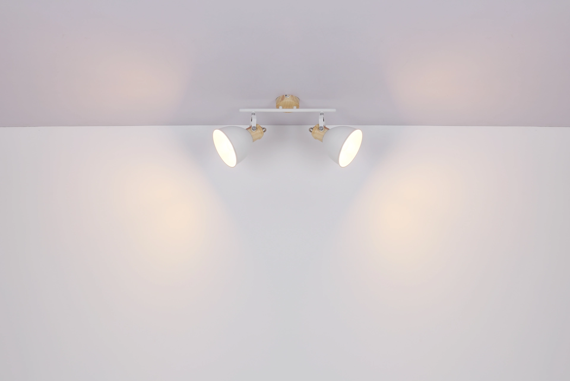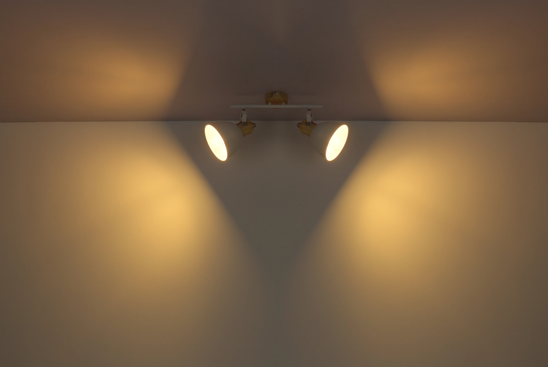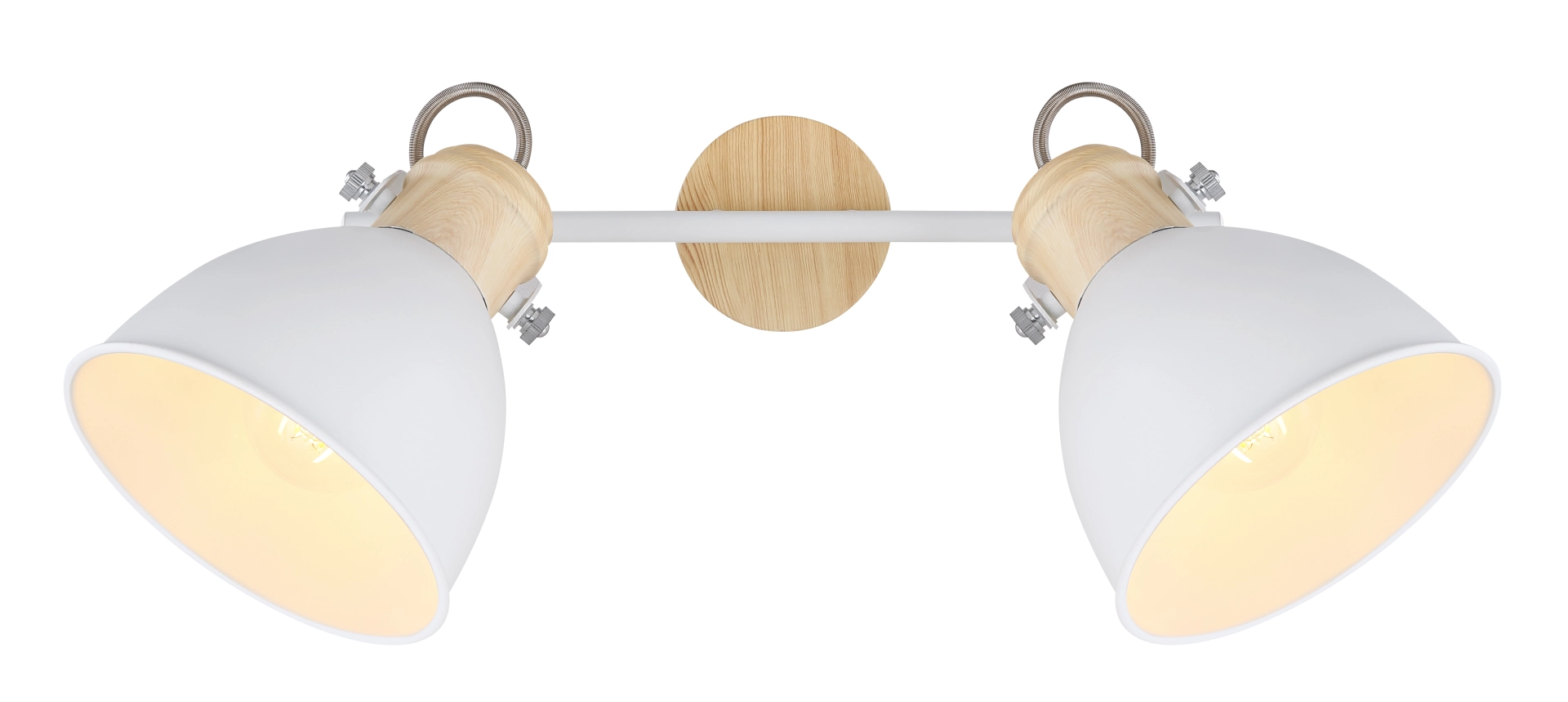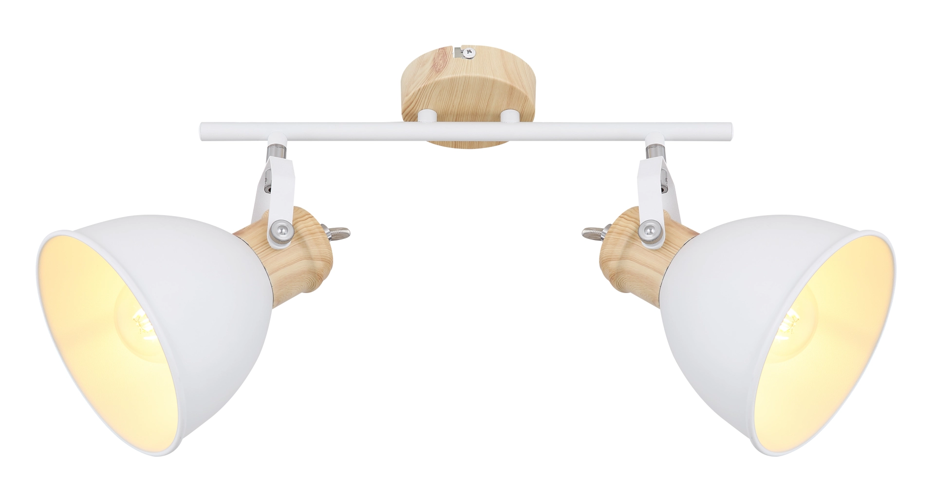 This SPOTLIGHT WIHO outshines everything with its pure, neutral optics. The white metal spotlight with wood-look elements has two lampshades attached to a rail. This interior lamp is suitable for bedrooms, children's, hallways and living rooms. This luminaire has two E27 sockets, for which the bulbs can be freely selected. Due to their longevity and power savings, we recommend LED bulbs.