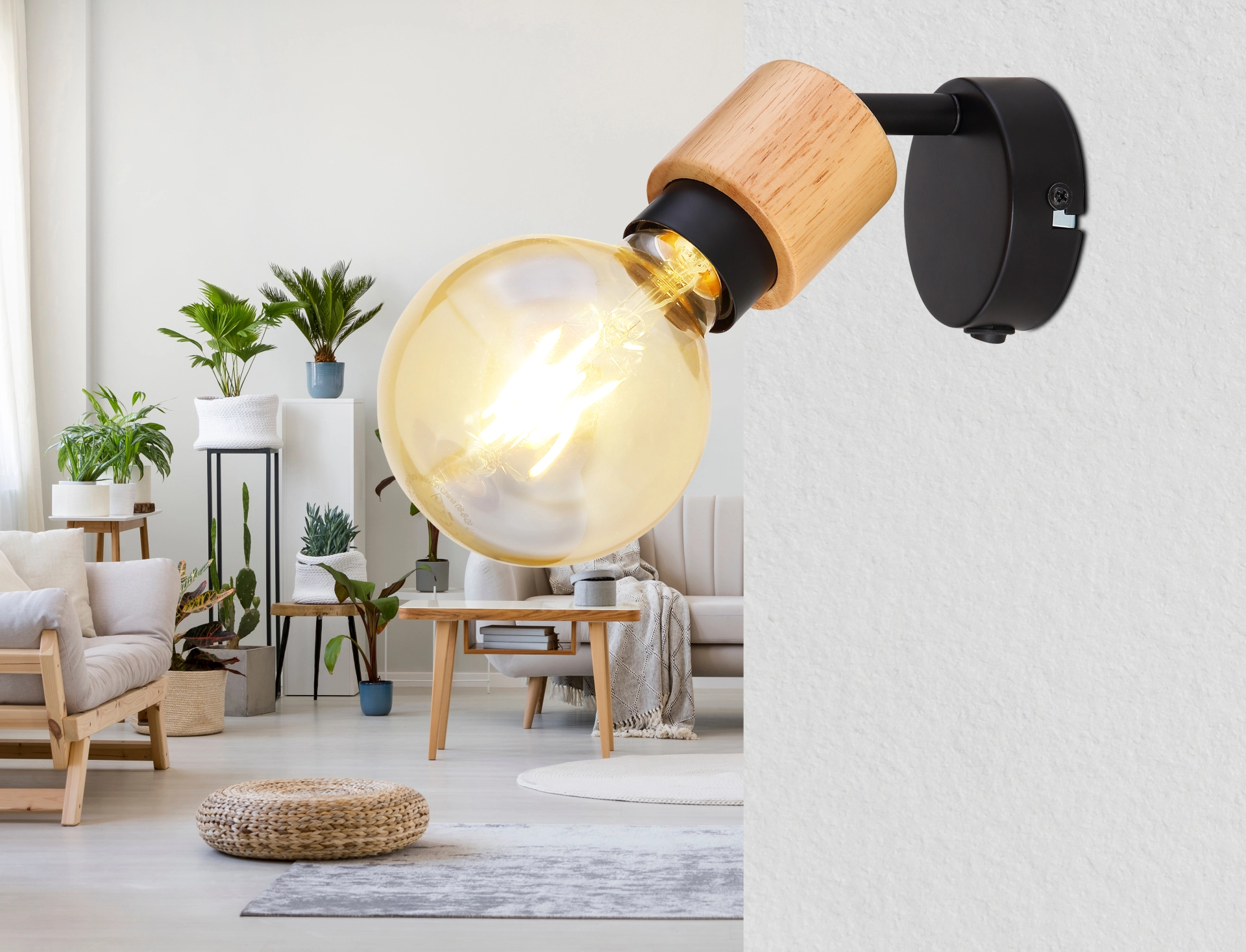 This spotlight from the Jorna series convinces with its stylish design made of wood and black-matt metal. The 9.5 cm large, swiveling spotlight has an included switch for switching on and off and can be equipped with an E27 bulb of your choice. This gives you the opportunity to determine the light color and brightness according to your ideas. With several articles of the Jorna series, you can complete the overall picture of your interiors and create a stylish atmosphere.
