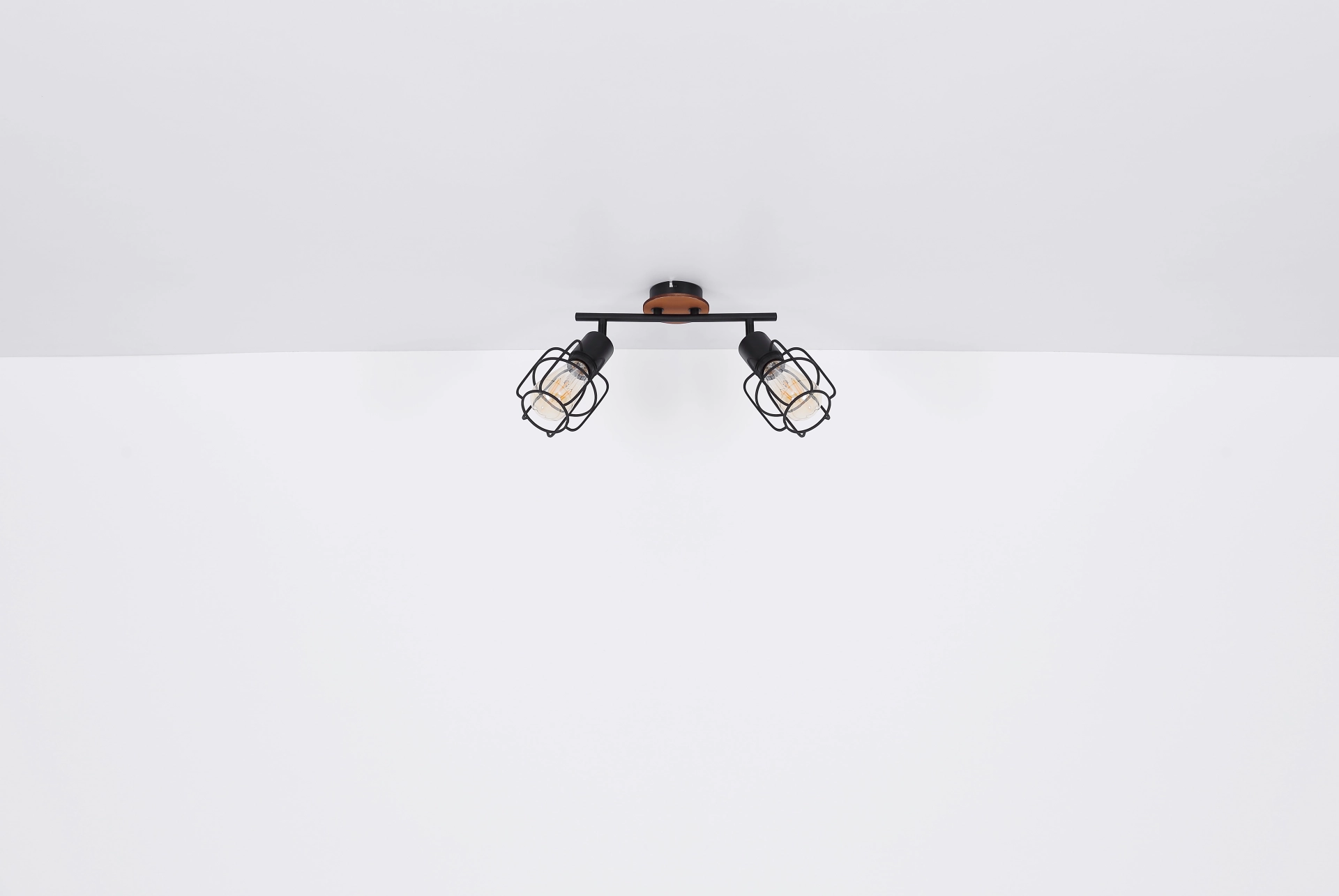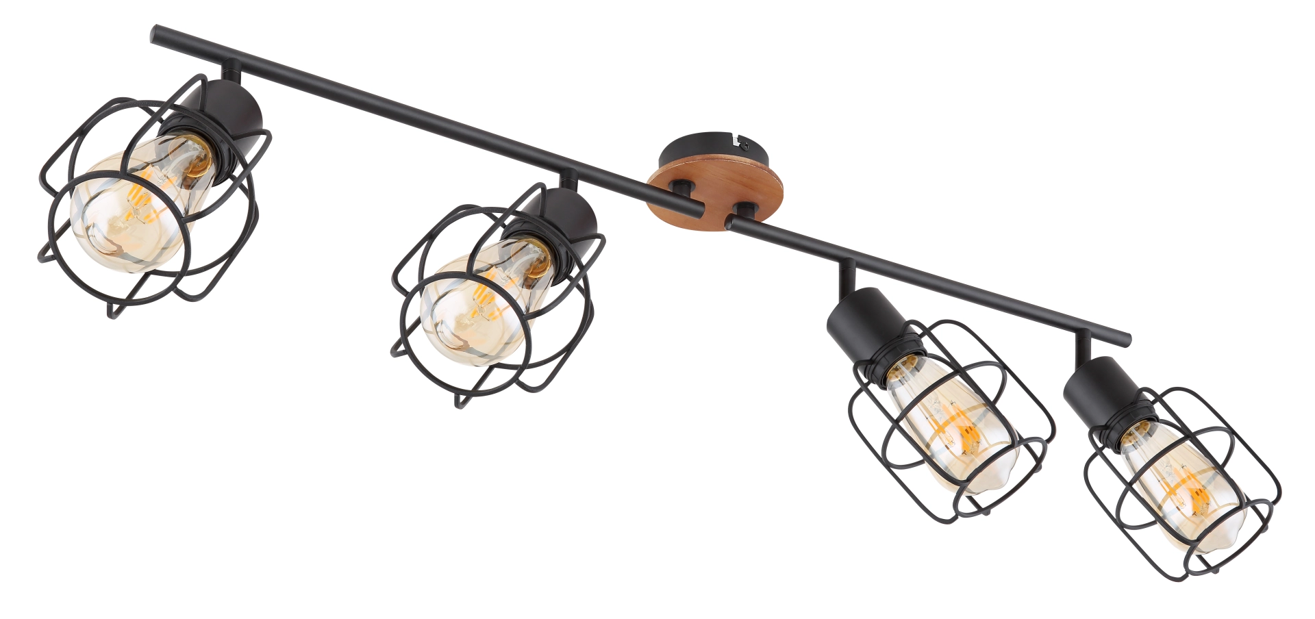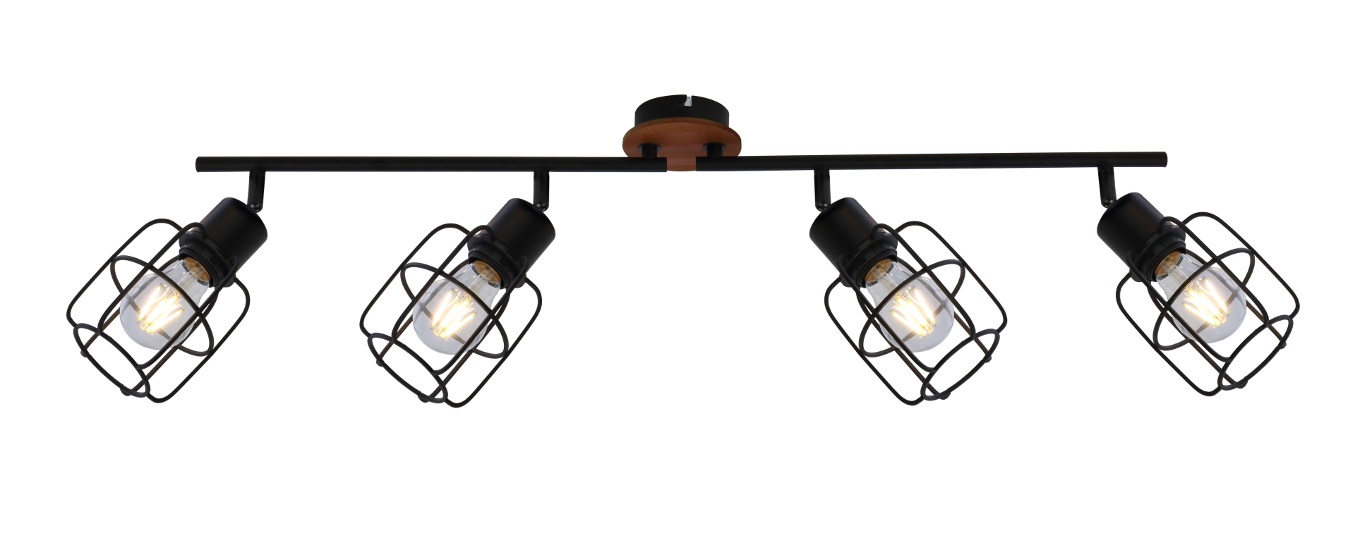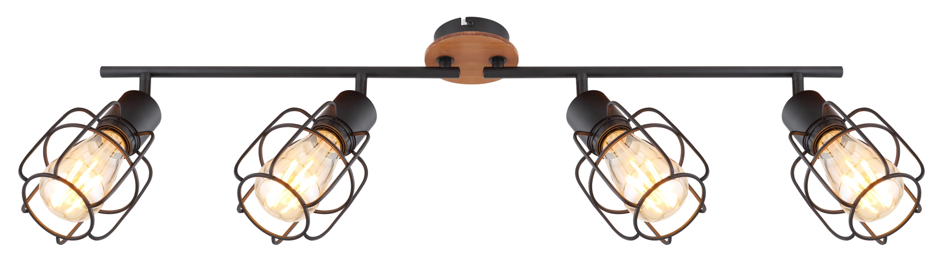 This ceiling spotlight from the Willa series convinces with its simple design made of black metal. The 80 cm long spotlight consists of a round wooden plate to which two metal rods are fixed. These are each equipped with two swivelling E27 sockets framed by black metal with a metal grid shade, which can be equipped with suitable lamps of your choice. This enables you to individually determine light color and brightness. Through several articles of the same series, you can combine this spotlight wonderfully and provide a stylish ambience in your interiors.