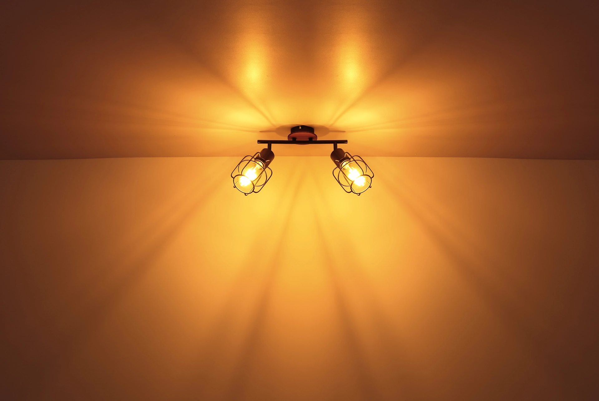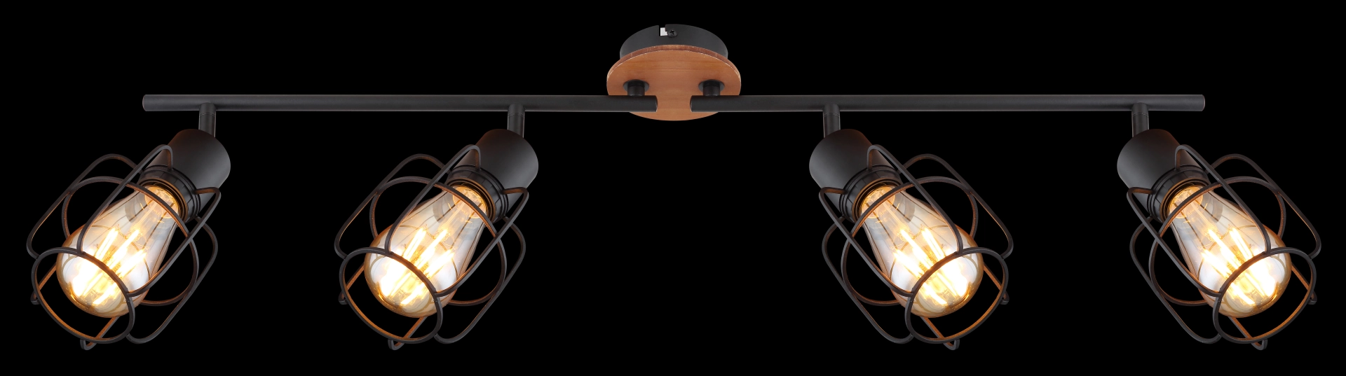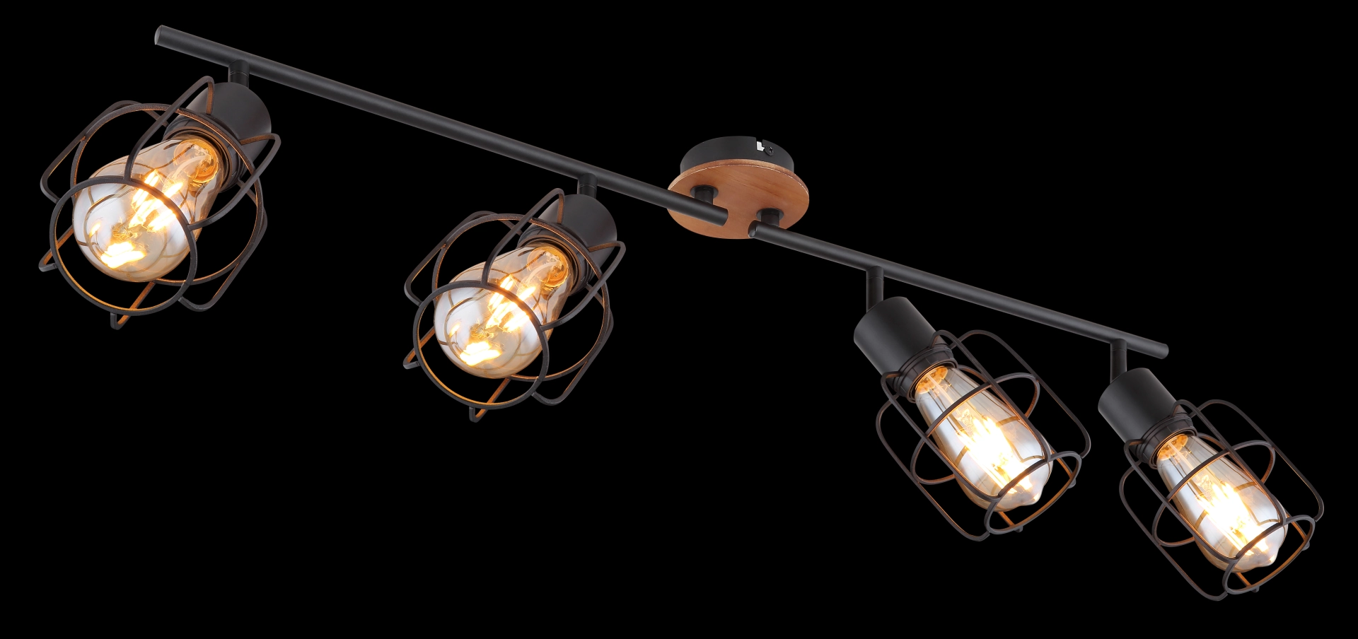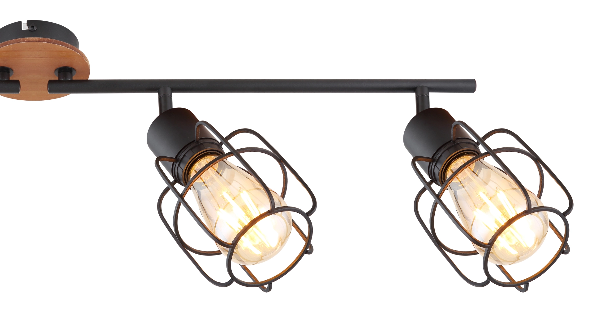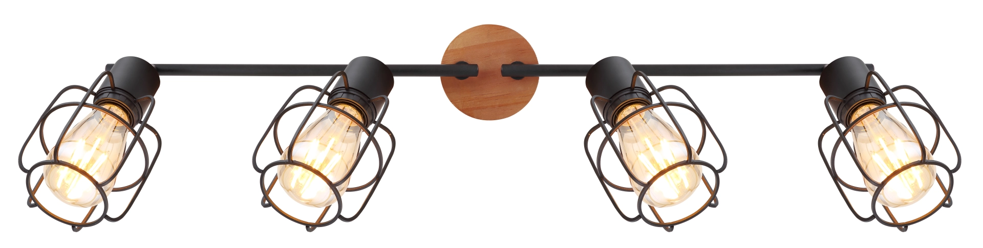 This ceiling spotlight from the Willa series convinces with its simple design made of black metal. The 80 cm long spotlight consists of a round wooden plate to which two metal rods are fixed. These are each equipped with two swivelling E27 sockets framed by black metal with a metal grid shade, which can be equipped with suitable lamps of your choice. This enables you to individually determine light color and brightness. Through several articles of the same series, you can combine this spotlight wonderfully and provide a stylish ambience in your interiors.