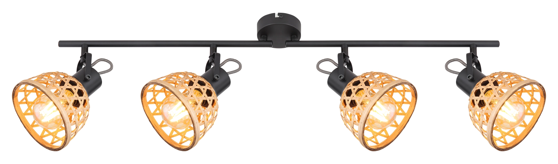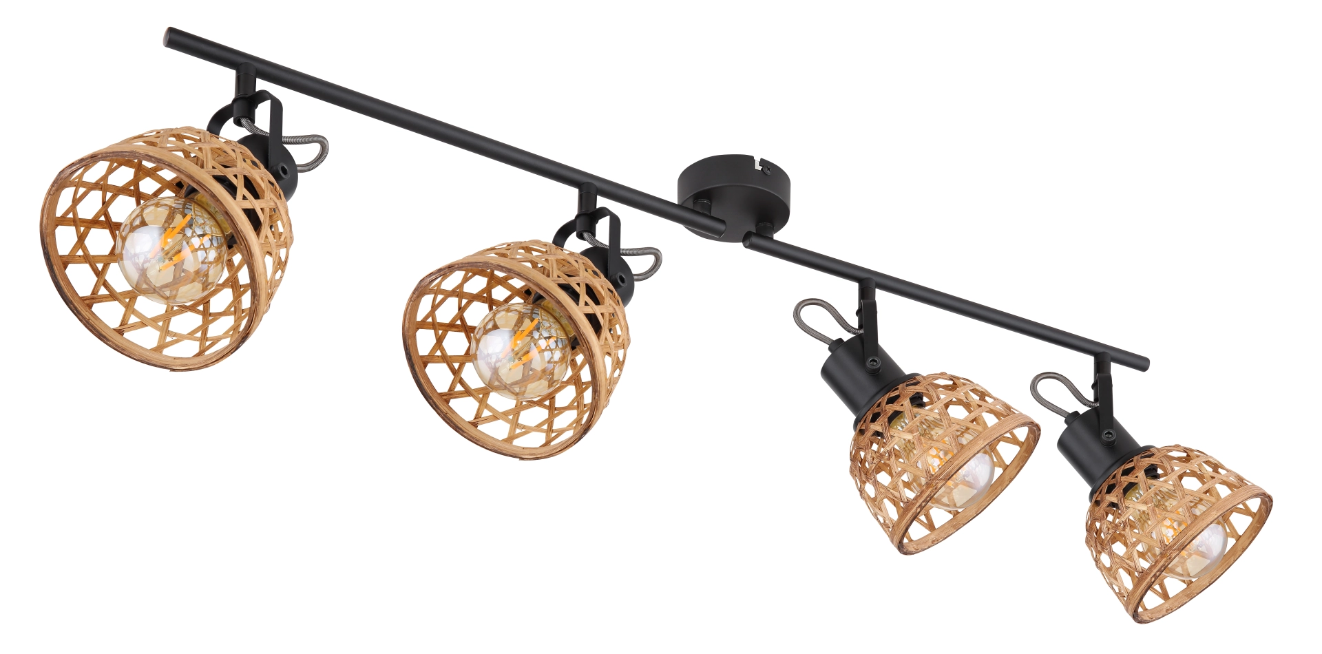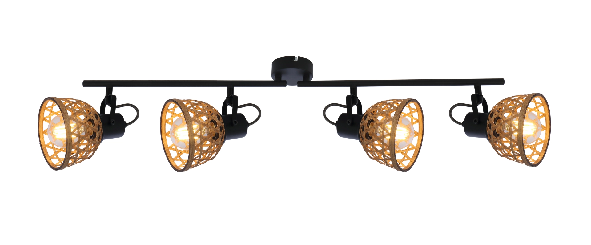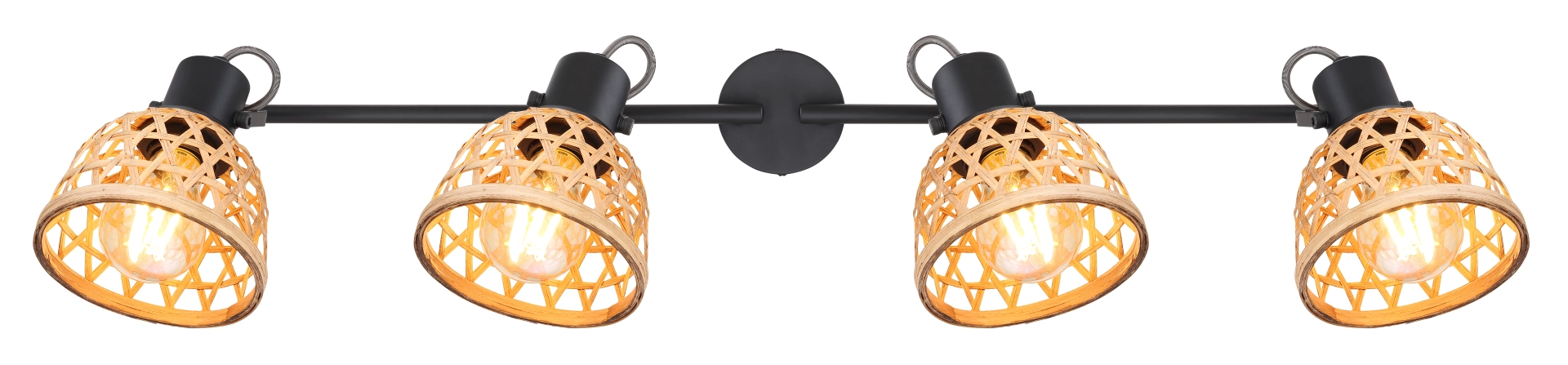 This ceiling spotlight from the Wenna series fits wonderfully into the ambience of various living styles. The 80 cm long spotlight consists of two black metal rods, each of which has two swivelling E27 sockets coated in black-matt metal, which have shapely bamboo grid shades. You can equip them with suitable bulbs of your choice, which enables you to individually determine the light color and brightness. With other models of the same series, you can complete the overall picture in your interiors.