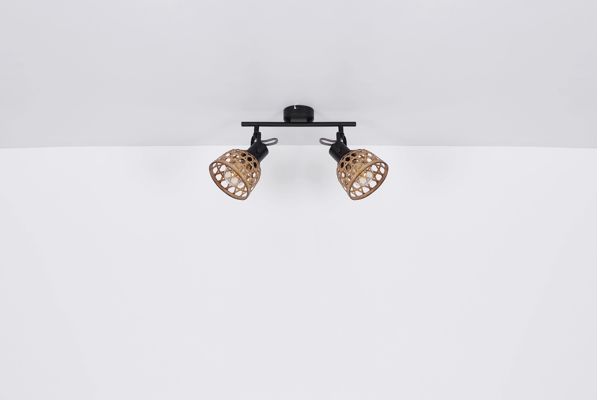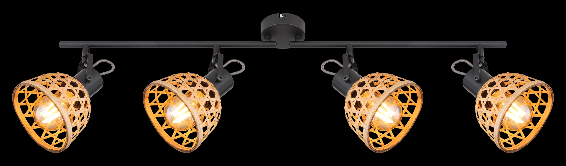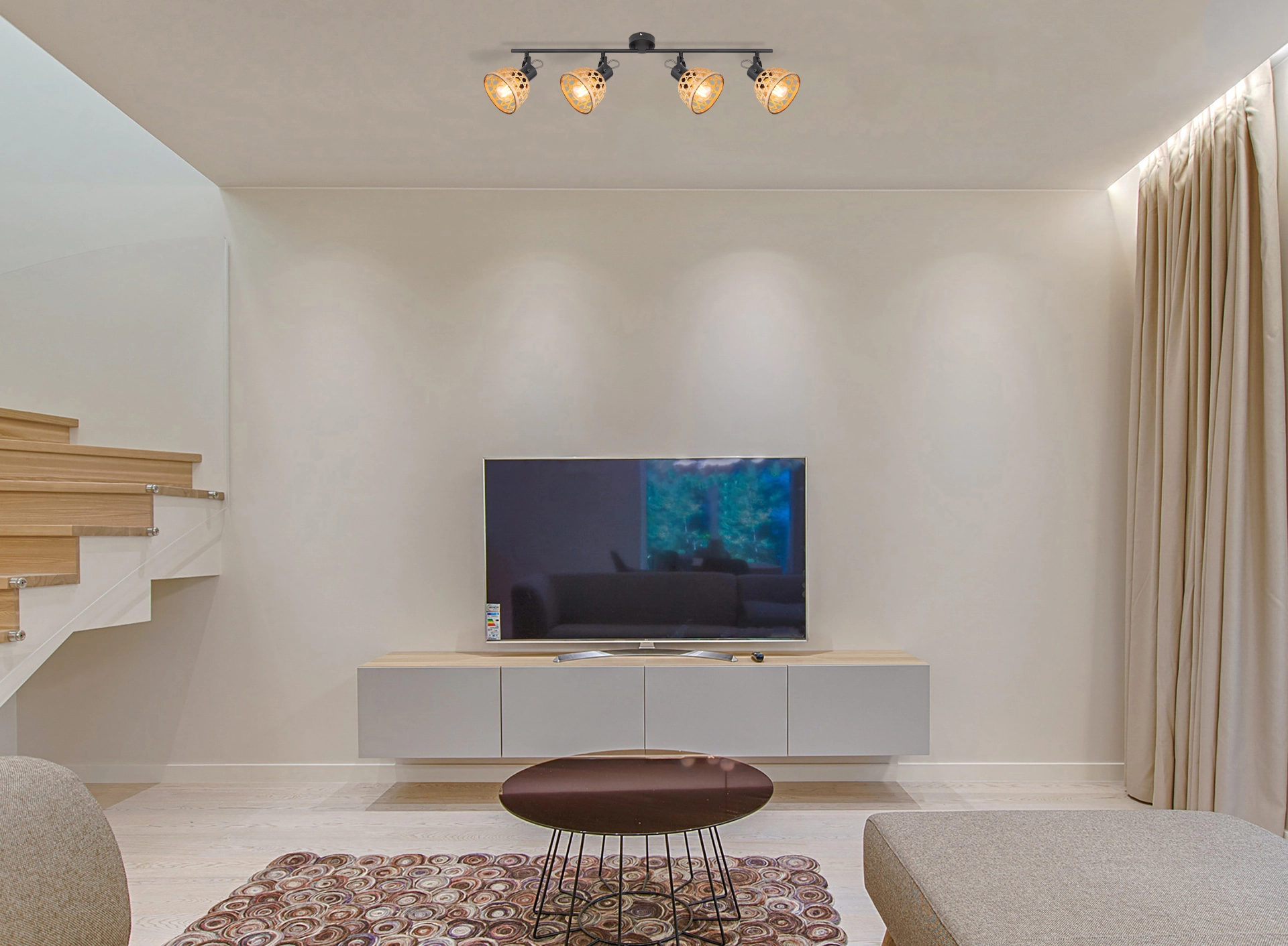 This ceiling spotlight from the Wenna series fits wonderfully into the ambience of various living styles. The 80 cm long spotlight consists of two black metal rods, each of which has two swivelling E27 sockets coated in black-matt metal, which have shapely bamboo grid shades. You can equip them with suitable bulbs of your choice, which enables you to individually determine the light color and brightness. With other models of the same series, you can complete the overall picture in your interiors.