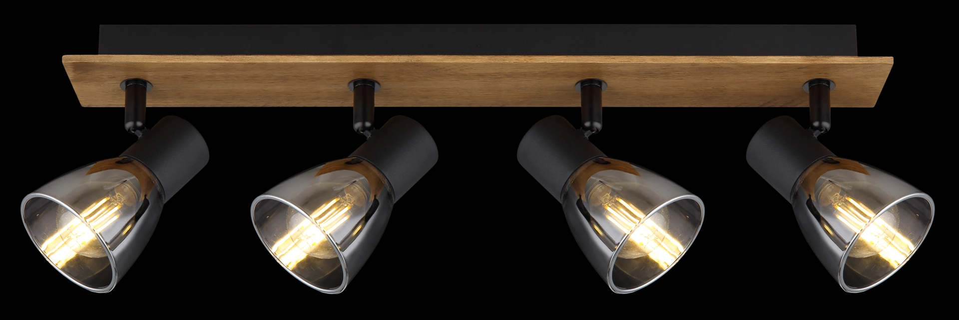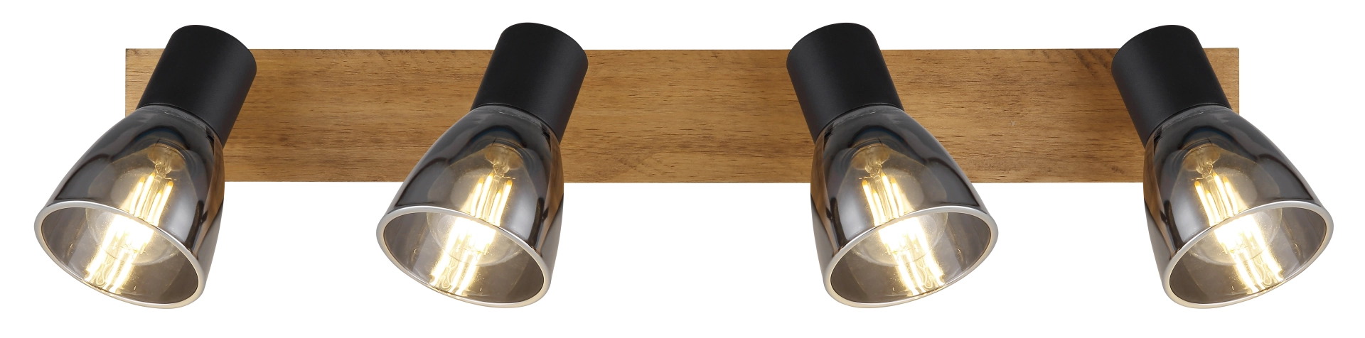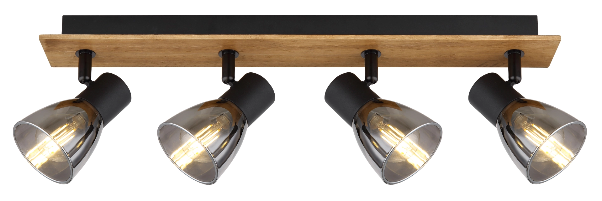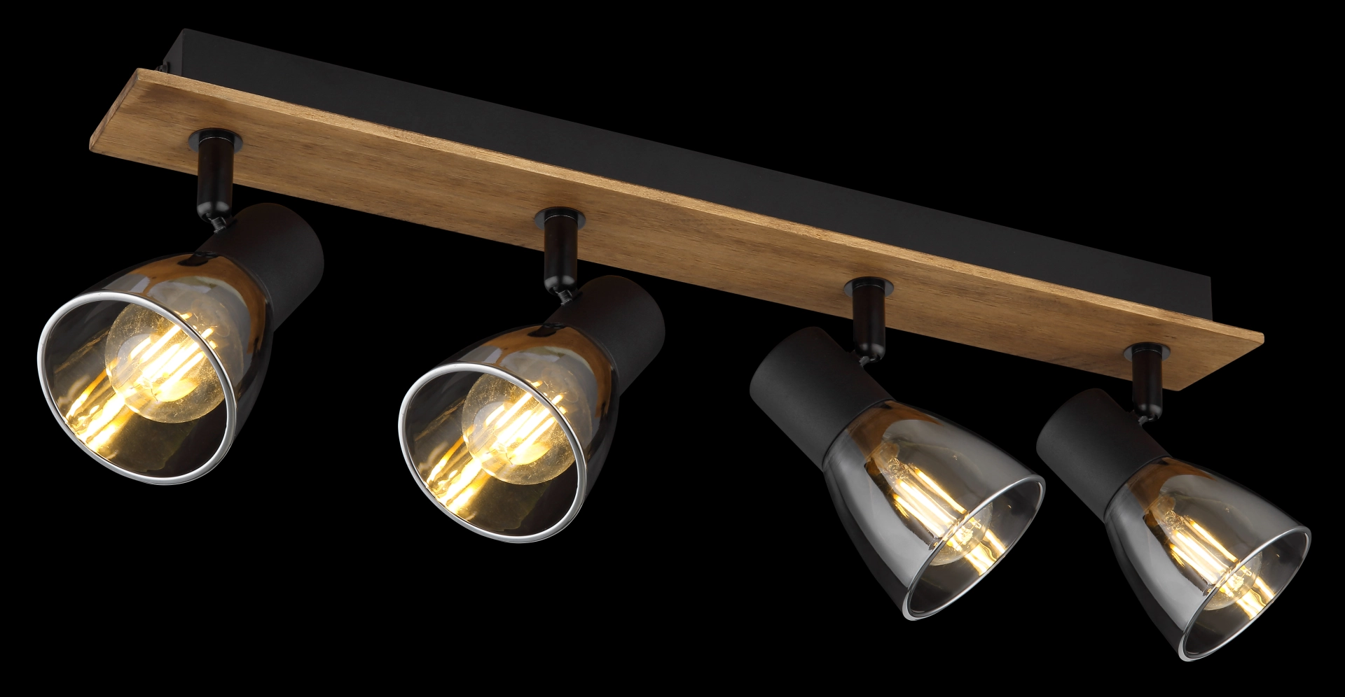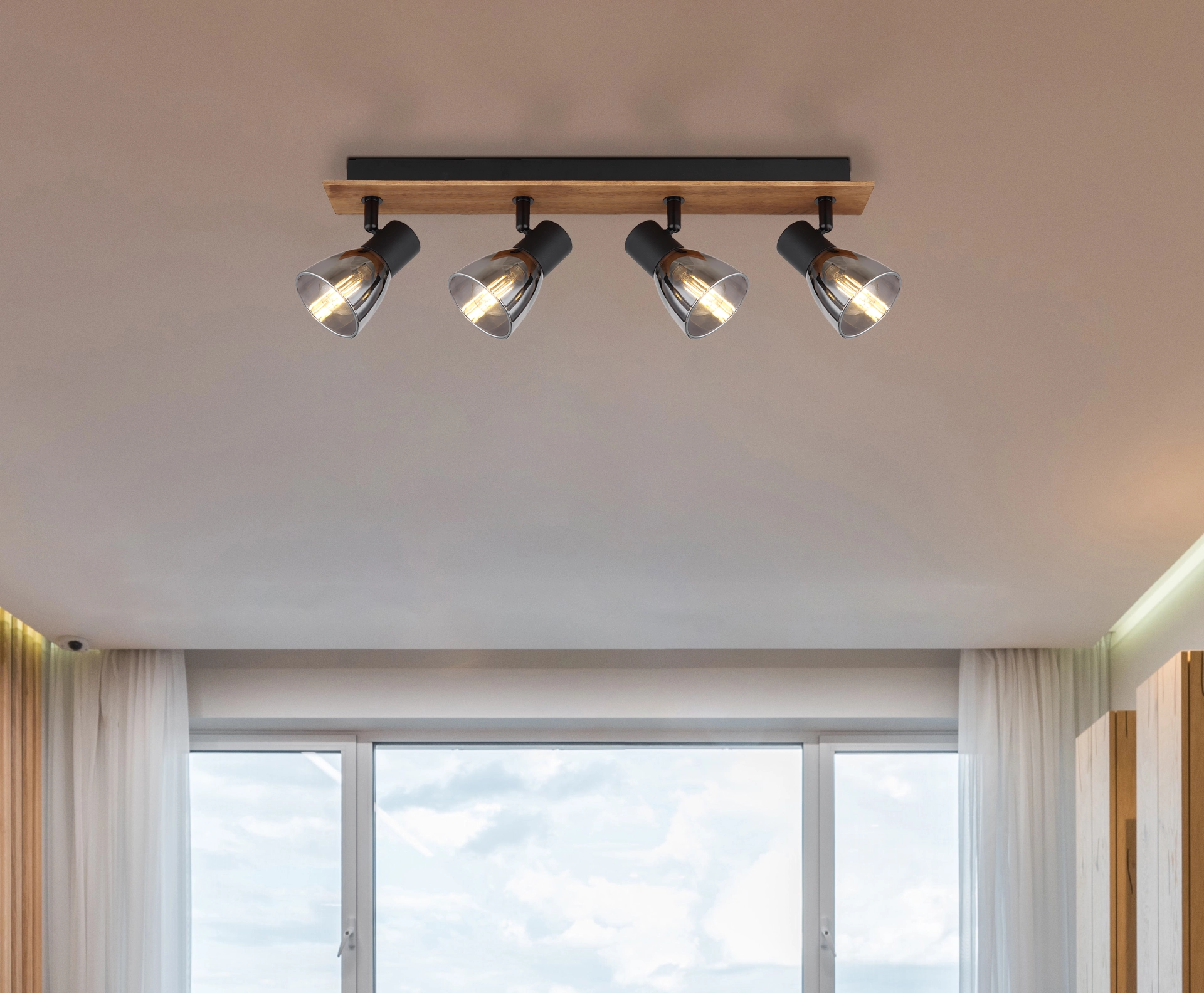 This beautiful spotlight of the Claude series in black metal inspires with great design. On a rectangular ceiling attachment with wood decorations (50x7cm) there are four E14 sockets, each with a beautiful glass shade in smoke colors (Ø7cm). The luminaire is switched by means of an ON/OFF switch. The E14 socket gives you the opportunity to determine the light color and brightness up to a maximum power of 40 watts. With other models of this series you can complement your living area wonderfully.