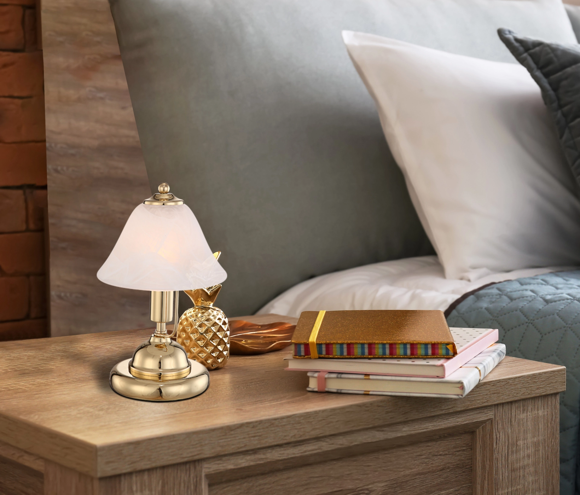 This stylish table lamp consists of a brass-look frame and provides an elegant living ambience and also provides an extremely pleasant light. Looking for a lamp that emphasizes the furnishing style, this model is an excellent choice. In addition, it can be easily operated using a touch dimmer.