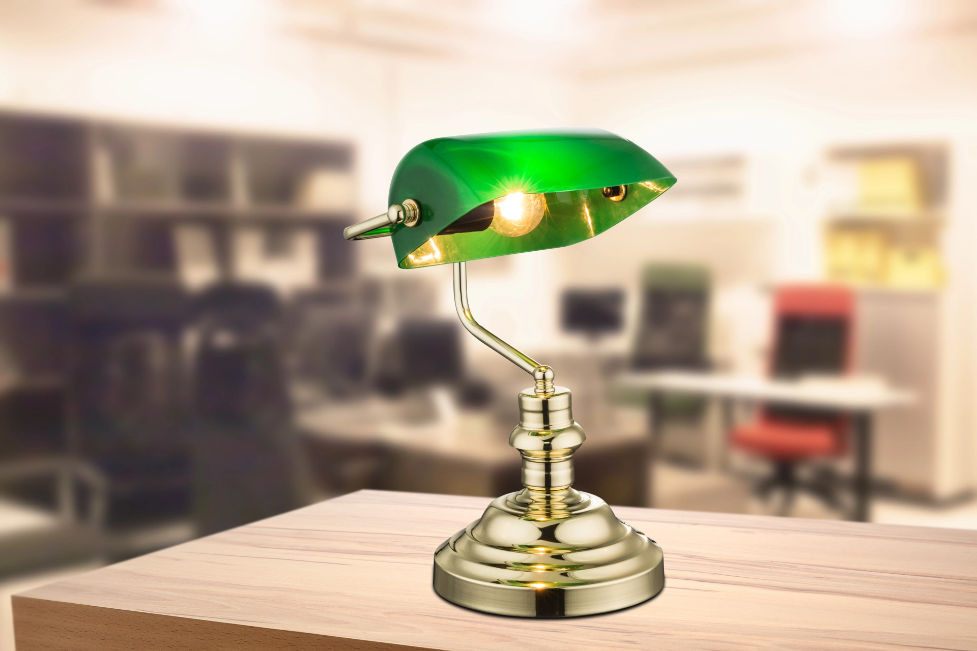 This table lamp in classic banker style combines serious professionalism with cozy cosiness. However, one thing is certain, this model made of brass is guaranteed to enhance the living atmosphere. It is also energy efficient, as it can be used with LED bulbs.