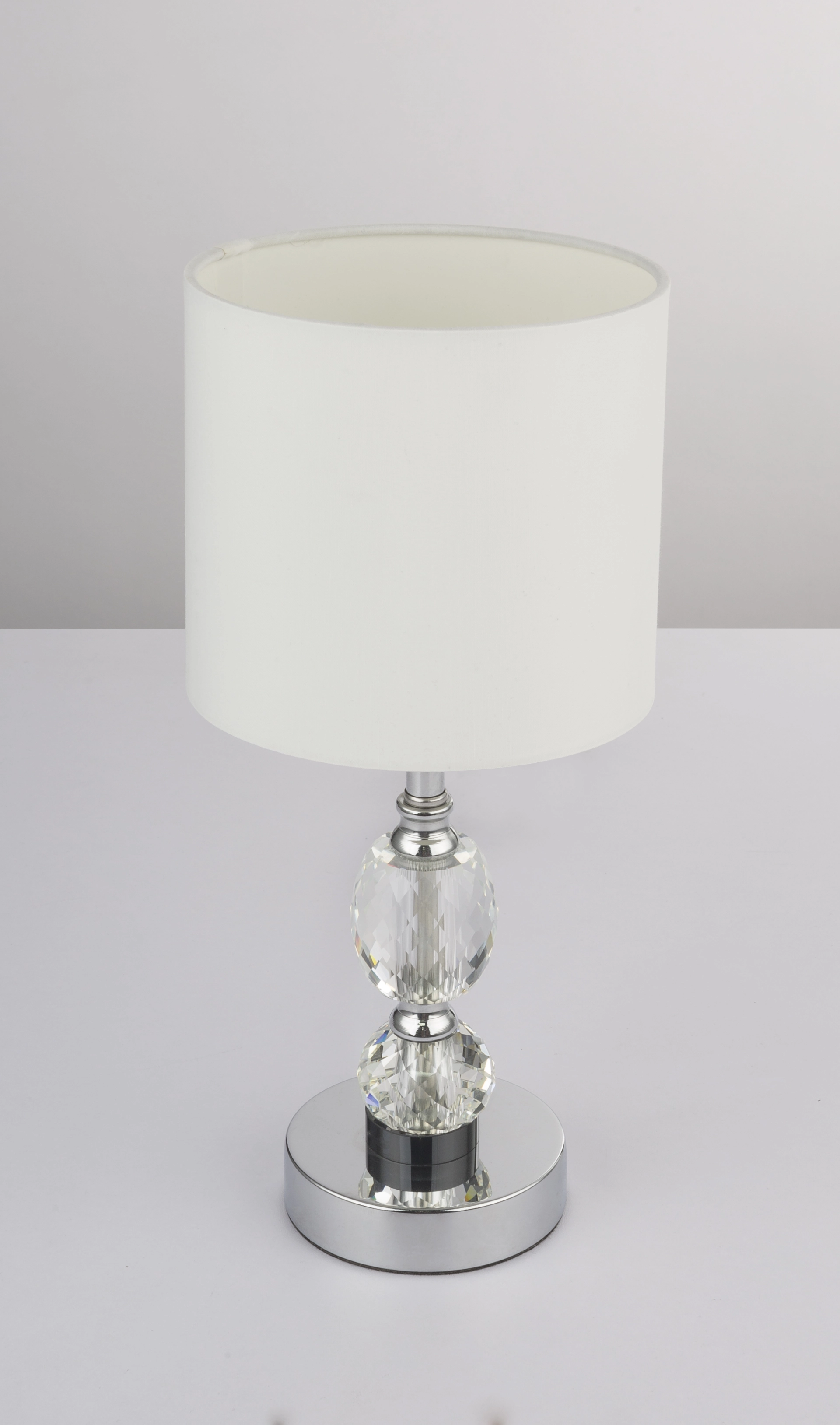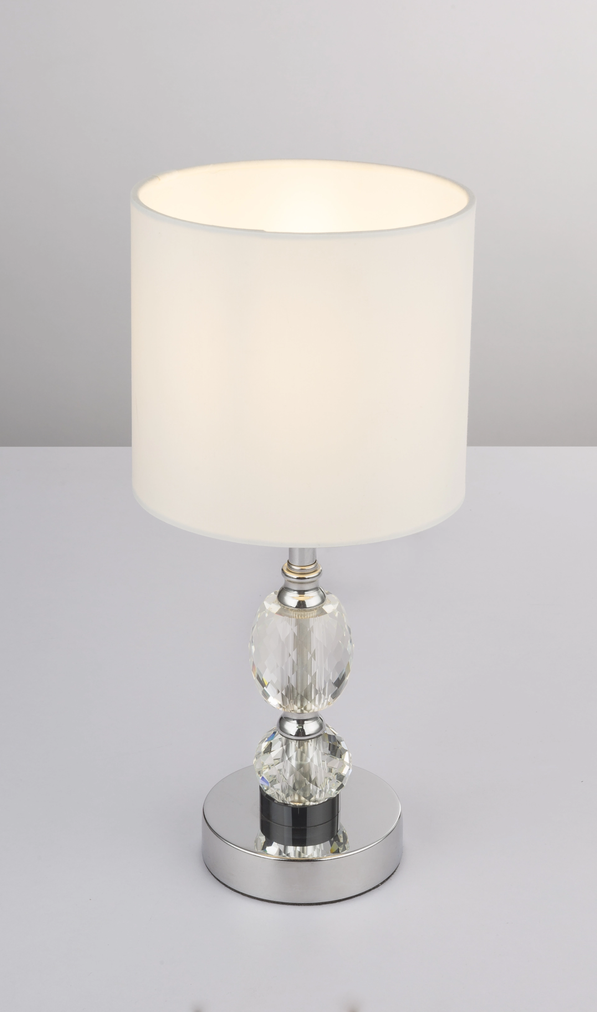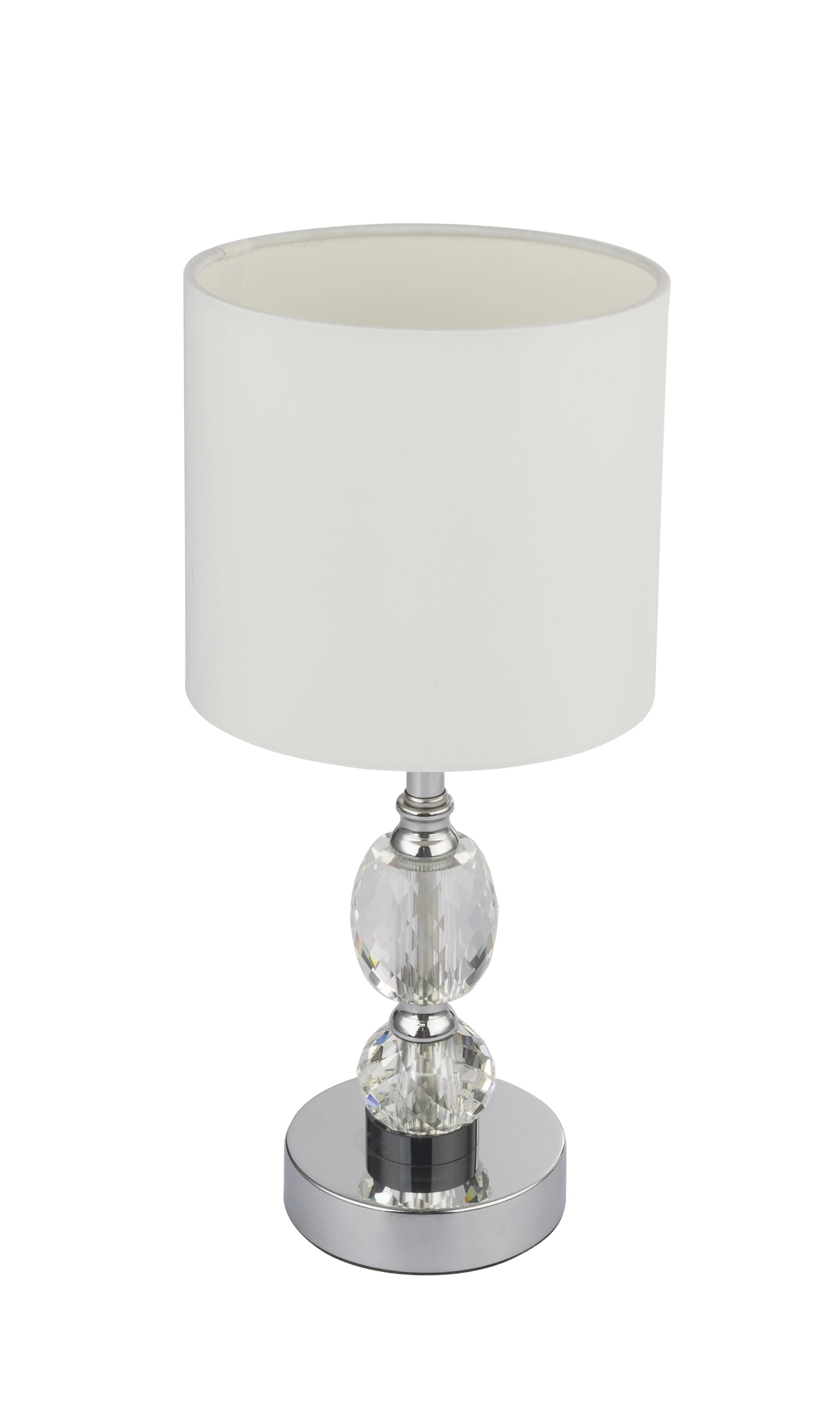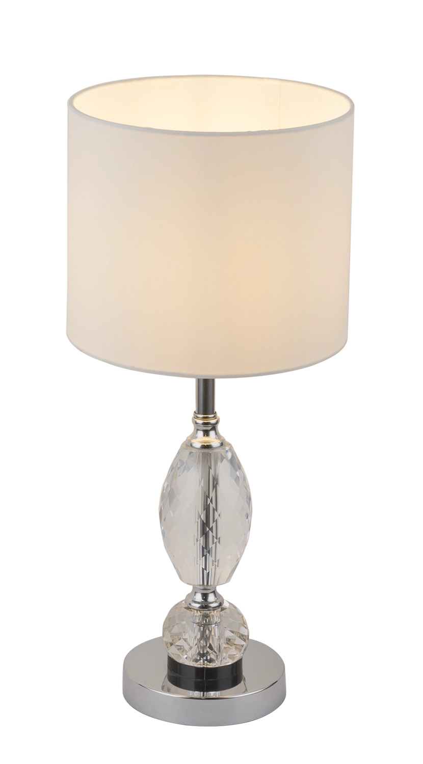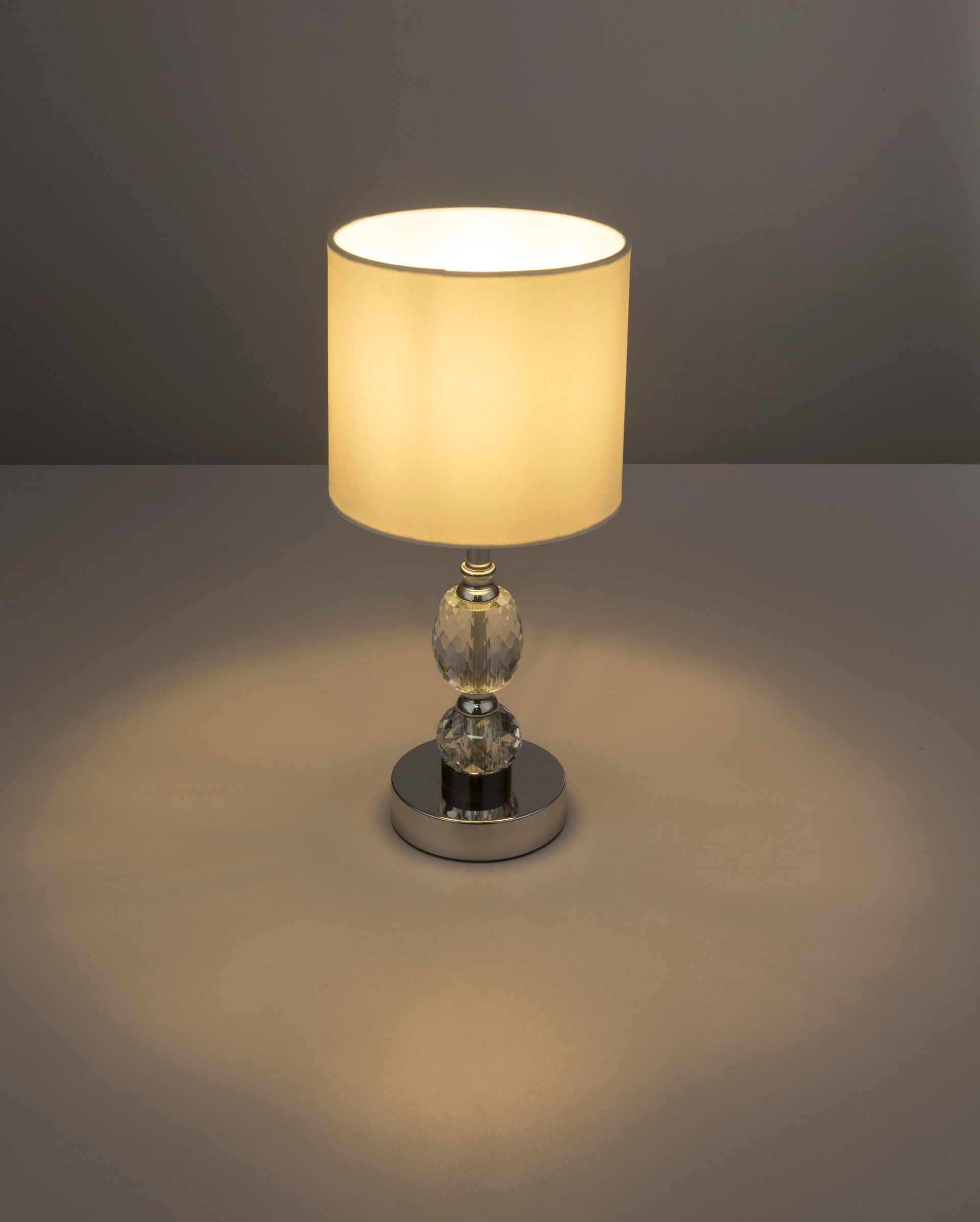 The strikingly elegant and noble 34cm table lamp of this model series scores with timeless design and great materials. The white round textile shade (Ø15cm), attached to a great base made of chrome-plated metal and clear crystal, is the classic among table lamps. While this indoor lamp has an on/off scarf, the available E14 socket allows you to determine the bulb and thus the light intensity and light color yourself (max.40W). Due to their power savings and longevity, we recommend LED lamps.