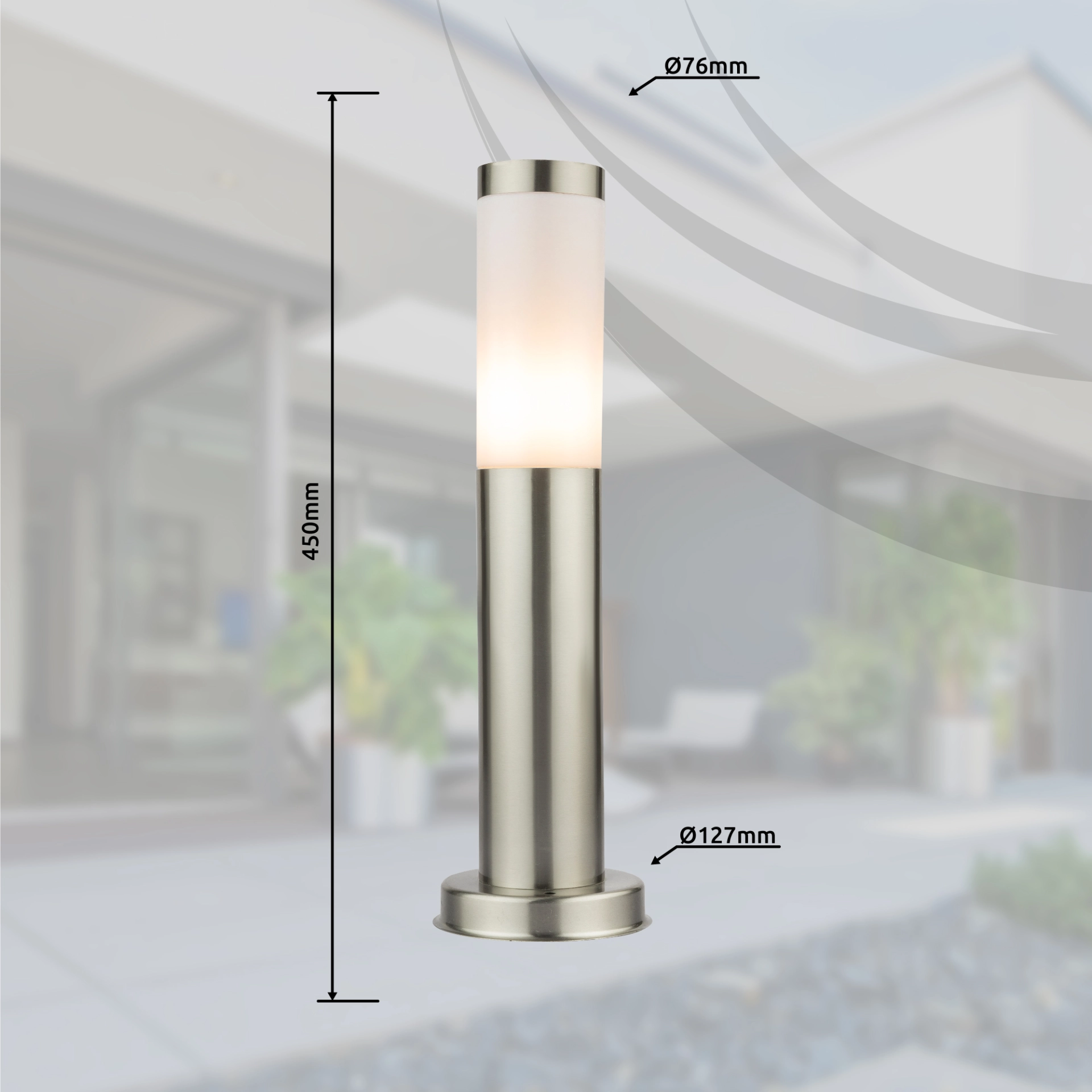 The elegant outdoor pedestal lamp of the Boston series is characterized by its stylish design and great workmanship. Due to its IP44 degree of protection, the base luminaire is ideally suited for outdoor use. This model is made of stainless steel and opal plastic and has a total size of 45 cm. The lamp is equipped with an E27 socket and allows you to use a bulb (max. 60W) of your choice. With other base lamps and wall lamps of the same product series you can complete the picture.