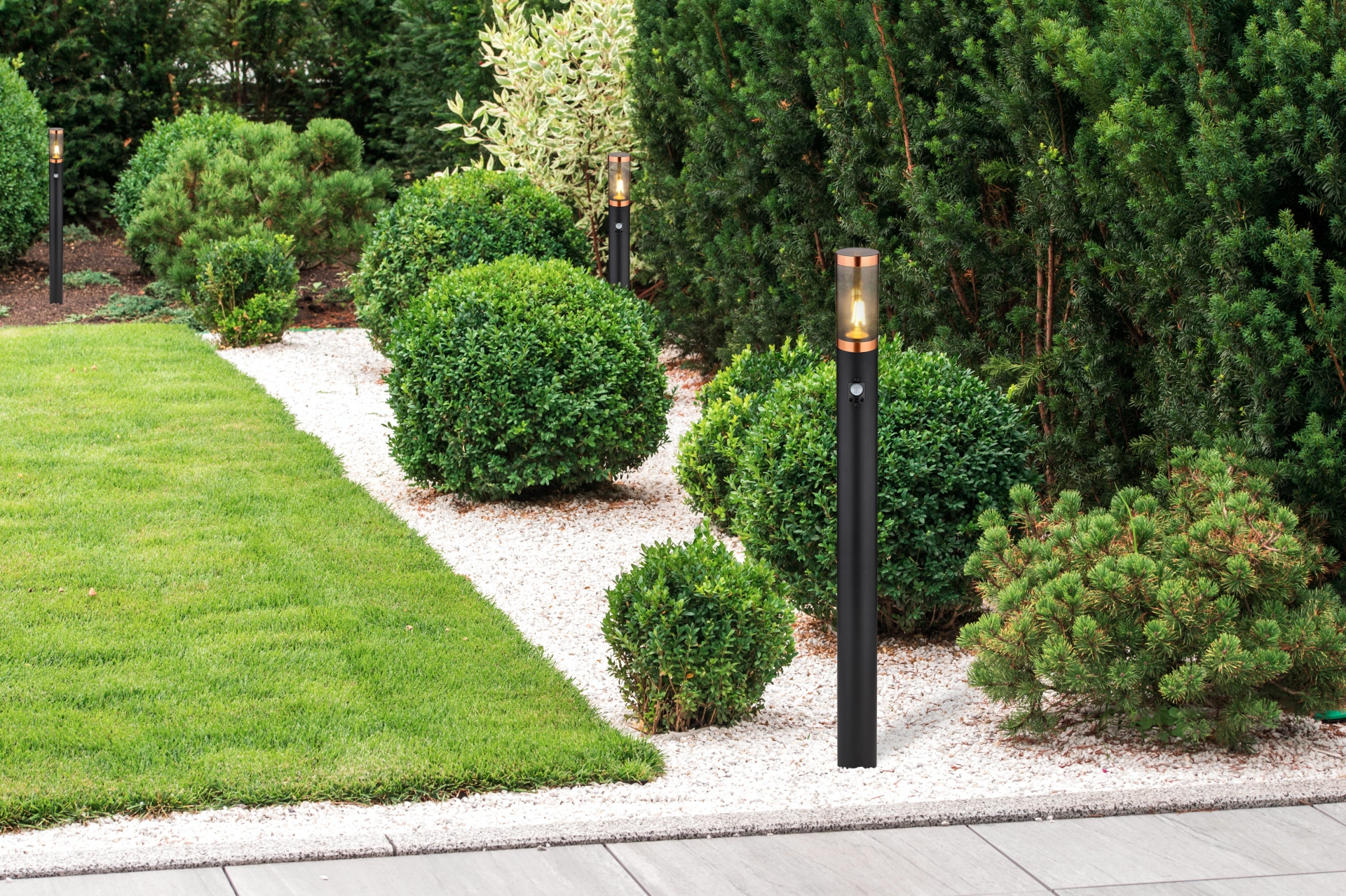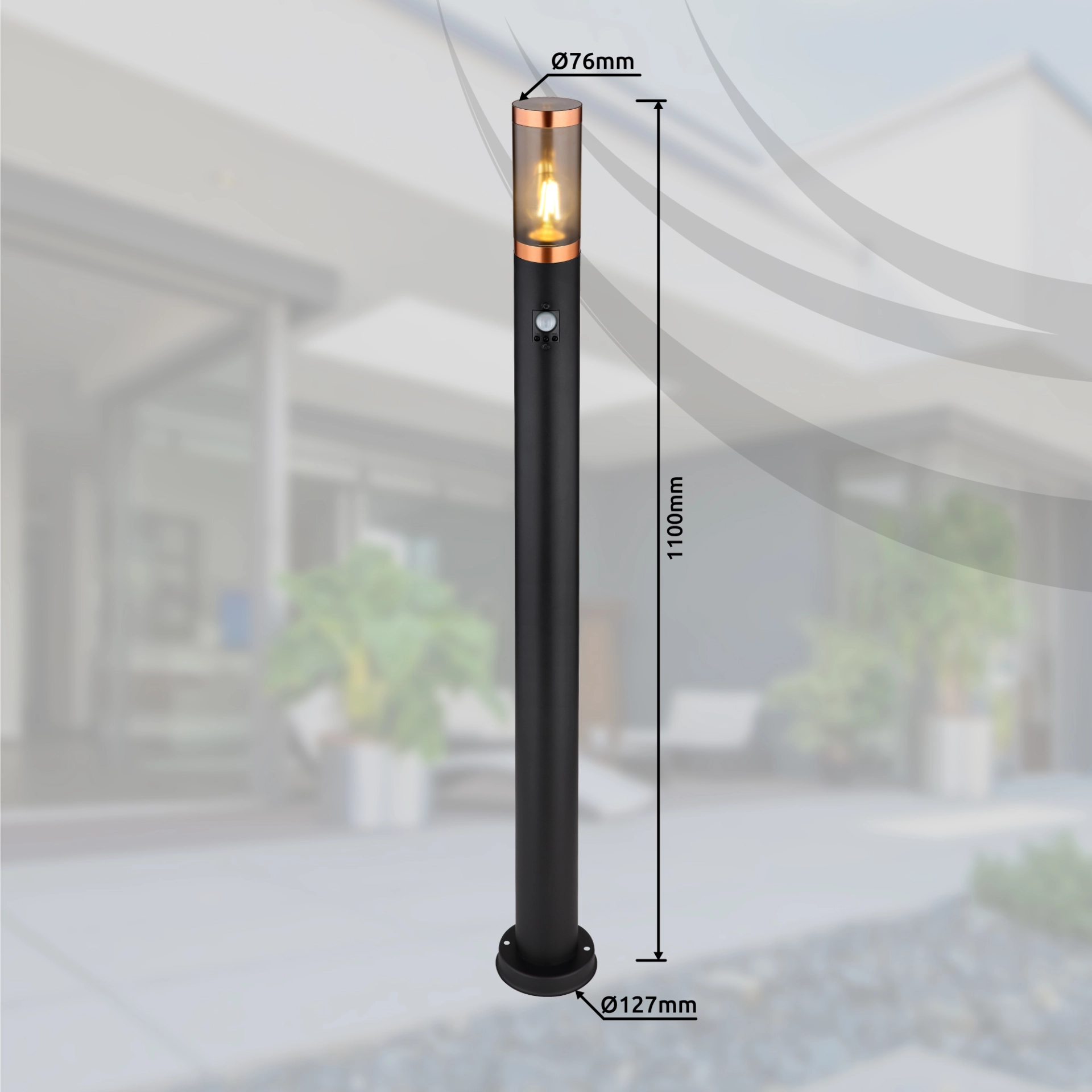 This elegant base lamp of the Boston series is characterized by its stylish design and great workmanship. The shapely outdoor lamp is ideally suited for outdoor use due to its IP44 degree of protection. This model is made of black stainless steel and opal plastic and has a total size of 110 cm. The lamp is equipped with an E27 socket and allows you to use a bulb (max. 15W) of your choice. Due to their power savings and longevity, we recommend LED lamps. An additional advantage is the integrated motion detector (90°) with a range of up to 9 meters. With other base lamps and wall lamps of the same product series you can complete the picture.