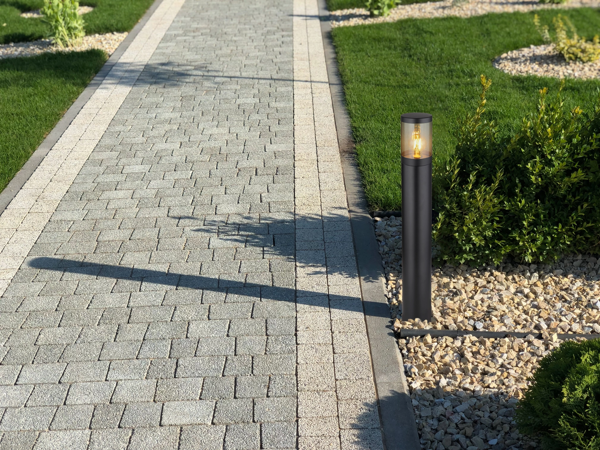 This great outdoor lamp inspires with modern design. An 80 cm cylindrical housing with smoky glass protrudes from a round base with an E27 socket. This allows you to determine up to a maximum power of 60 watts, even by light color and brightness. Due to longevity and power savings, we recommend LED bulbs.
