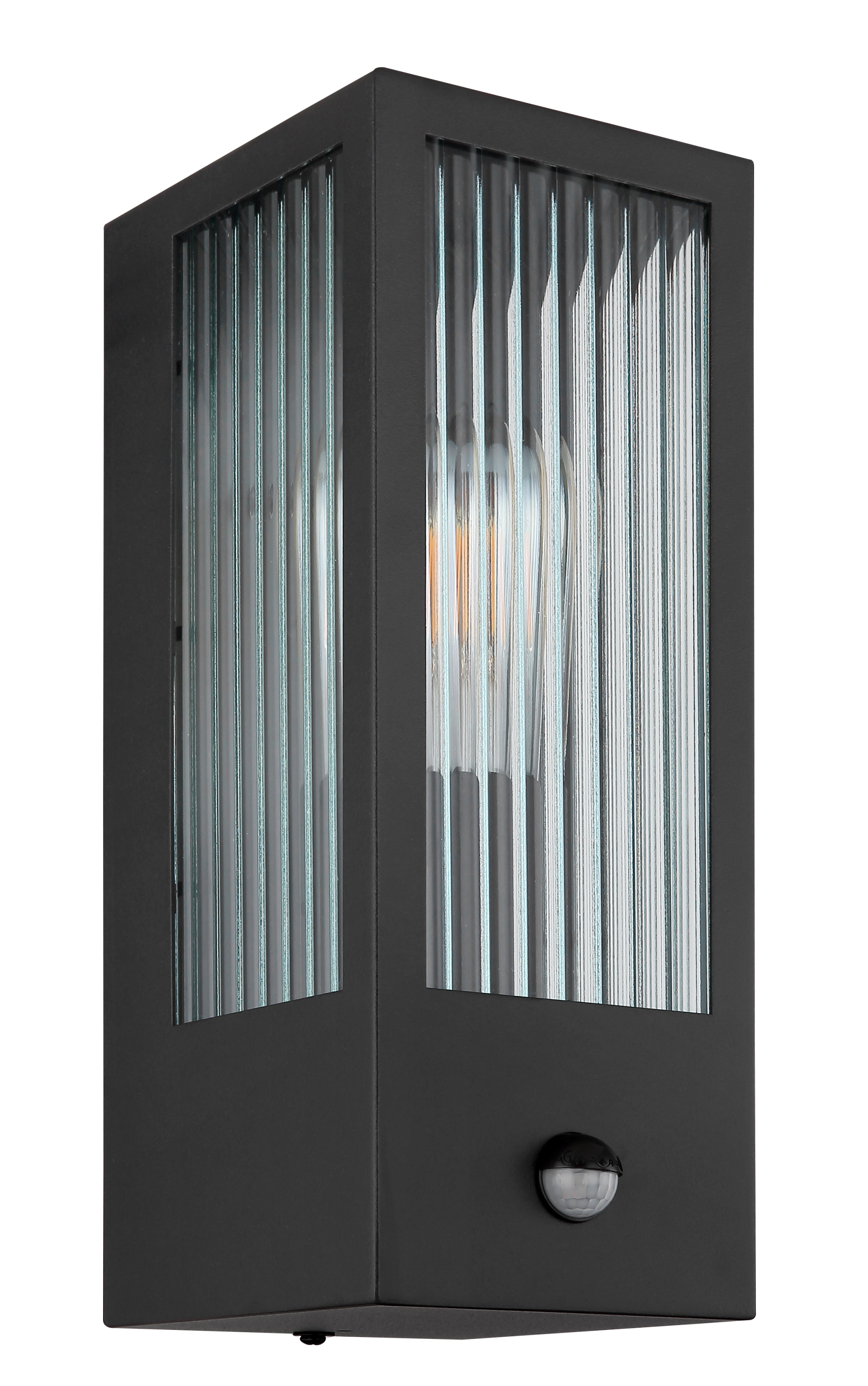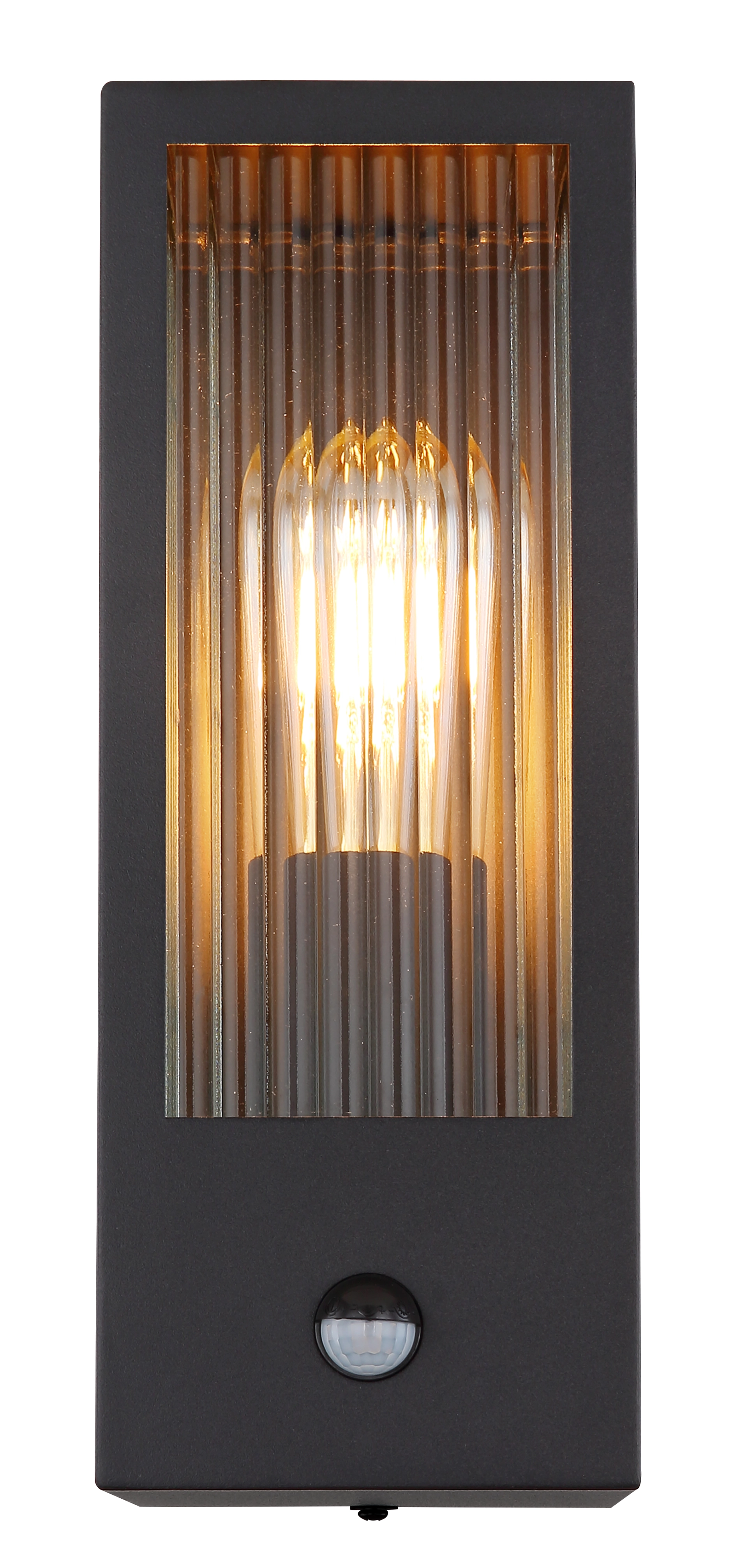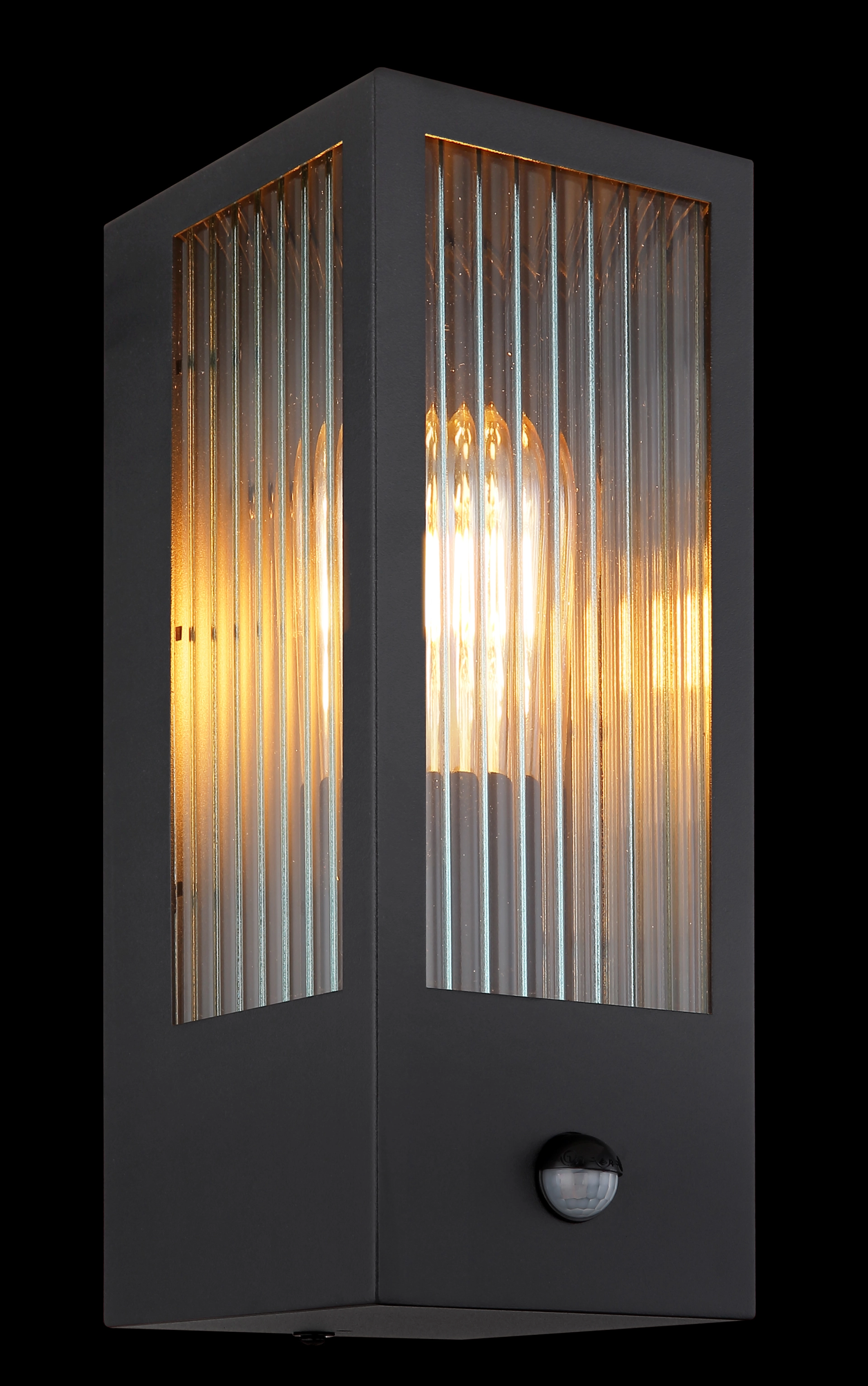This modern outdoor lamp convinces with its beautiful design made of glass and metal. The lamp in black consists of a rectangular metal cage (12x32cm) and a beautiful glass wall with decorations on each side. The E27 socket allows you to determine the light colour and brightness up to a maximum of 60 watts. Another highlight of this luminaire is the integrated sensor, which reacts at a range of 4-8 m and 110°. The IP44 degree of protection against splashing water ensures that the luminaire is installed outdoors.