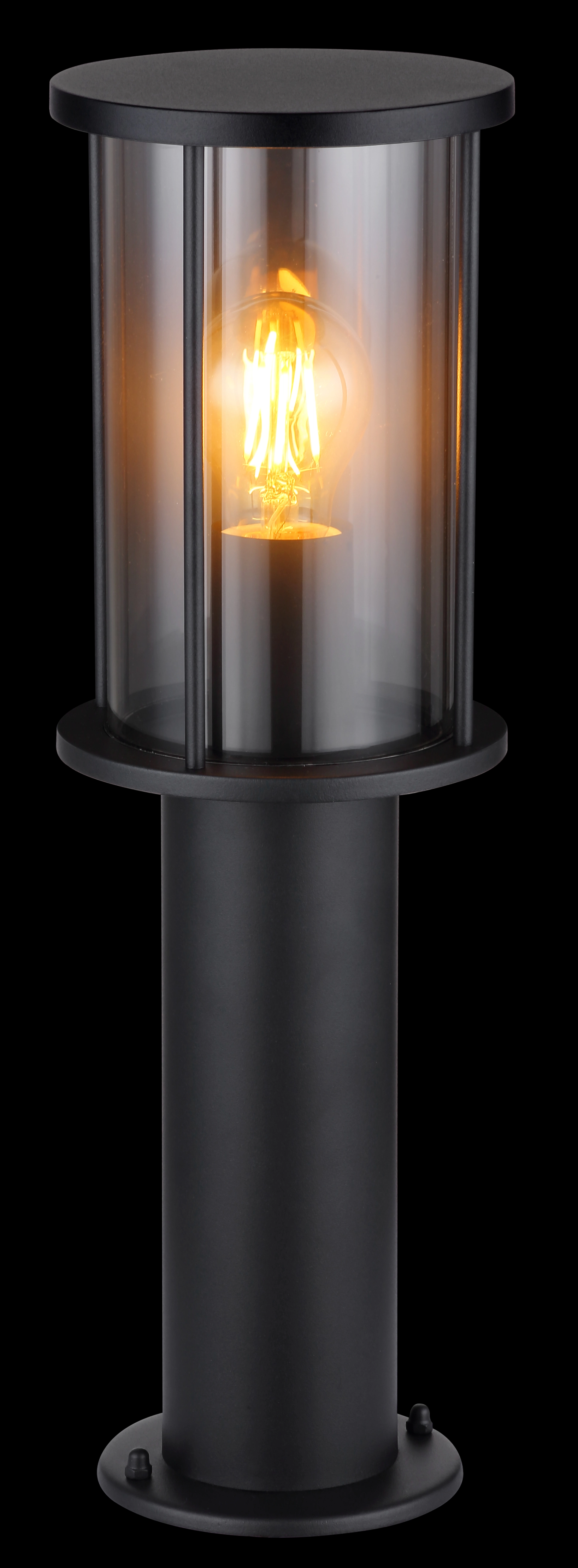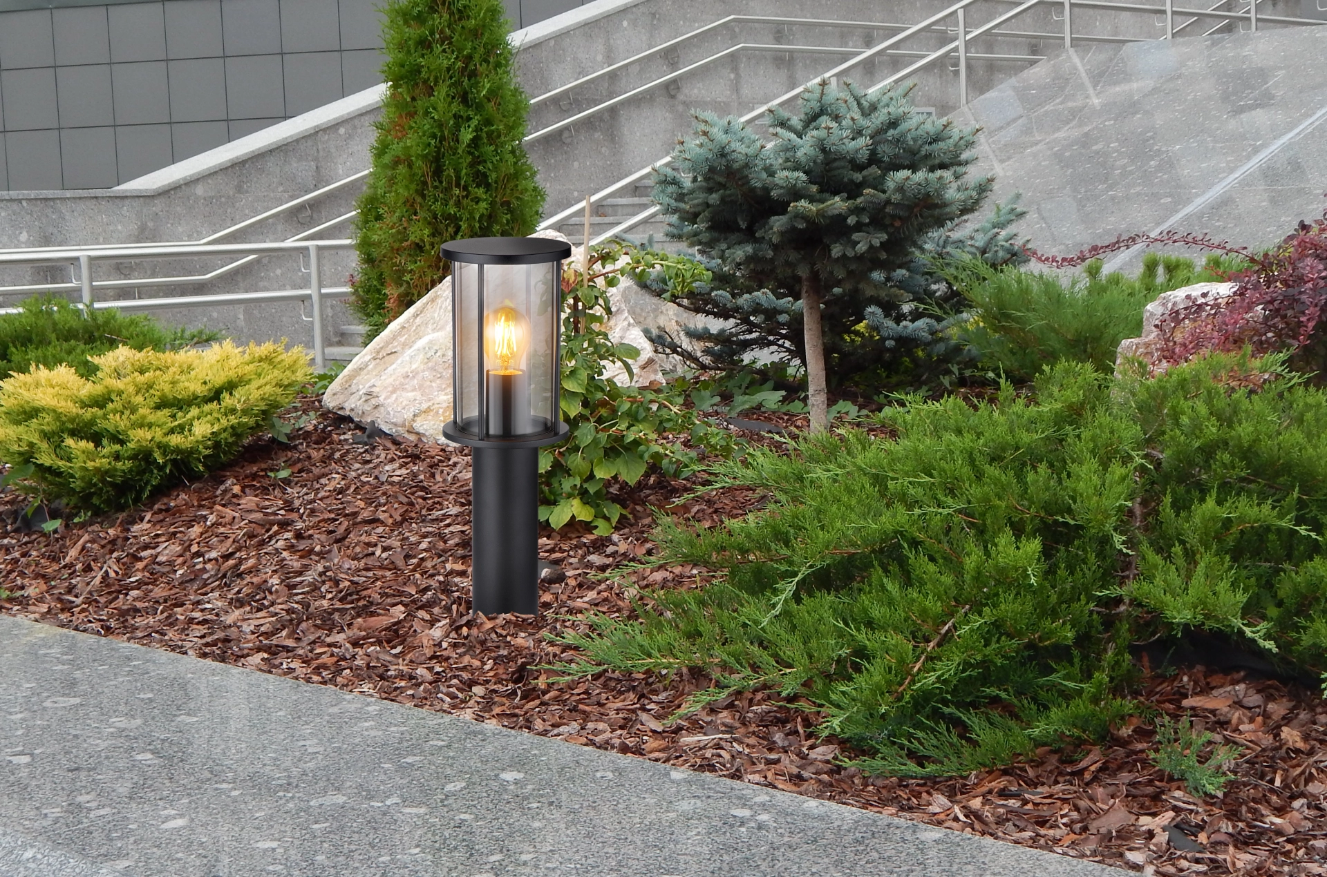 The outdoor lamp of the GRACEY series has a housing made of black matt stainless steel and a smoke-colored glass shade. The metal rods surrounding the shade are also matt black. The degree of protection of the luminaire is IP54. The dimensions of the lamp are ø143mm x H450mm. The lamp is intended for an E27 incandescent lamp with a maximum of 60W and 230V. This is not included in the scope of delivery and must be purchased separately.