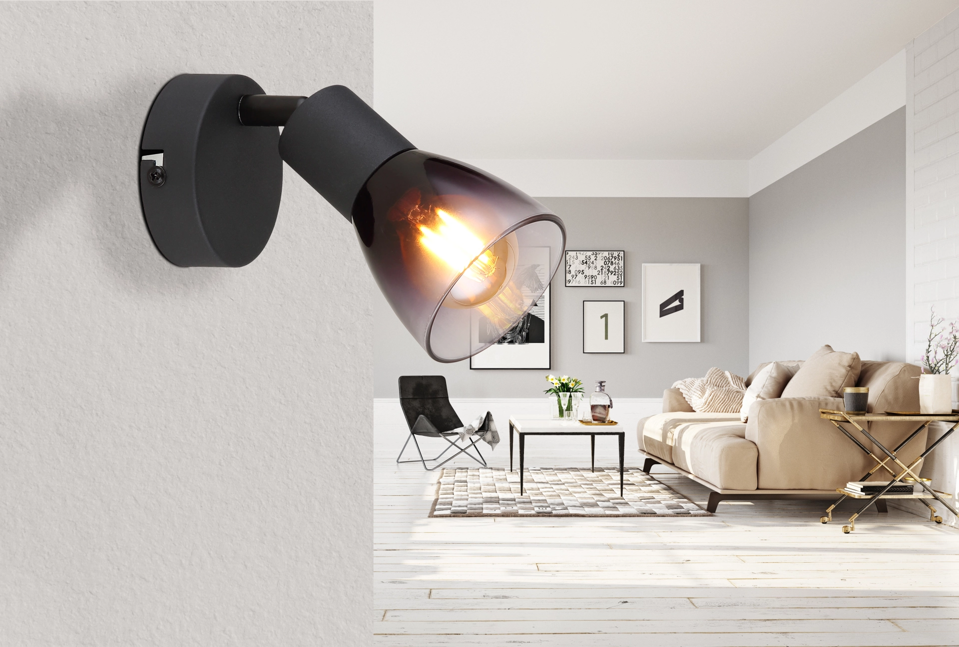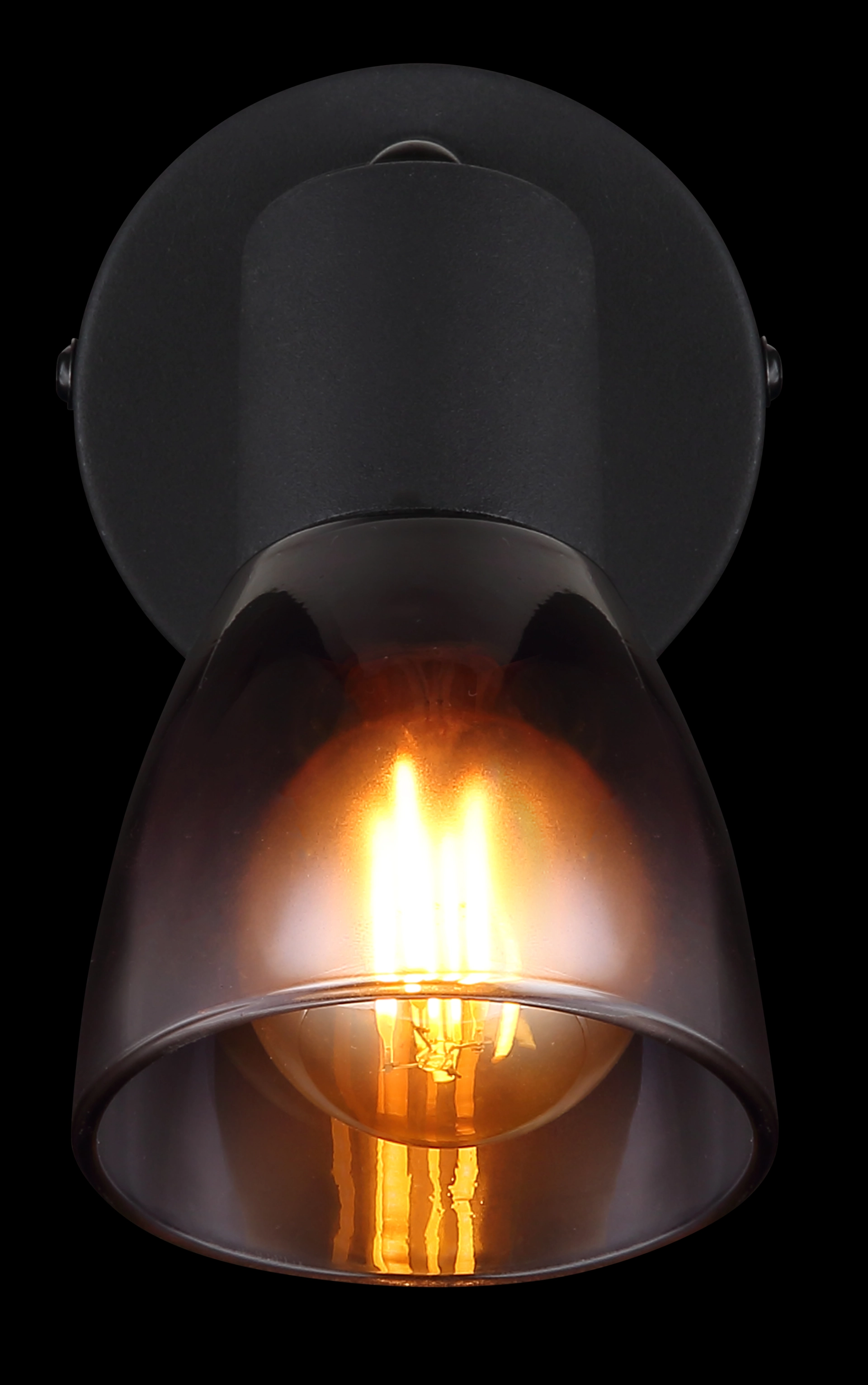 The elegant round wall sign with a body made of matt black metal and a clear smoke-coloured glass shade is a stylish option for lighting your home. Equipped with a single spotlight and an E14 socket, this wall sign offers enough space for an incandescent bulb with a power of up to 25W to create a warm and inviting glow. The black matt metal body gives the wall sign a modern touch, while the smoke-coloured glass shade provides a subtle and elegant diffusion of light. With its dimensions of 80mm width and 165mm height, this wall sign is ideal as a decorative element in hallways, bedrooms or living rooms and sets stylish accents with its timeless design. Bring pleasant and stylish lighting to your home with this round wall sign made of matt black metal and smoked glass.