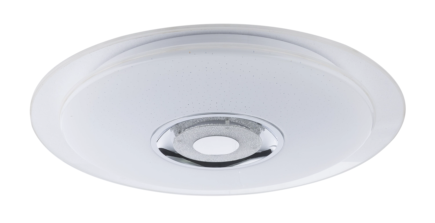 This classic round (Ø54cm) ceiling lamp SAJAMA I made of white acrylic with sparkle décor scores with performance and functionality. By means of the included remote control and the CCT function, the light color can be regulated and fixed in several stages between pleasant warm white 3000K and 6000K cold white light. With the included 30 watt LED bulb, this ceiling lamp provides a maximum of 2500 lumens of strong light, can be dimmed as desired and adapted to the respective situation. In addition, this lamp has a night light function and a memory function. This Smartlight lamp can be easily operated using the Tuya Smart App (Android TM/IOS). Voice control is uncomplicated with Amazon Echo Tm or Google Home.